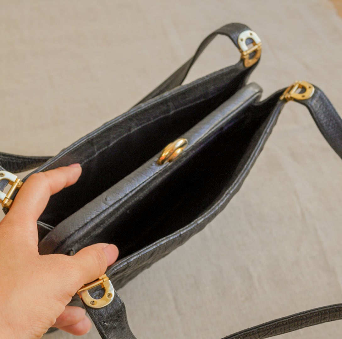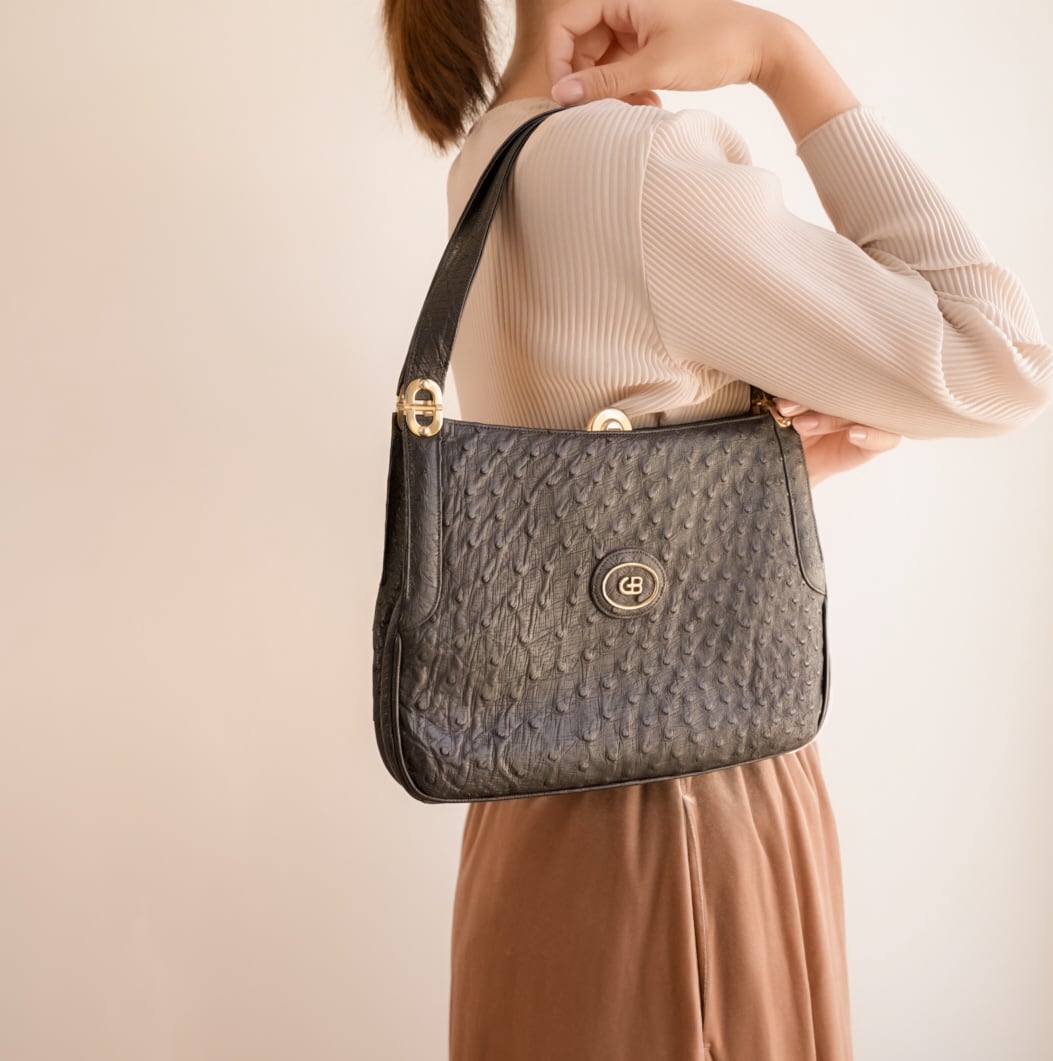 オーストリッチレザーの風合いが美しいヴィンテージハンドバッグ。マットなブラックトーンが都会的で洗練された印象を与え、どんなスタイルにもシックに溶け込むアイテムです。ゴールドメタルのディテールがアクセントとなり、エレガントさとモード感を併せ持つデザイン。内側の仕切りやポケットも使い勝手が良く、機能性と美しさを兼ね備えています。