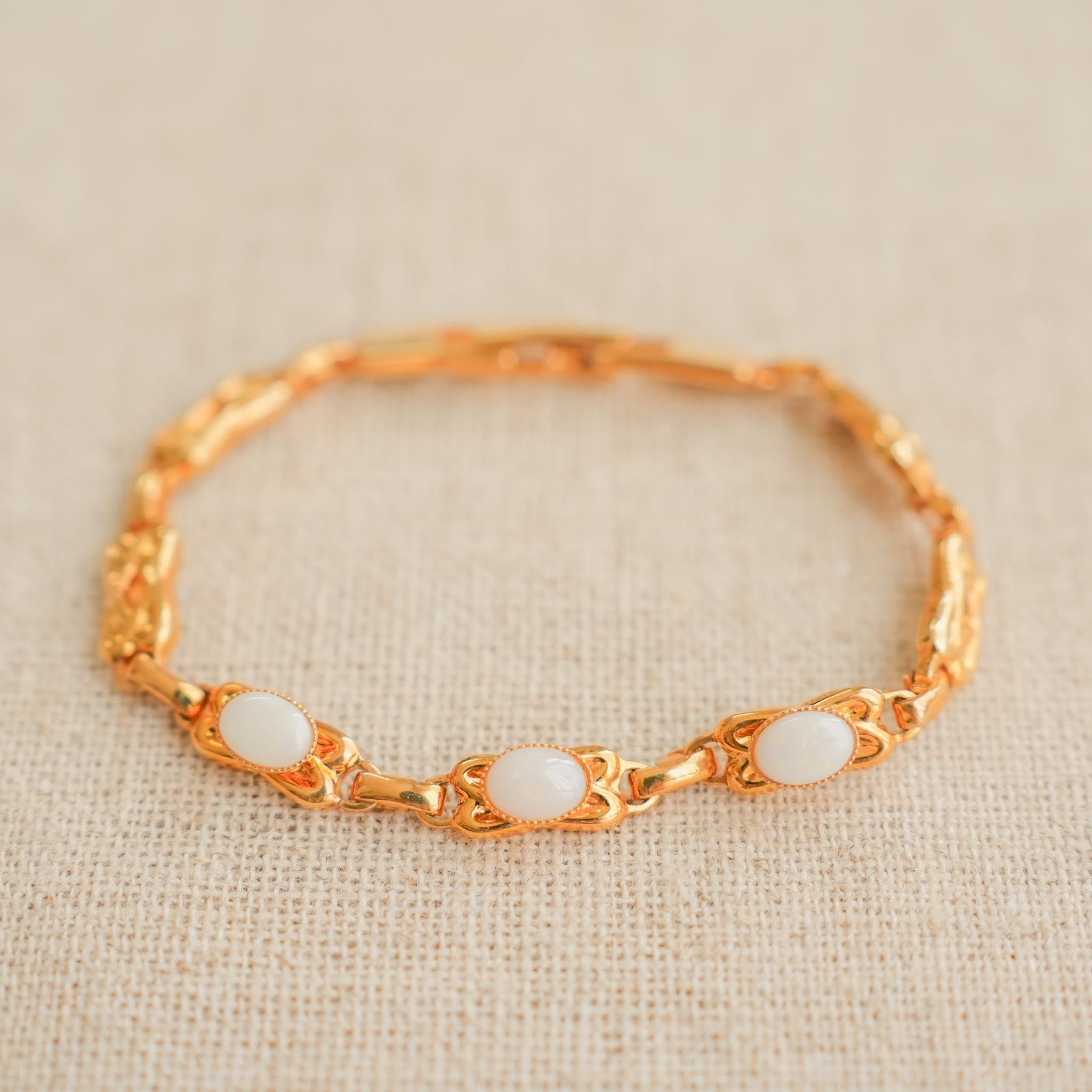 ブレスレットのゴールドトーンのチェーンは、細やかなテクスチャが施され、オパールの輝きを一層引き立てます。ゴールドとホワイトオパールのコントラストが絶妙で、華やかさと落ち着きを兼ね備えたデザインに仕上がっています。日常使いにも、特別なシーンにもふさわしいアイテム。控えめながらも印象的な輝きが、コーディネートに上品なアクセントを加え、時を超えた美しさを楽しむことができます。