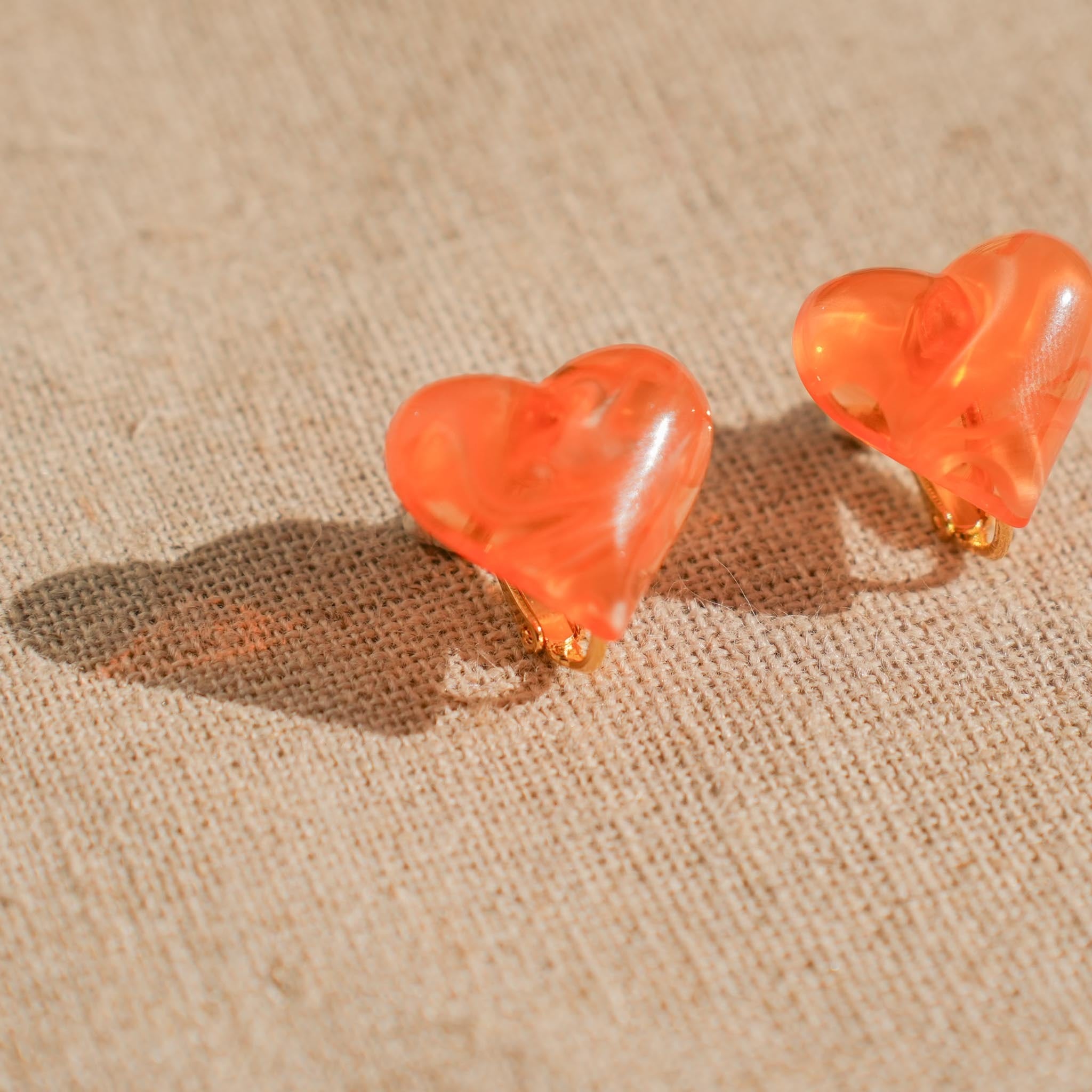 あざやかなオレンジ色のハートモチーフが特徴のヴィンテージイヤリング。透明感のあるオレンジが光を柔らかく透かし、まるでキャンディのような愛らしさを耳もとに添えます。明るい色合いと滑らかな質感が、日差しを受けるたびに独特の輝きを放ち、軽やかで爽やかな印象を与えます。