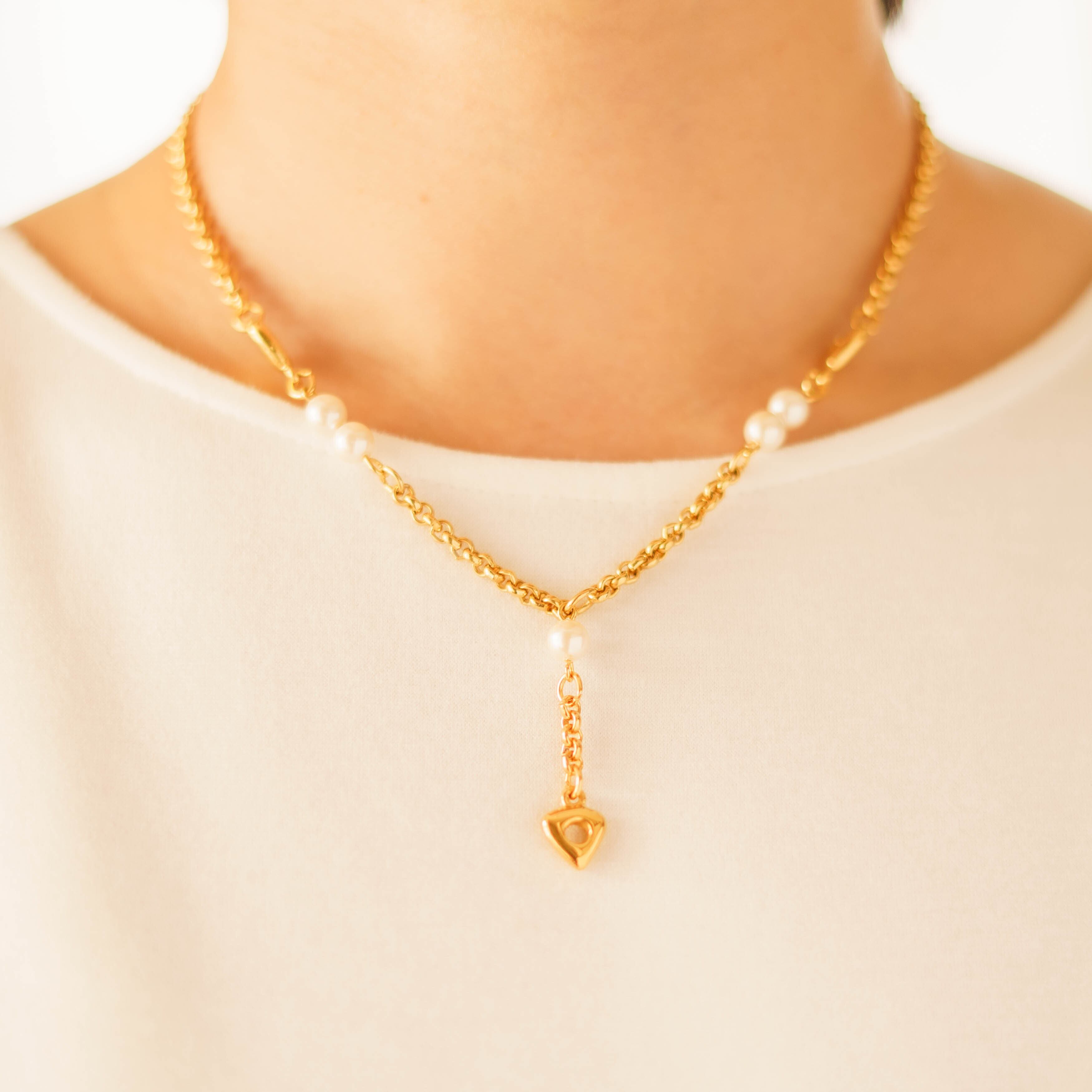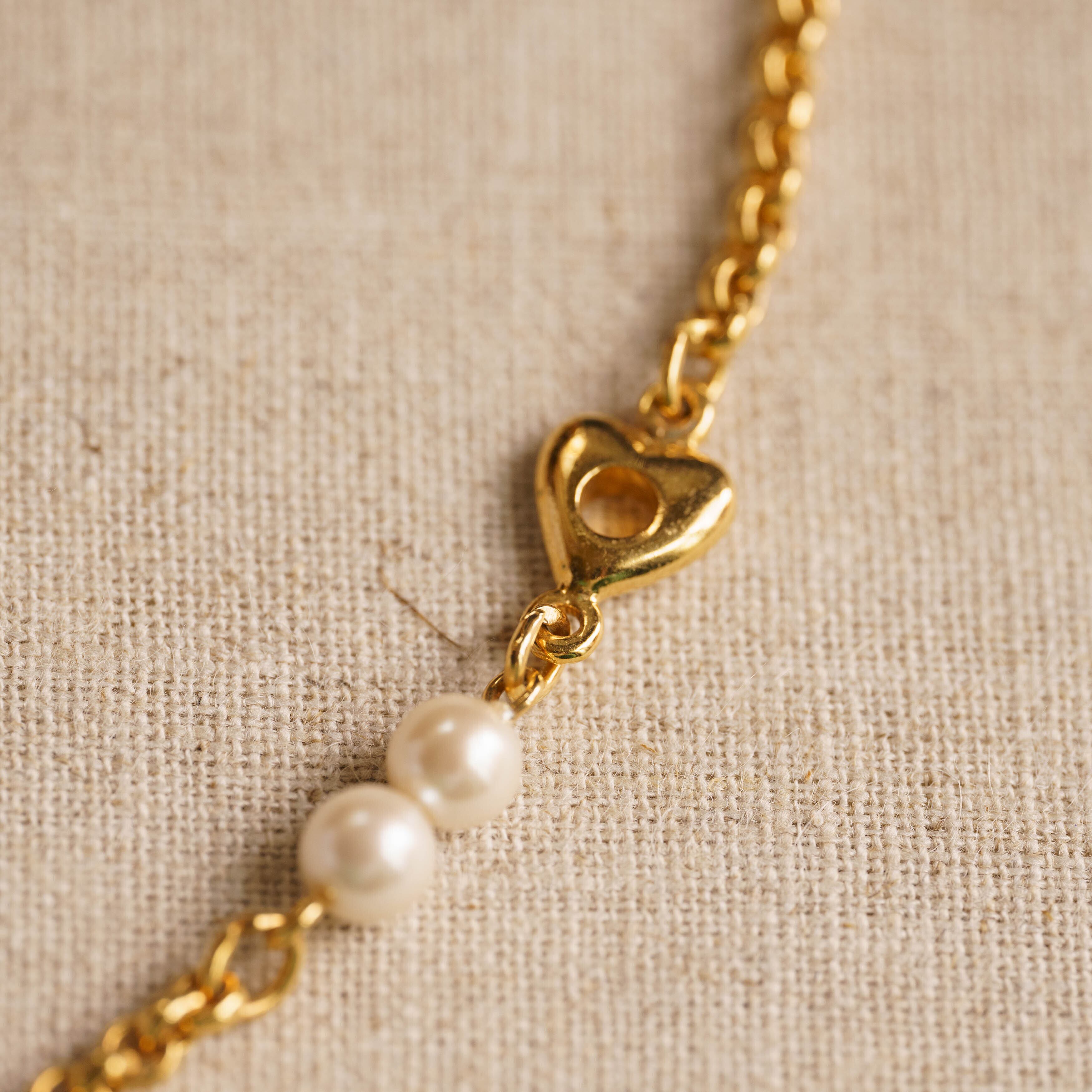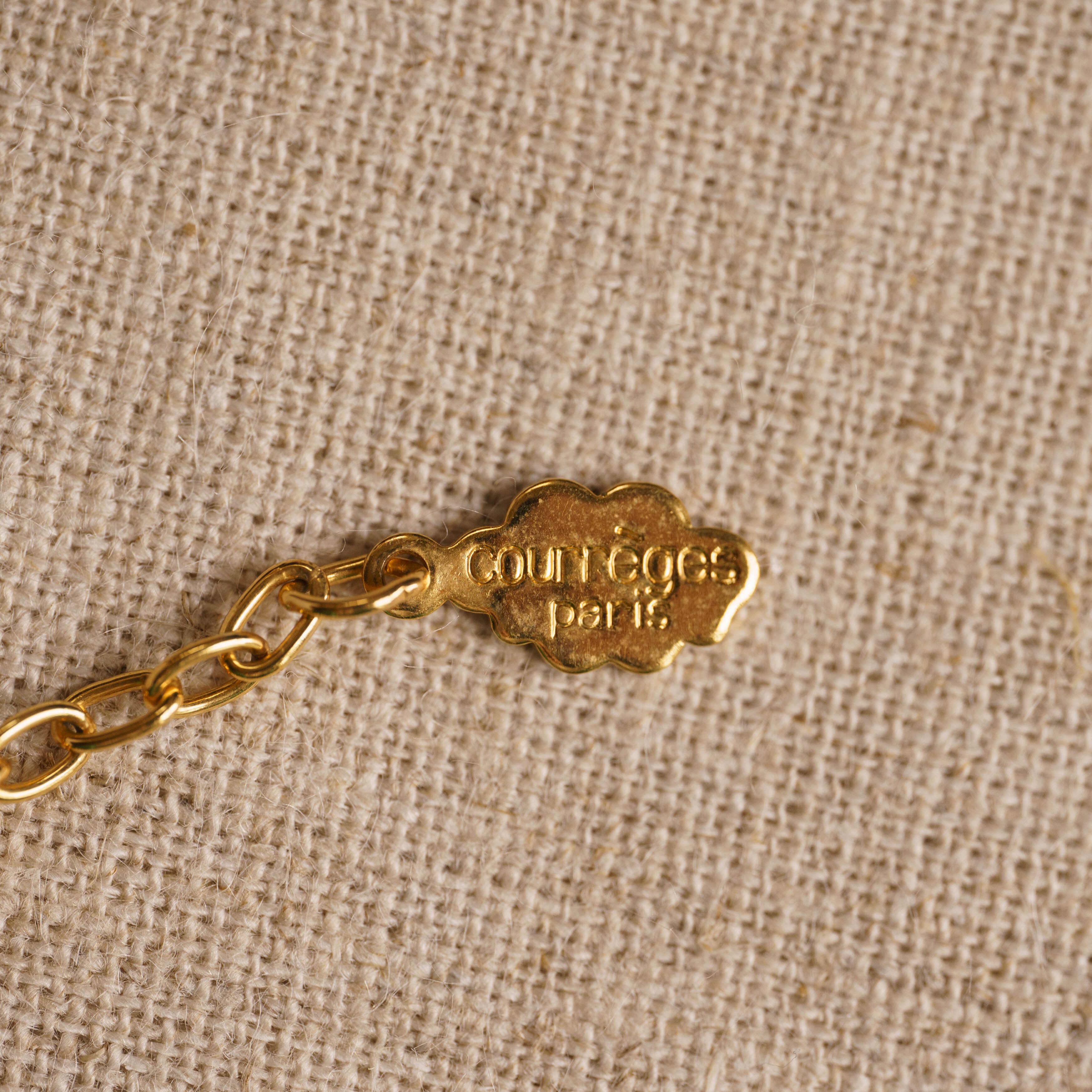 こちらのヴィンテージネックレスは、フランスの名門ブランド"Courreges"からの洗練された一品です。ゴールドのチェーンがシンプルながらも高級感を放ち、そこにあしらわれたパールの優しい輝きが品格を添えています。パールの素材感は柔らかく、光を柔らかに反射することで、首もとに繊細な美しさを演出。さらに、ハートモチーフのチャームがデザインに程よい甘さを加え、フェミニンで愛らしい雰囲気を醸し出します。