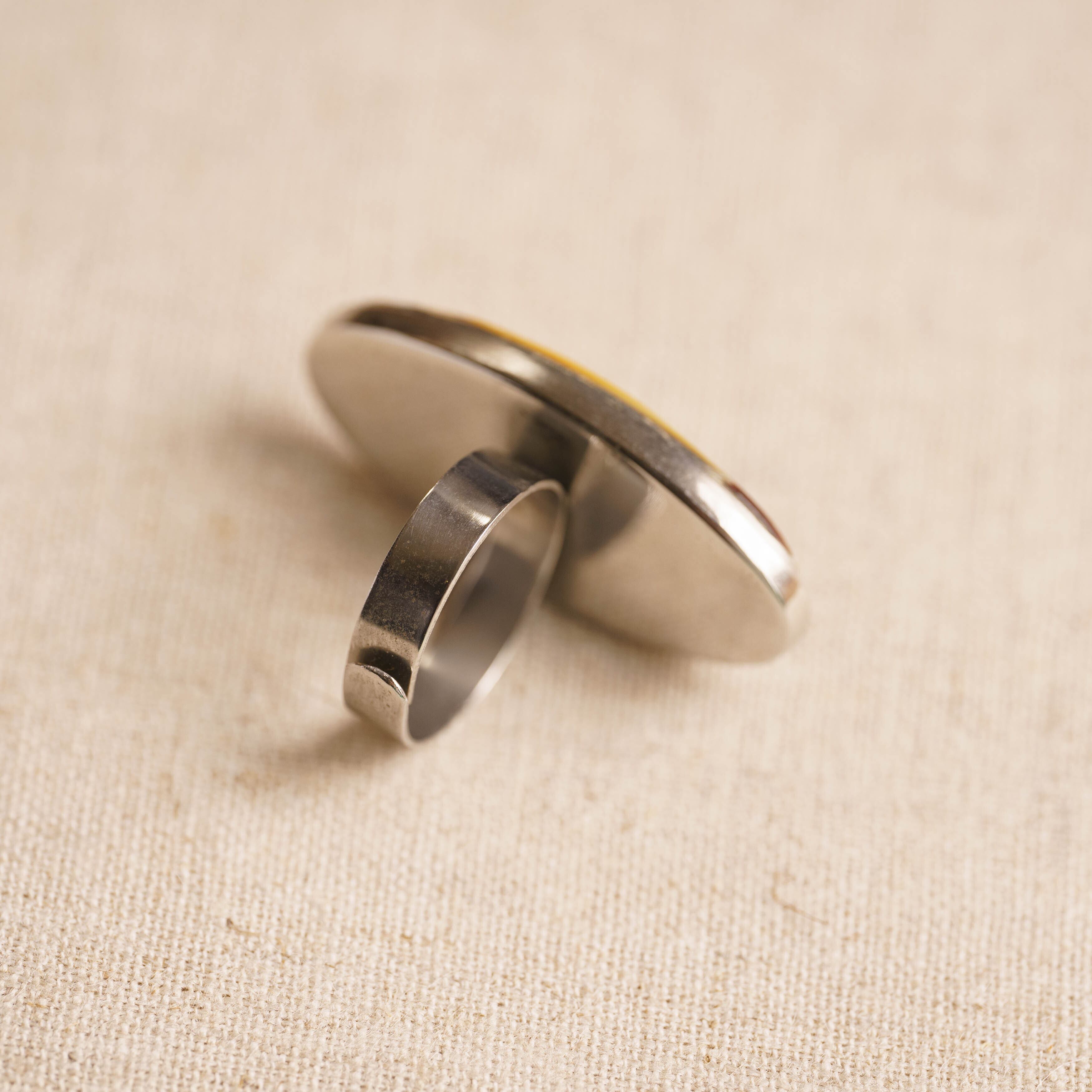 シェルの独特な素材感が魅力的なヴィンテージリング。光の加減によって微妙に変わるカラーパレットは、ベージュやブラウン、ゴールドの温かみある色合いが絶妙に混じり合い、自然の美しさを感じさせます。多少大ぶりのサイズ感が、指元にインパクトを与えつつ、シンプルなコーディネートにも存在感をプラスします。
