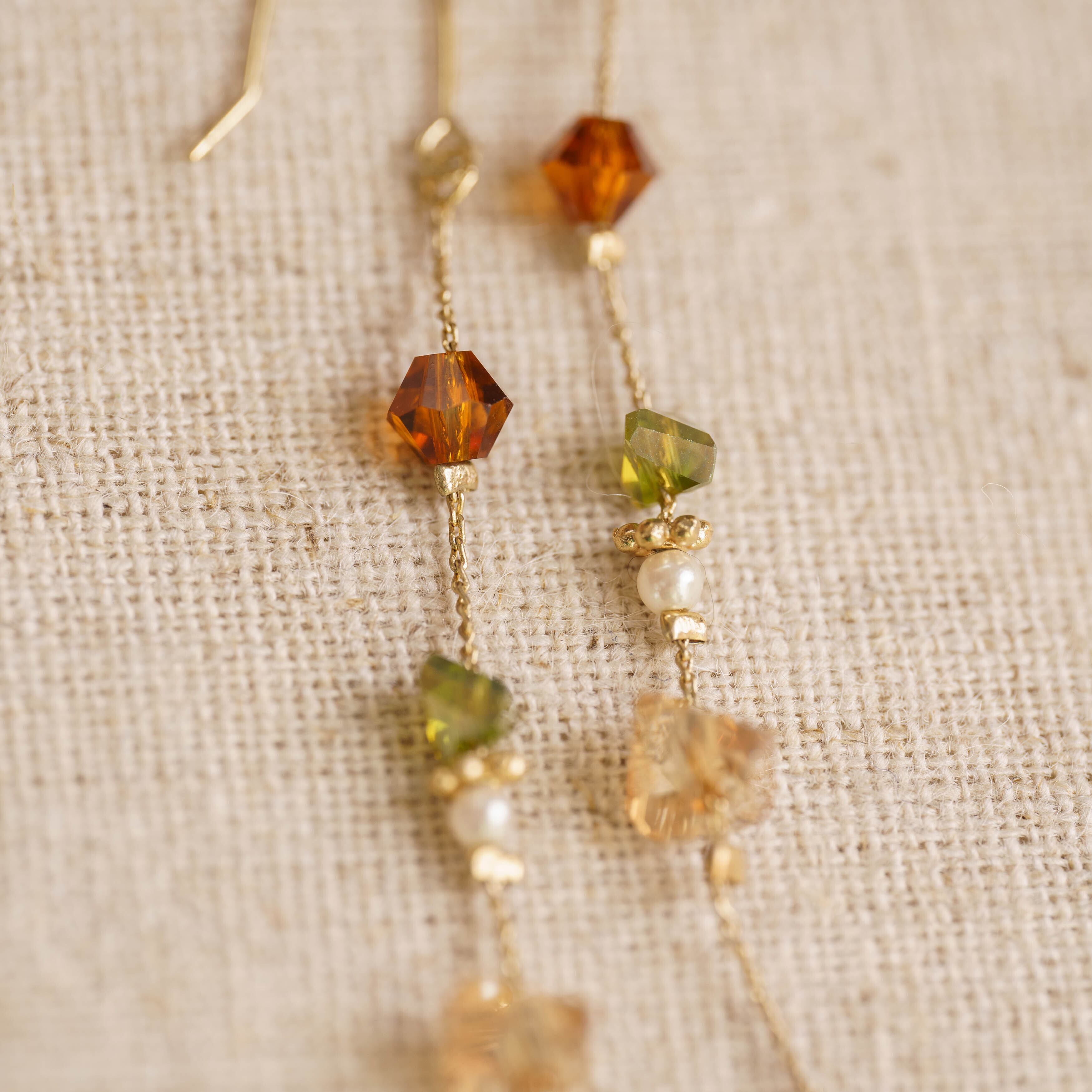 クリスタルの澄んだ透明感が光を受けて優雅にきらめき、ガーネットの深みのあるレッドが華やかさを添えます。グリーンストーンは、自然を感じさせる落ち着いた色合いで、全体のバランスを絶妙に保ちながら、ピアスにあざやかなアクセントを加えています。