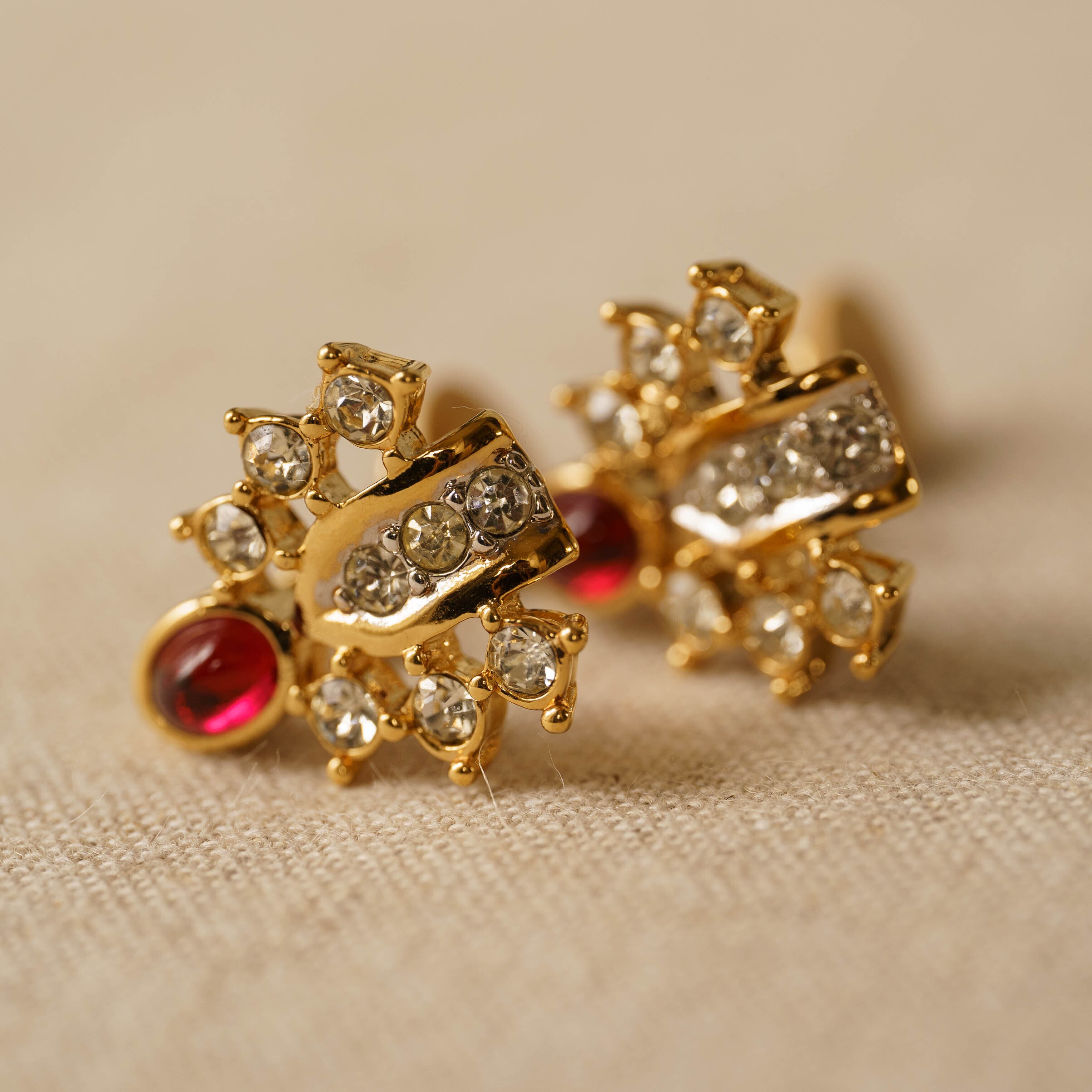 These vintage earrings are distinguished by their modern and abstract motif. The vivid red-toned glass detail stands out, while the delicate rhinestone accents provide a gentle sparkle, adding elegance. The vintage gold metal's warm, weighty texture contributes to a sophisticated and refined appearance.