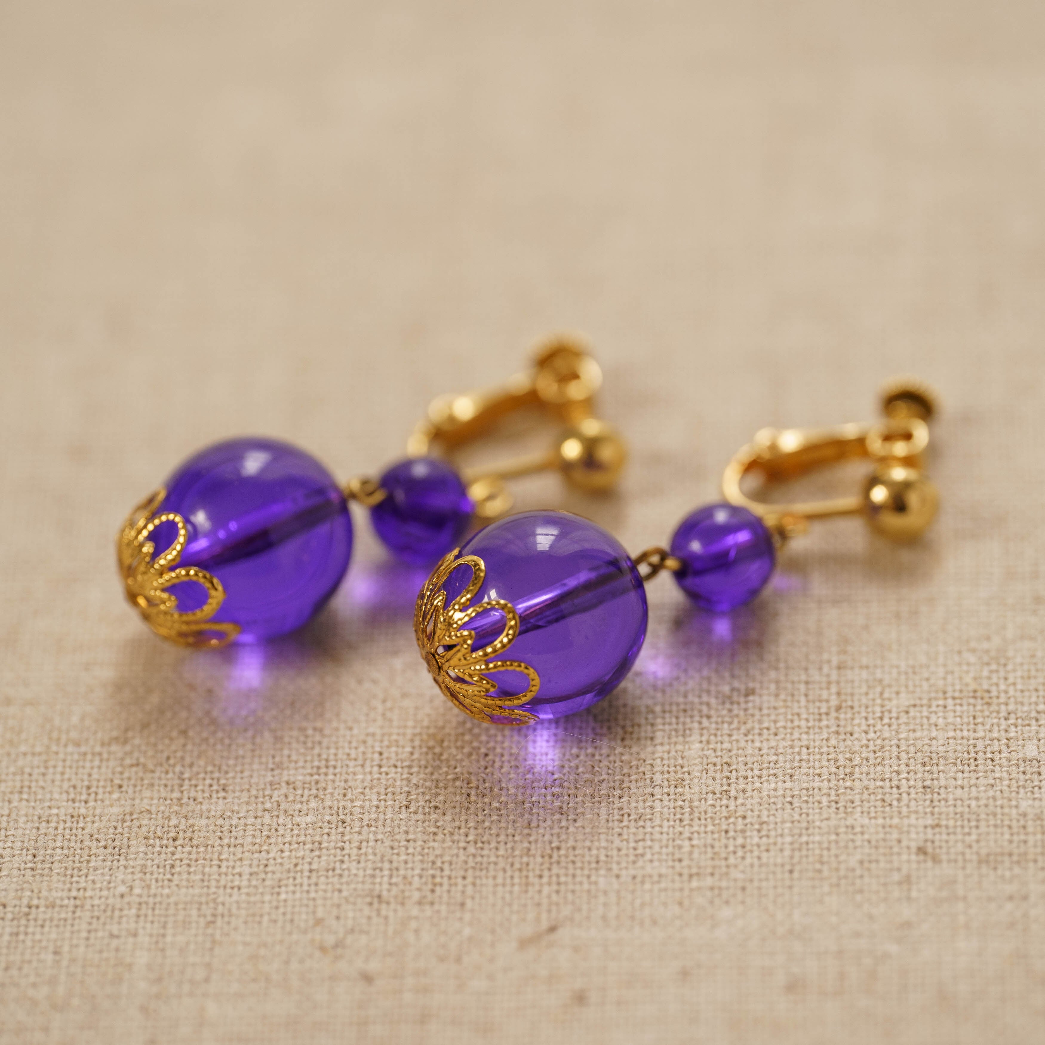 The carefully crafted violet-toned glass ball charms catch the light beautifully with each movement, exuding a captivating transparency. Delicate gold metal lace details enhance the elegance, adding an artistic touch to your ensemble. This vintage design, with its subdued hues and modern appeal, adds an air of sophistication to everyday attire. Pair with a feminine dress or a simple blouse for a stylish pop of color and charm.
