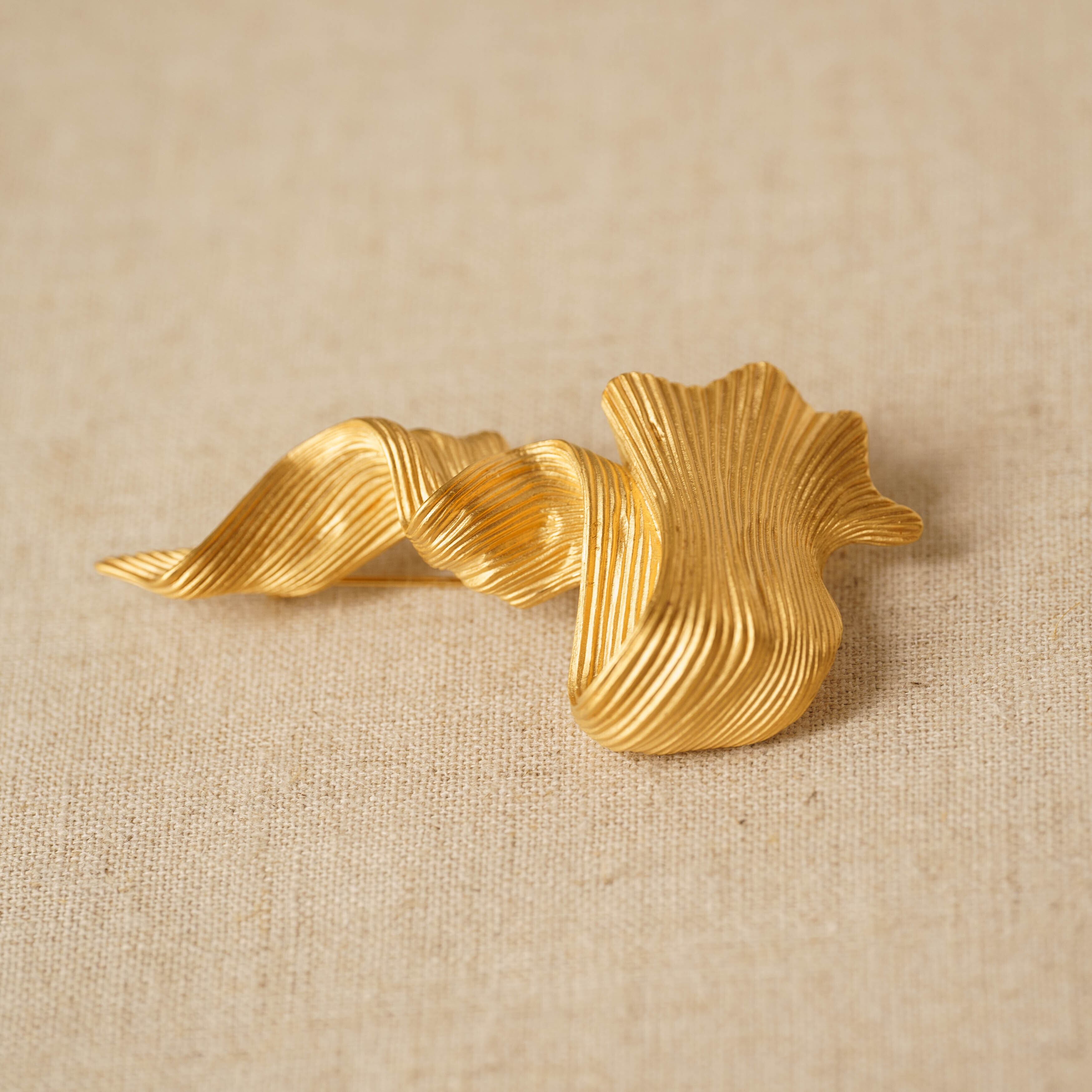 This vintage brooch features an abstract motif that exudes a sense of movement and bold elegance. The matte gold finish provides a subtle touch, creating a chic and artistic atmosphere. The vintage warmth and weight of the gold add depth and sophistication, making it a standout piece to elevate any outfit. Pair it with a simple knit or blouse for a refined, urban look that stands out with understated charm.
