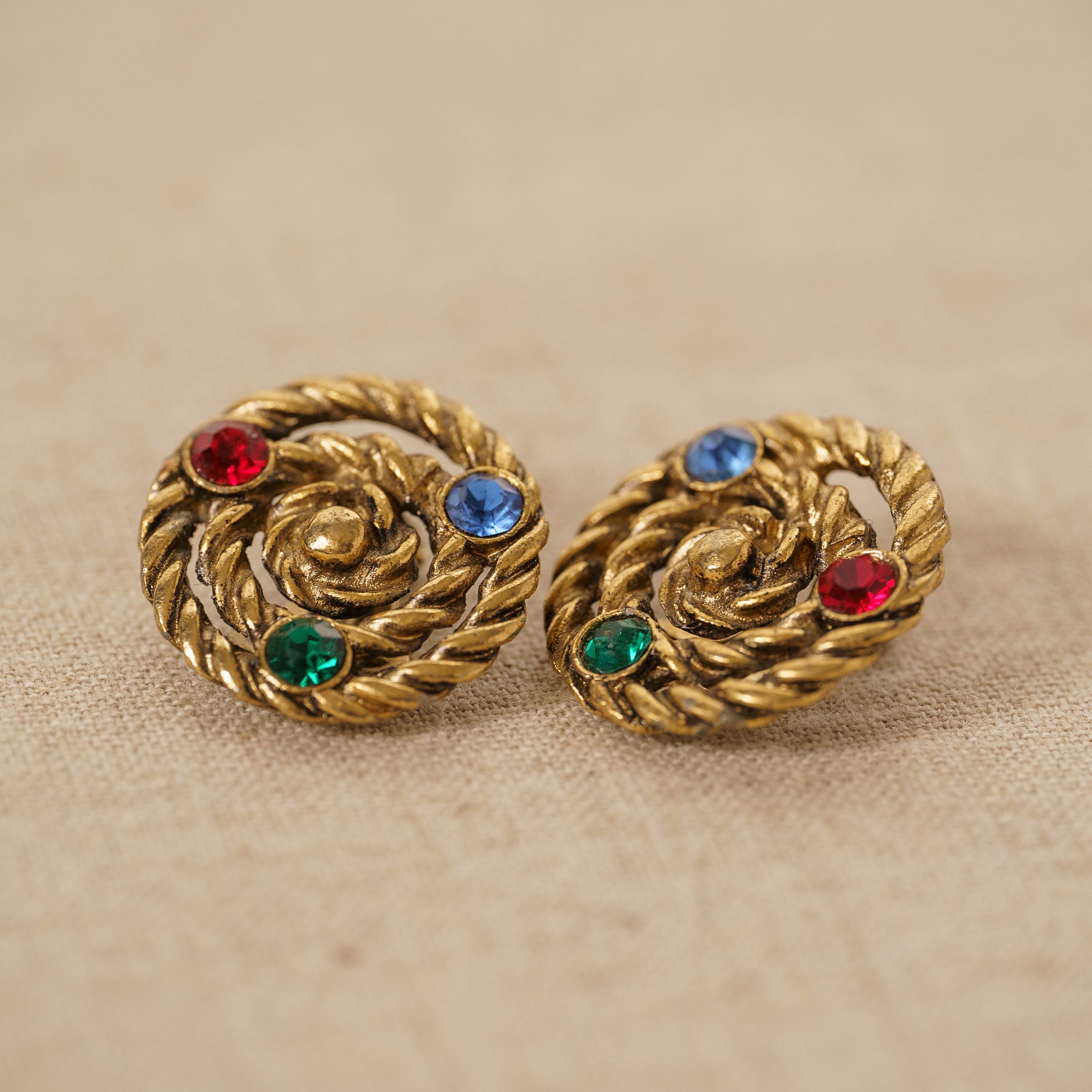These vintage earrings feature an abstract spiral motif accentuated with colorful rhinestone details, offering a playful and artistic touch. The warm vintage gold finish and substantial weight exude classic charm, while their gentle sway adds elegance. Pair them with a simple dress for a refined and modern statement that captures attention effortlessly.