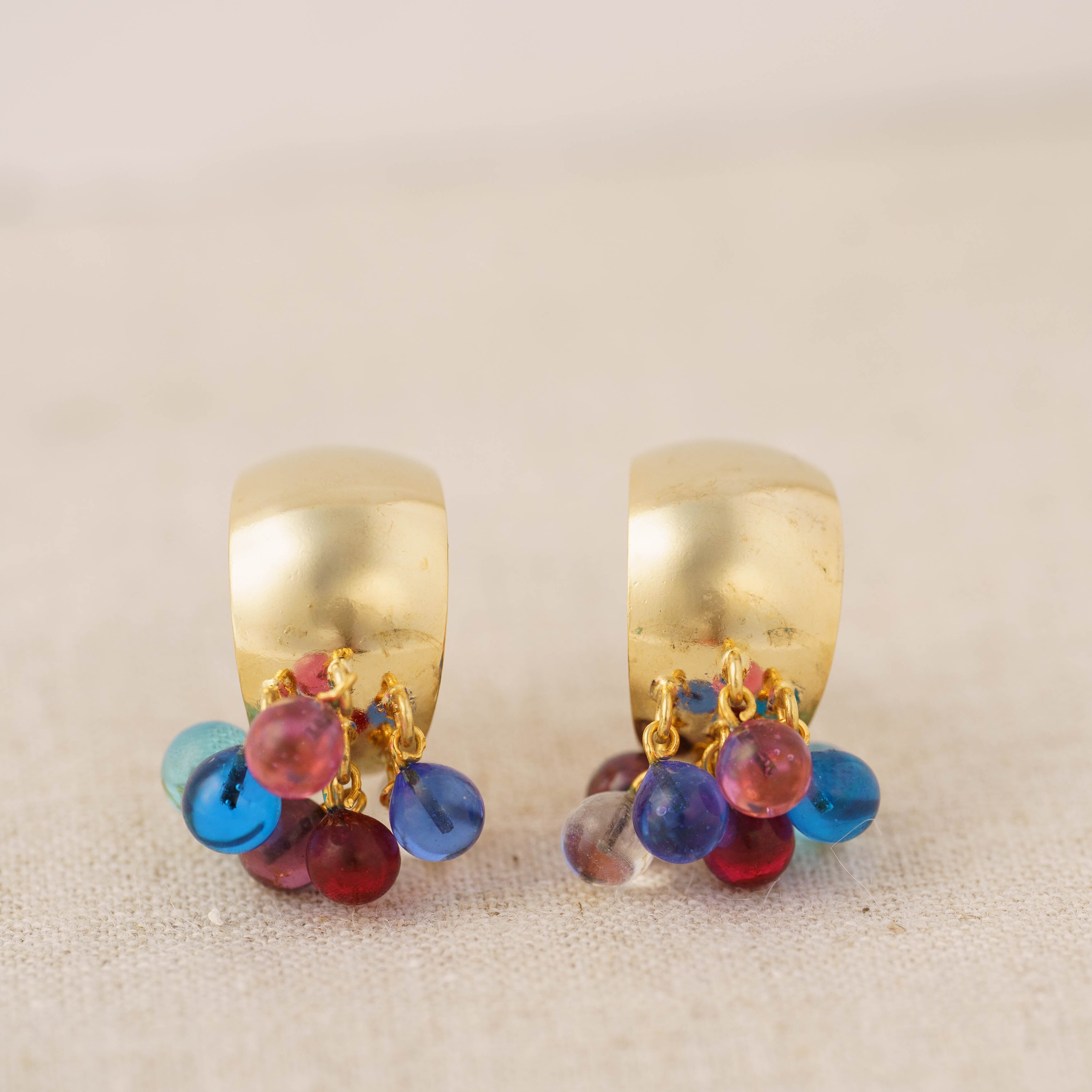 These vintage earrings feature a matte gold hoop adorned with beautiful glass beads, a classic design that captivates with elegance. The warmth and weight of vintage gold metal impart an air of timelessness, enhancing any attire with a touch of elegance.