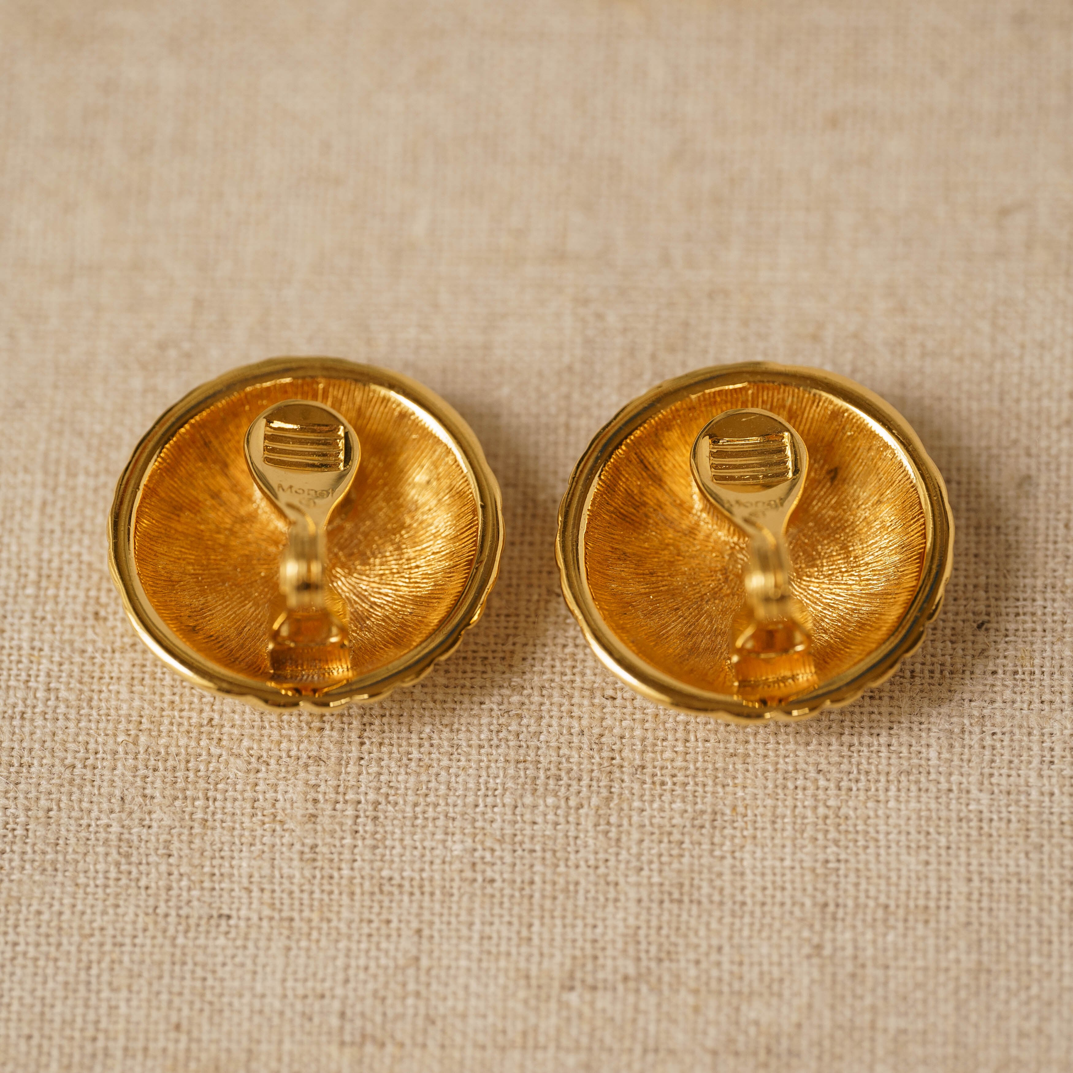 These vintage earrings feature a sleek and edgy circular motif that enhances a contemporary look. The warmth of gold metal combined with the distinctive weight of vintage jewelry adds a touch of sophistication to your ensemble. Perfect for subtly elevating everyday outfits or enriching monochromatic styles, they complement various fashion expressions effortlessly.