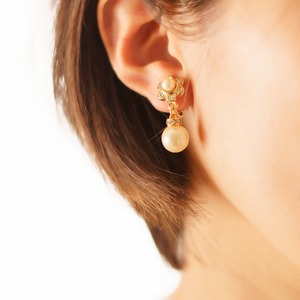 ポップなフローラルモチーフが施され、垂れ下がるパールチャームが動くたびに上品に揺れるヴィンテージイヤリング。極小のラインストーンが光をキャッチし、やさしいきらめきをプラスしています。クラシカルで華やかなデザインが顔まわりをエレガントに演出し、ゴールドメタルのあたたかみとヴィンテージジュエリーならではの重厚感が魅力です。シンプルなドレスやブラウスに合わせて、ワンポイントで個性を際立たせるコーディネートがおすすめです。