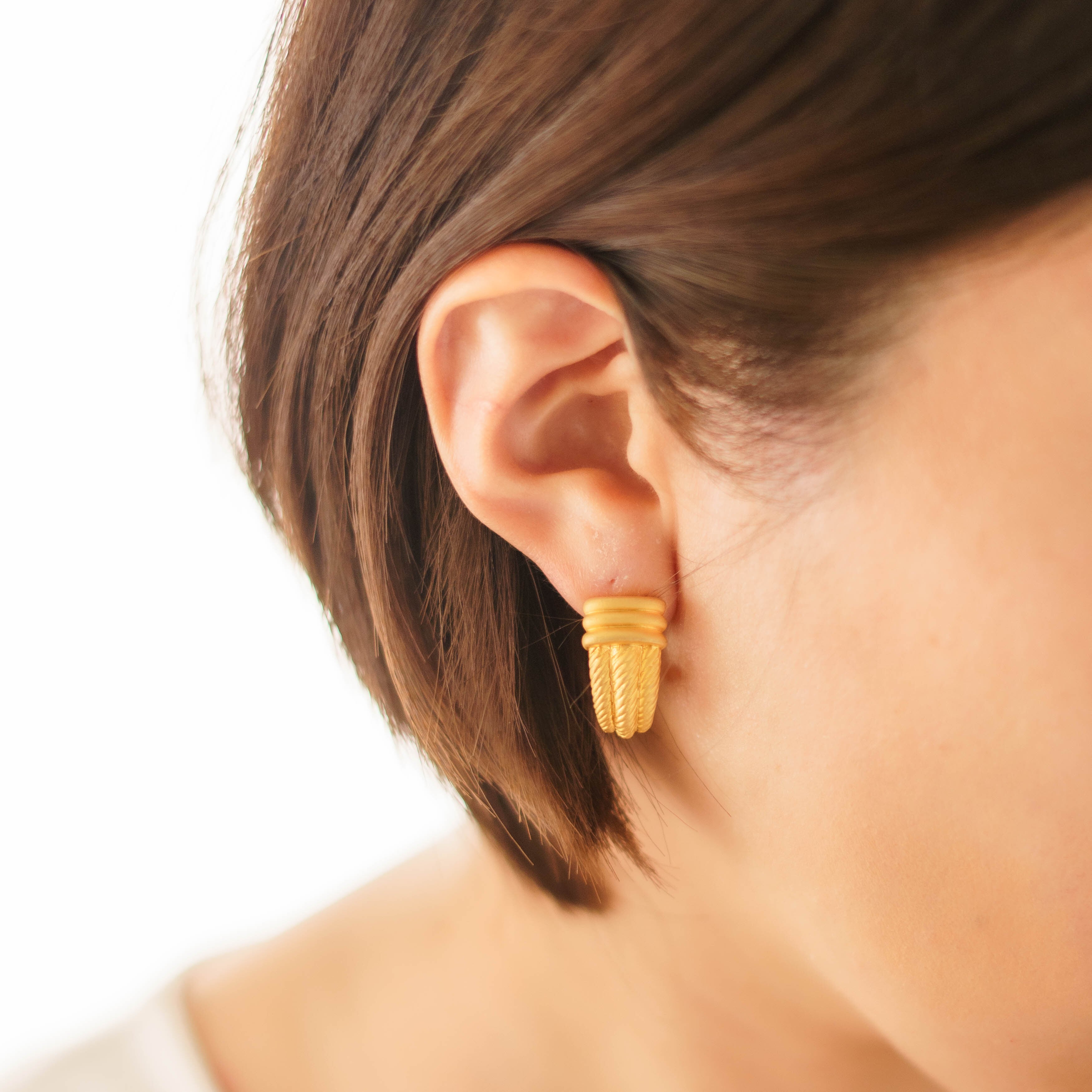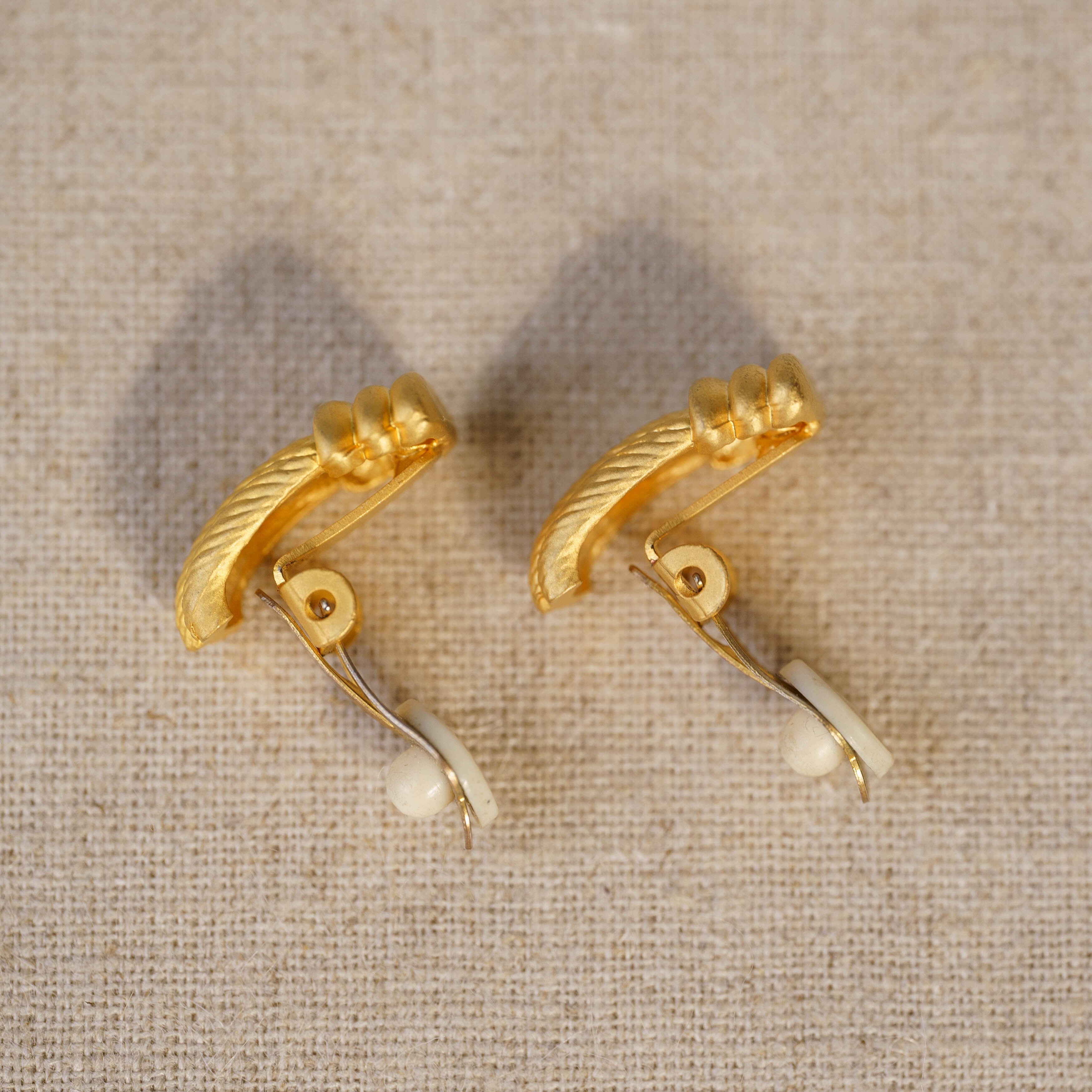 These vintage earrings feature an abstract and artistic design that highlights a modern edge. The matte gold finish exudes warmth, gracefully accentuating your features. The substantial weight typical of vintage jewelry adds depth and character to your ensemble. The artistic form effortlessly elevates simple outfits into refined and chic city looks. Pair with a plain knit or blouse for an impactful statement piece that turns heads.