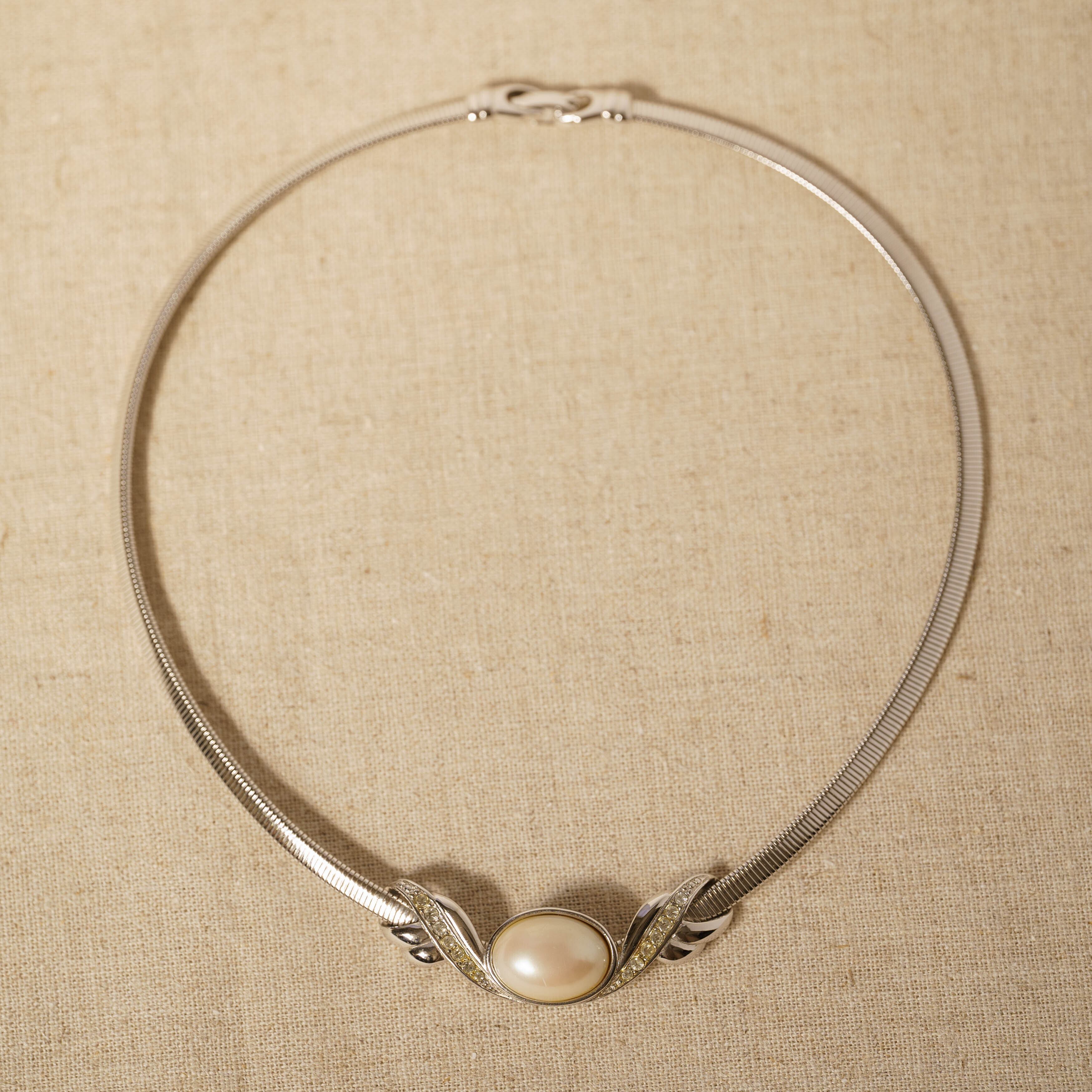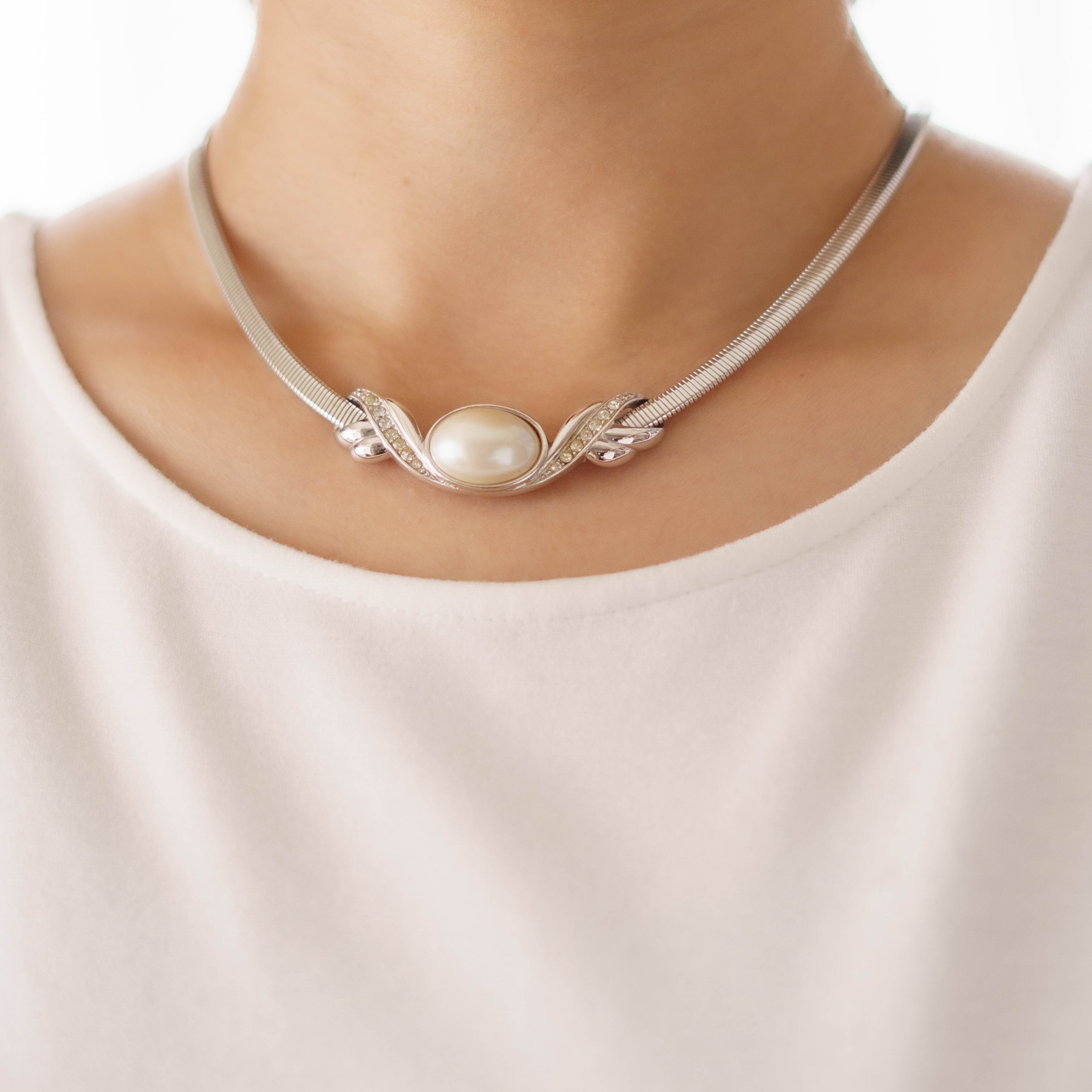 アール・ヌーヴォーによせたデザインが特徴のMonetのヴィンテージチョーカーネックレス。Monetは丁寧なメタルワークと細部へのこだわりで知られており、シルバーの無骨でありながら洗練された素材感と、パールのセンターモチーフが織りなす絶妙なハーモニーは、顔まわりを上品に引き立てます。ラインストーンがさりげなくきらめき、ヴィンテージジュエリーならではの重厚感と気品を添えています。シンプルなトップスやドレスに合わせることで、程よい華やかさと個性を加えるアクセントピースとして活躍します。