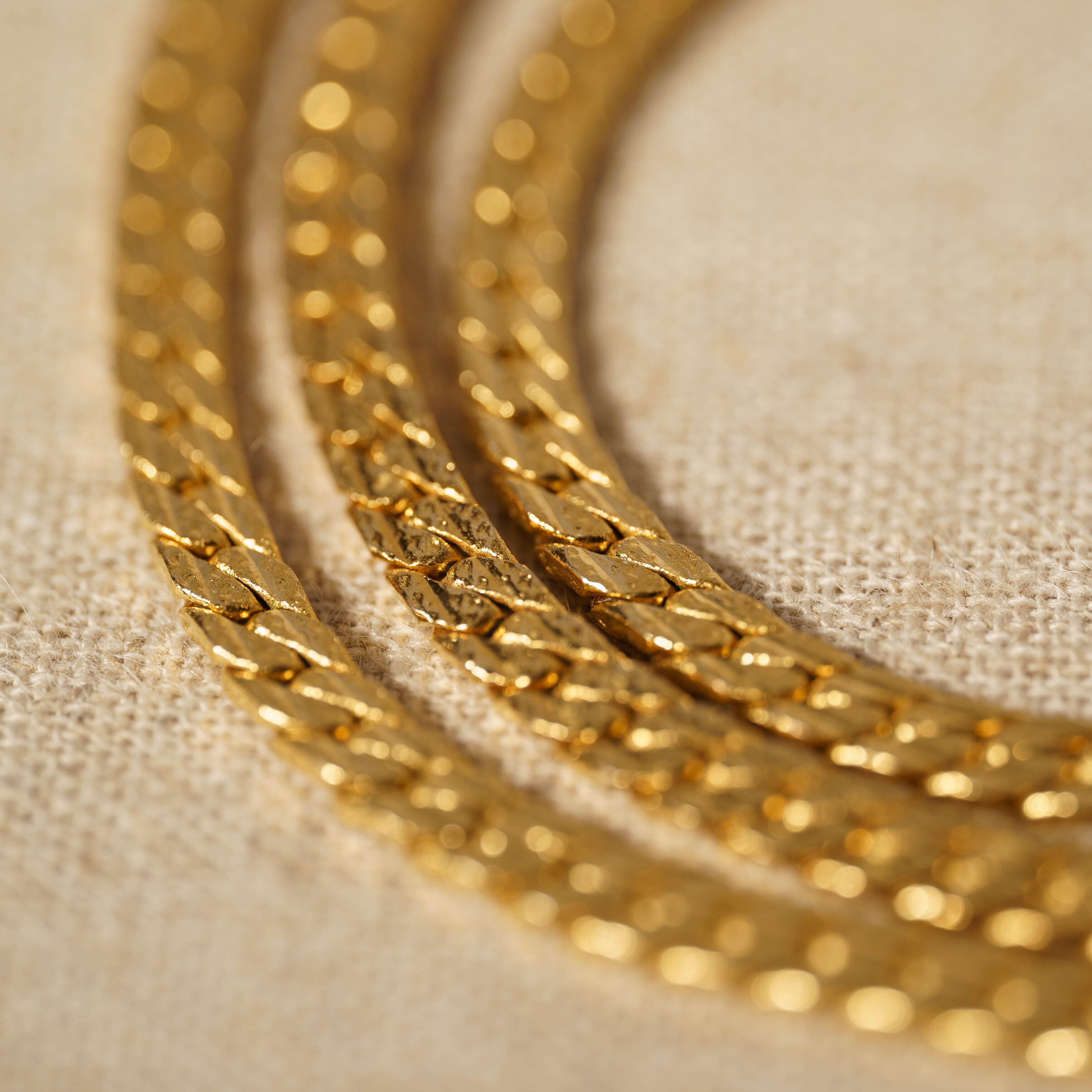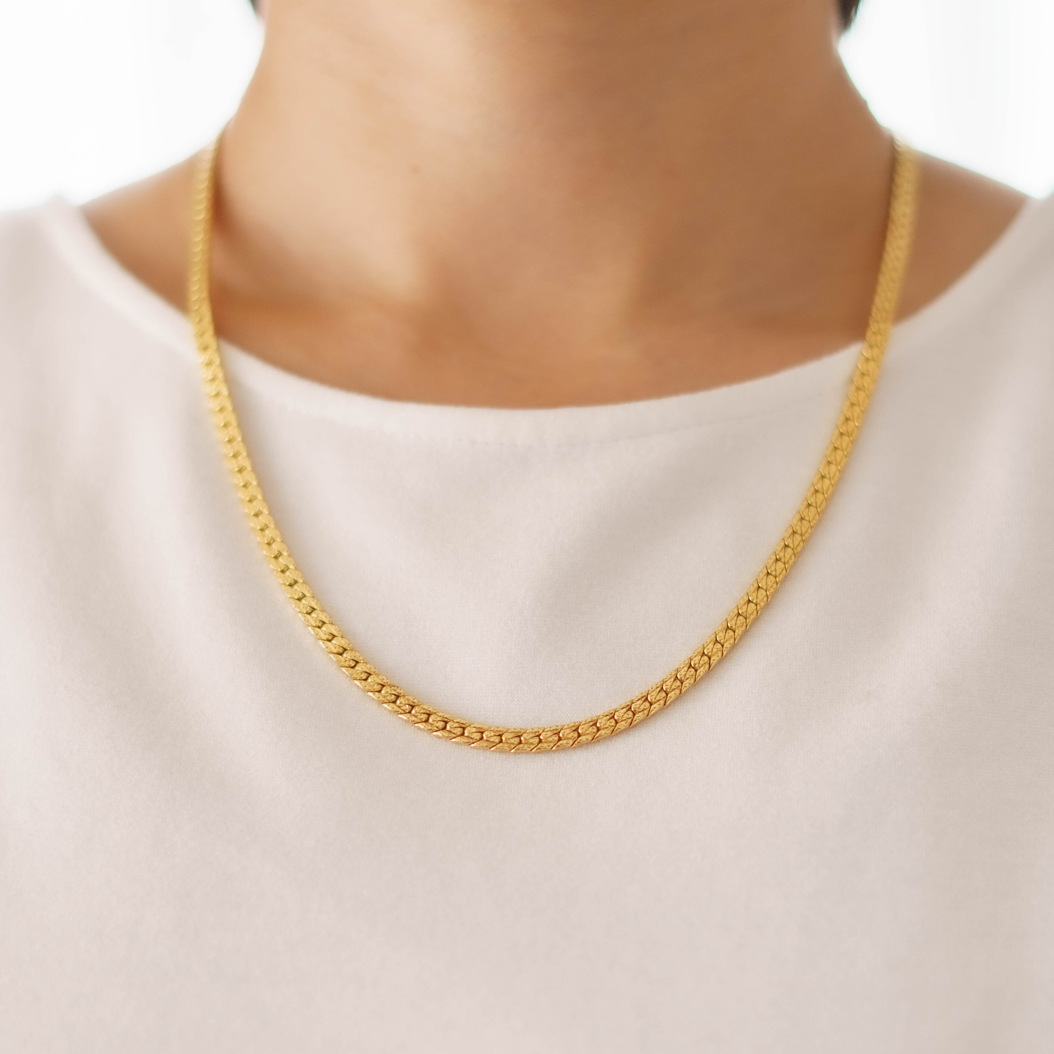 A vintage necklace that stands out with its minimalistic and elegant chain design. The warm and substantial presence of gold metal perfectly complements a refined style. The simple yet luxurious design is versatile, making it suitable for both daily wear and formal occasions. This piece adds a touch of elegance to the neckline, enhancing any outfit with its timeless charm.