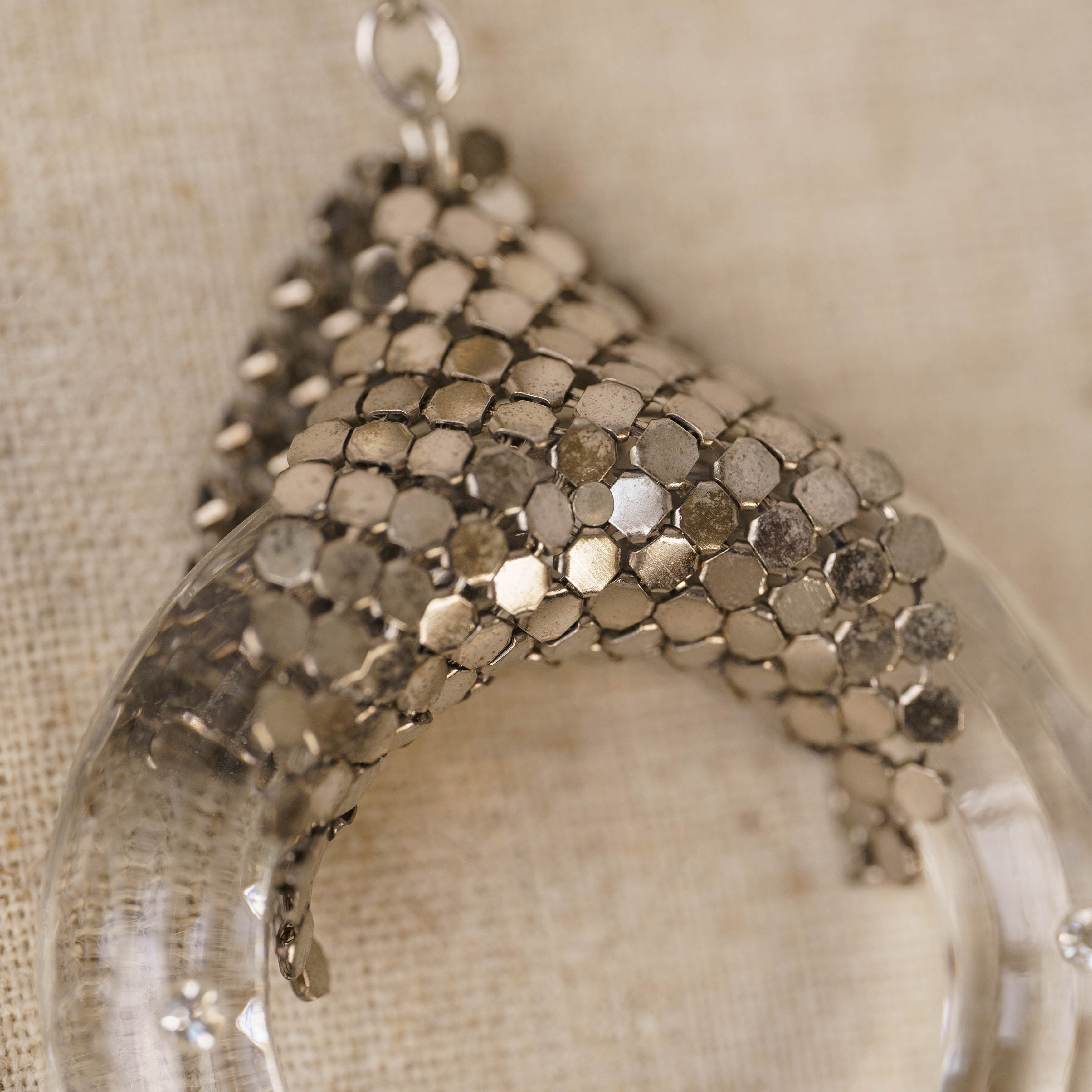 These vintage earrings exude a stylish and edgy vibe. Featuring intricate silver metal mesh details, they showcase a warm, vintage allure with a solid presence. The transparent glass charm adds an elegant gleam as it catches the light and moves gracefully. Pair them with minimalist monochrome outfits to add a touch of refined sophistication.
