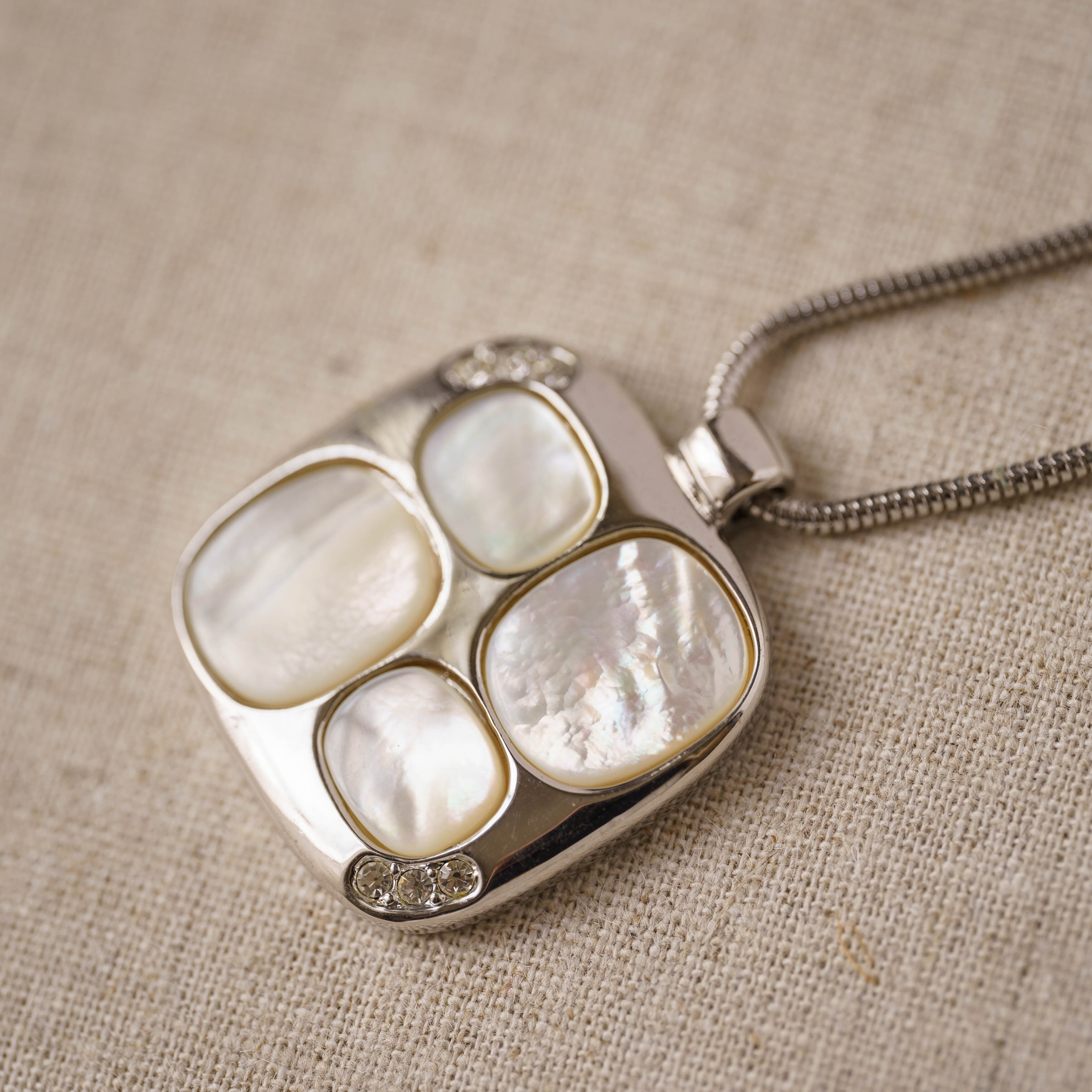 This vintage pendant necklace showcases carefully crafted mother-of-pearl, emanating an elegant aurora tone. The abstract design offers a modern and urban touch, complemented by the playful sparkle of tiny rhinestones. The handsome silver tone enhances the unique weight and elegance that only vintage jewelry possesses. Pair it with a simple dress or monochrome outfit for an effortlessly refined look.
