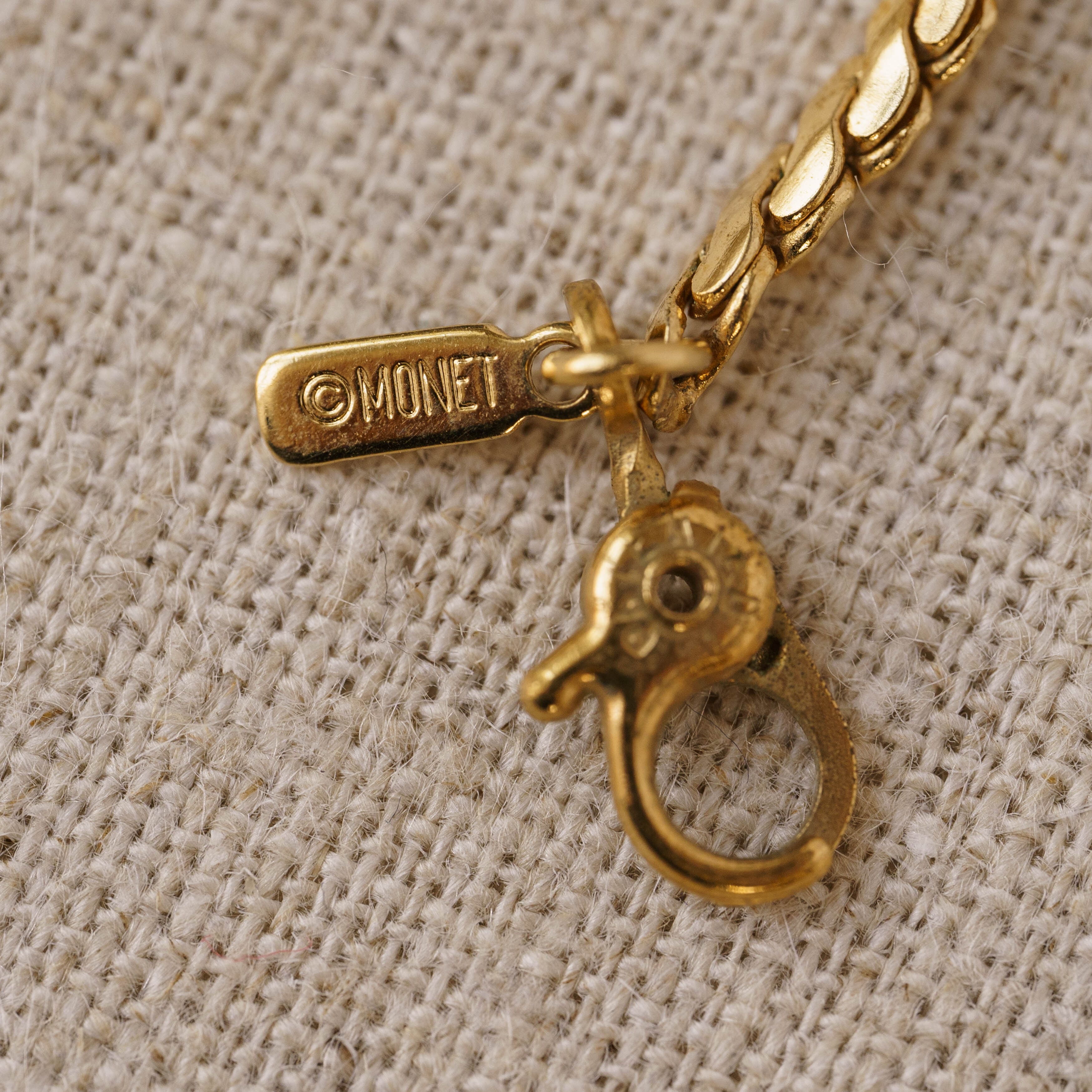 This vintage pendant showcases the high-quality metalwork that is characteristic of Monet. The warm, deep glow of vintage gold accentuates the bold nature-inspired motif of the pendant, bringing a refined and striking presence. The substantial weight unique to vintage jewelry adds a touch of luxury, enhancing simple attire with an elegant accent. Pair it with a turtleneck sweater or a classic blouse for a standout ensemble.