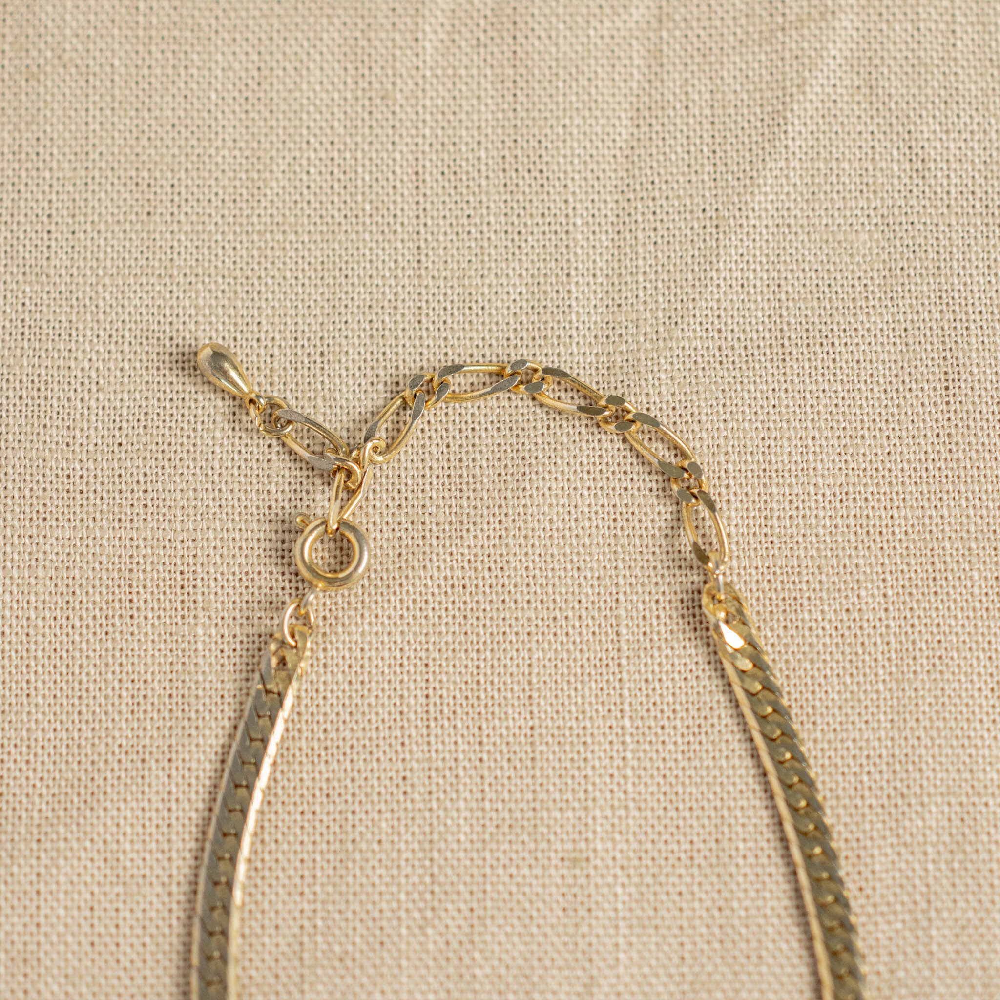 洗練されたVモチーフが印象的なヴィンテージネックレス。ゴールドメタルの柔らかなトーンが上品な光沢を放ち、エナメルとラインストーンのコンビネーションが、クラシカルでありながらモードな印象を与えます。V字に配されたデザインは、首もとをすっきりと見せ、コーディネートに洗練されたアクセントを加えます。