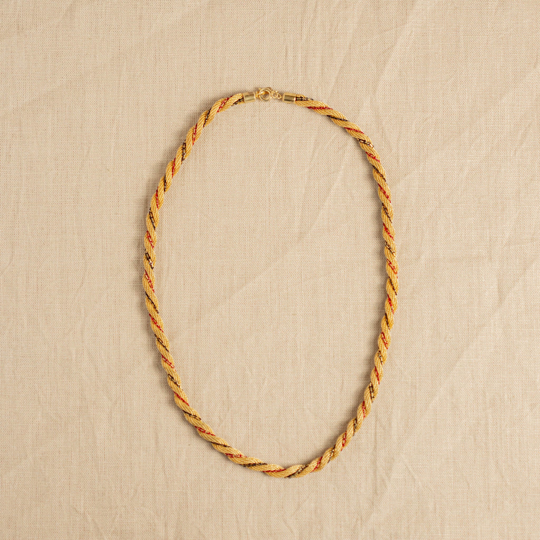 ロープ状のデザインが印象的なヴィンテージネックレス。ゴールドのトーンが優美な輝きを放ち、ヴィンテージならではのあたたかみのある素材感が魅力です。立体的なツイストデザインが首もとに存在感を与え、シンプルながらもエレガントな印象を演出します。このネックレスは、スタイリングに華やかさをプラスしつつ、シーンを選ばずに使える万能なアイテムです。