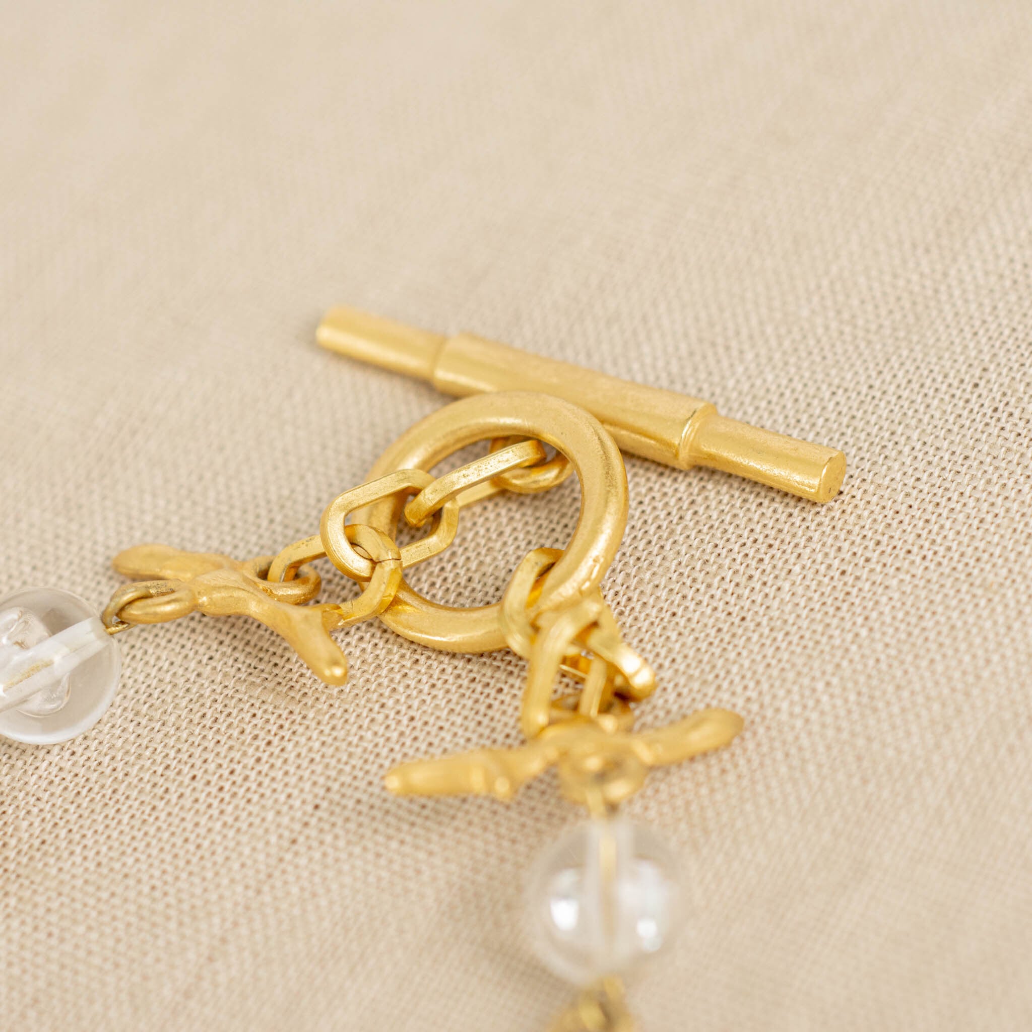 透明感あるガラスビーズとヴィンテージゴールドの色味が、フランスの洗練されたデザインを引き立てるヴィンテージチョーカーネックレス。まるで光を纏うかのような美しい透明感と、クラシカルでありながら斬新さを感じさせる都会的なデザインが特徴です。秋冬のニットにも、春夏のドレスにも映える一品で、四季を通じてさまざまなスタイルに寄り添います。