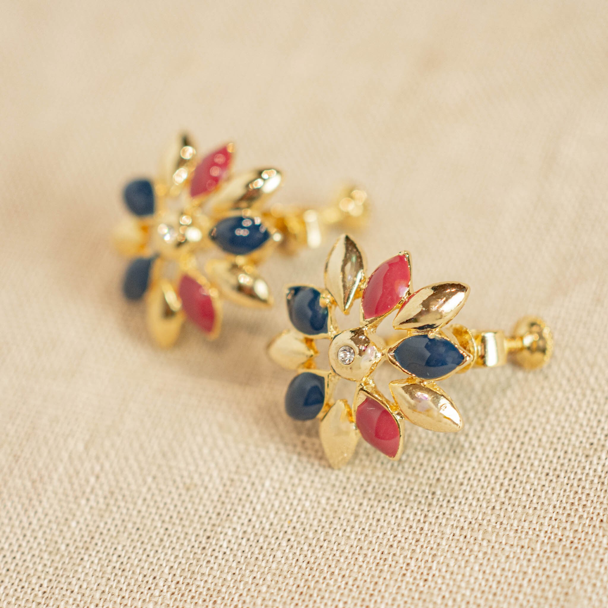 色あざやかなエナメルとフローラルモチーフが魅力的なヴィンテージイヤリング。ブルーとレッドのコントラストが印象的で、中央に輝くラインストーンが耳もとに上品な輝きを添えます。なつかしい雰囲気を醸し出しつつも、モードなデザインが際立つこのイヤリングは、ヴィンテージ感あふれる一品です。