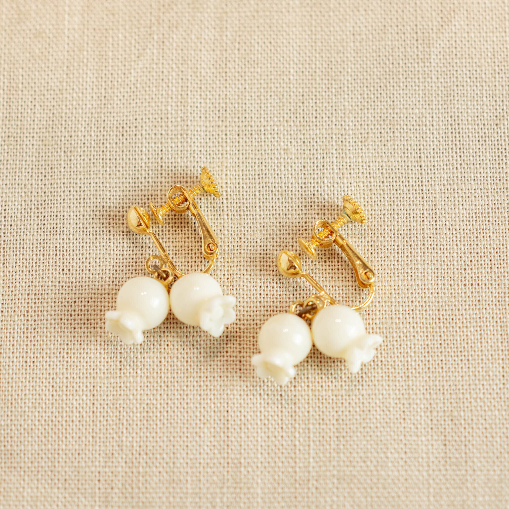 可憐なリリー・オブ・ザ・バリー(すずらん)モチーフが印象的なヴィンテージイヤリング。優しいアイボリーカラーのトーンが、上品で落ち着いた雰囲気を醸し出し、ヴィンテージ感あふれるゴールドの金具との組み合わせが、クラシカルな魅力を引き立てています。シンプルでありながらも愛らしいデザインが、耳もとに繊細な華やかさを添えます。