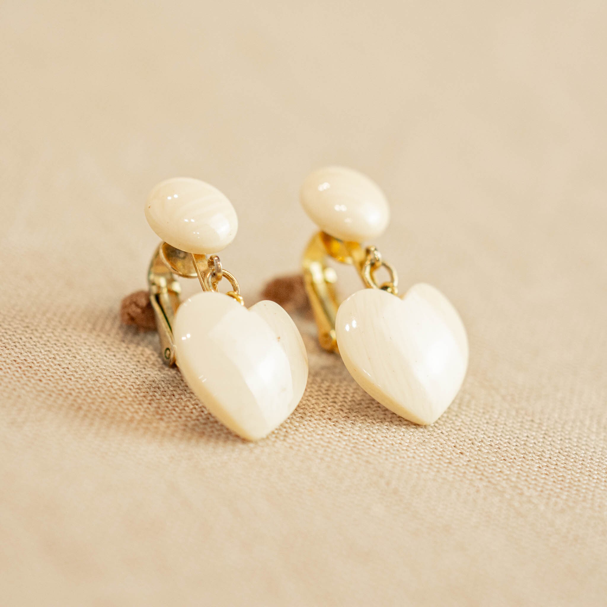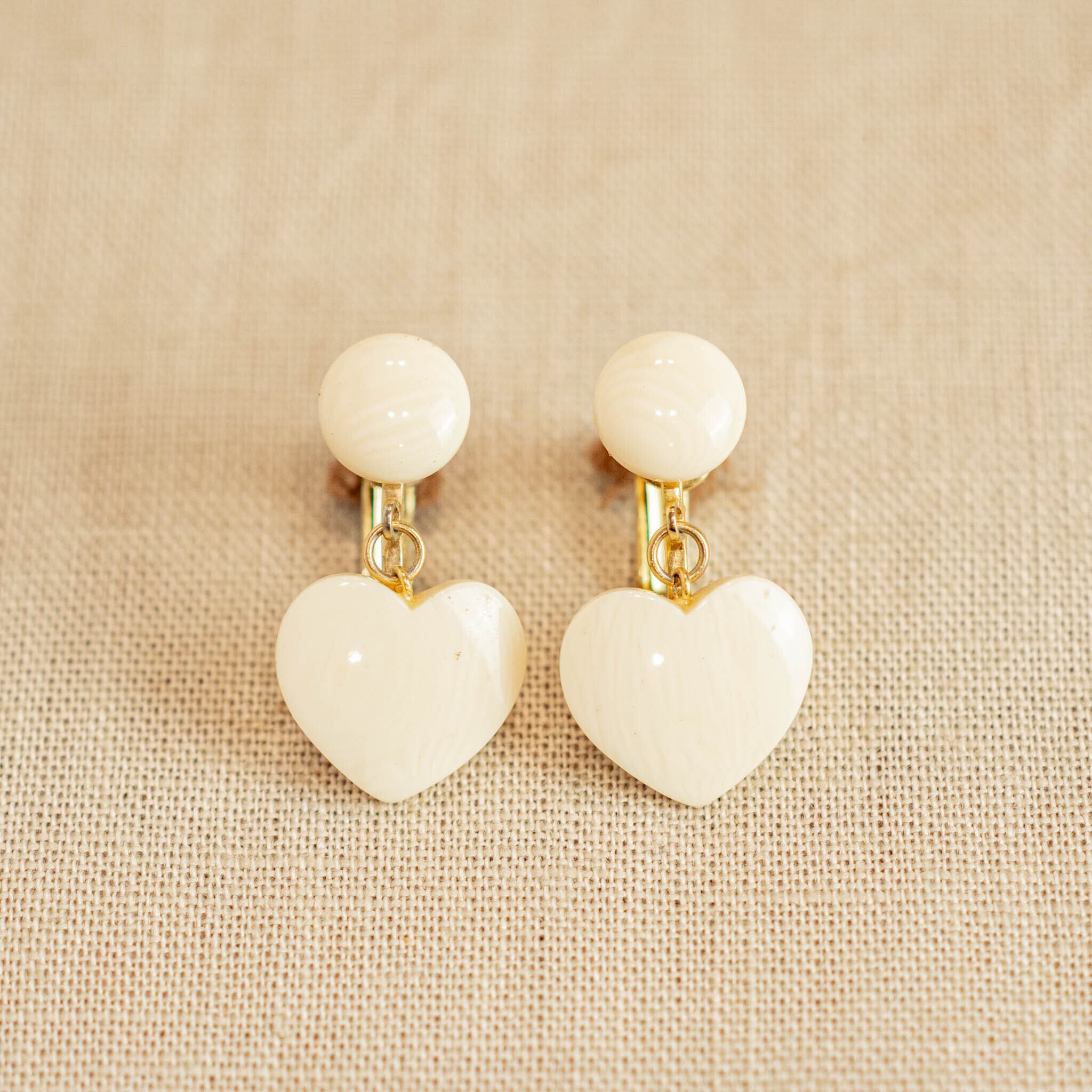 愛らしいハートモチーフが印象的なヴィンテージイヤリング。ルーサイト特有の透明感のある素材感が、優しいアイボリートーンをより一層引き立てています。シンプルながらも上品なデザインが、ヴィンテージらしいクラシカルな雰囲気をやさしく引き立て、耳もとに可憐な印象を添えてくれます。