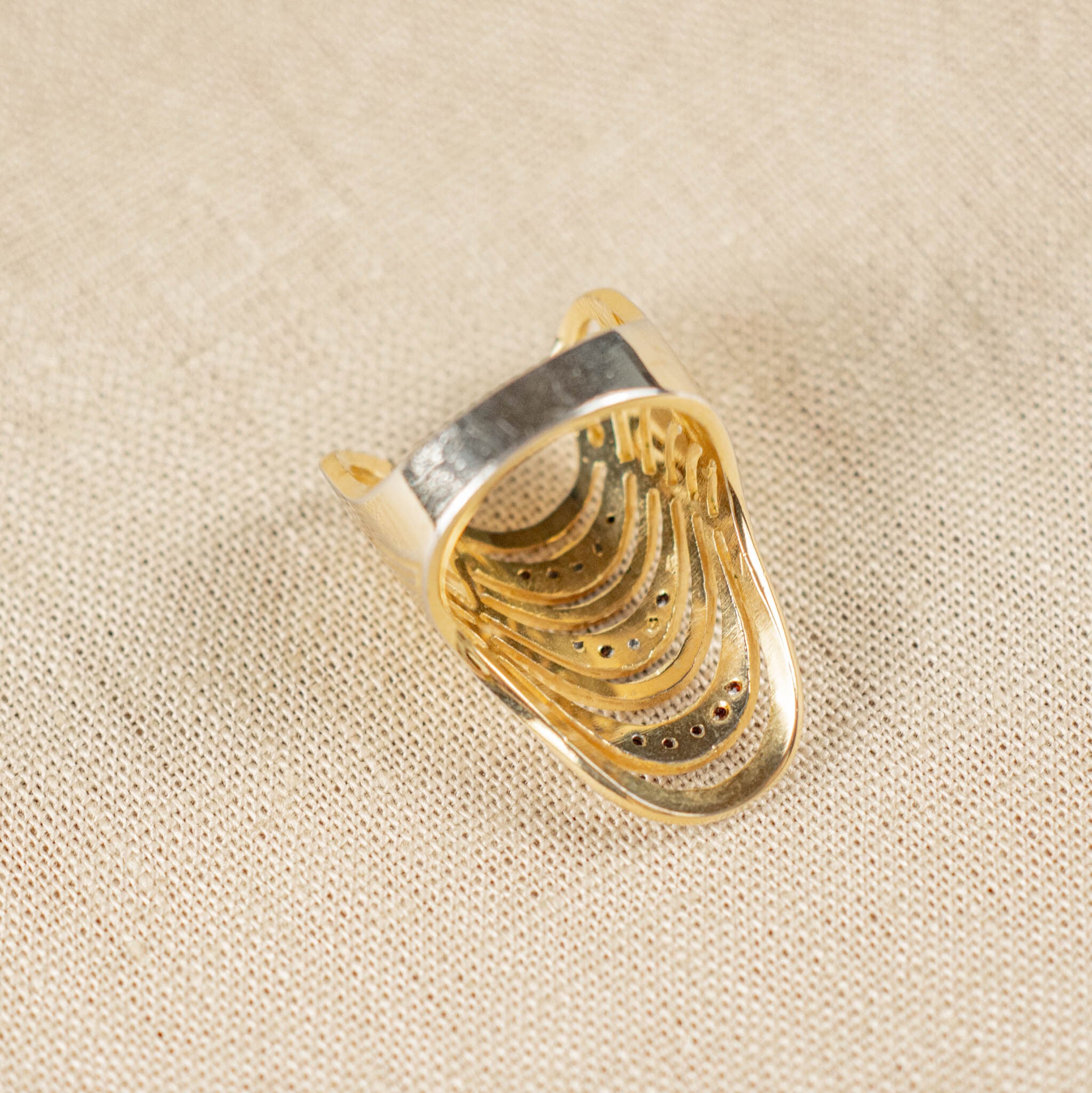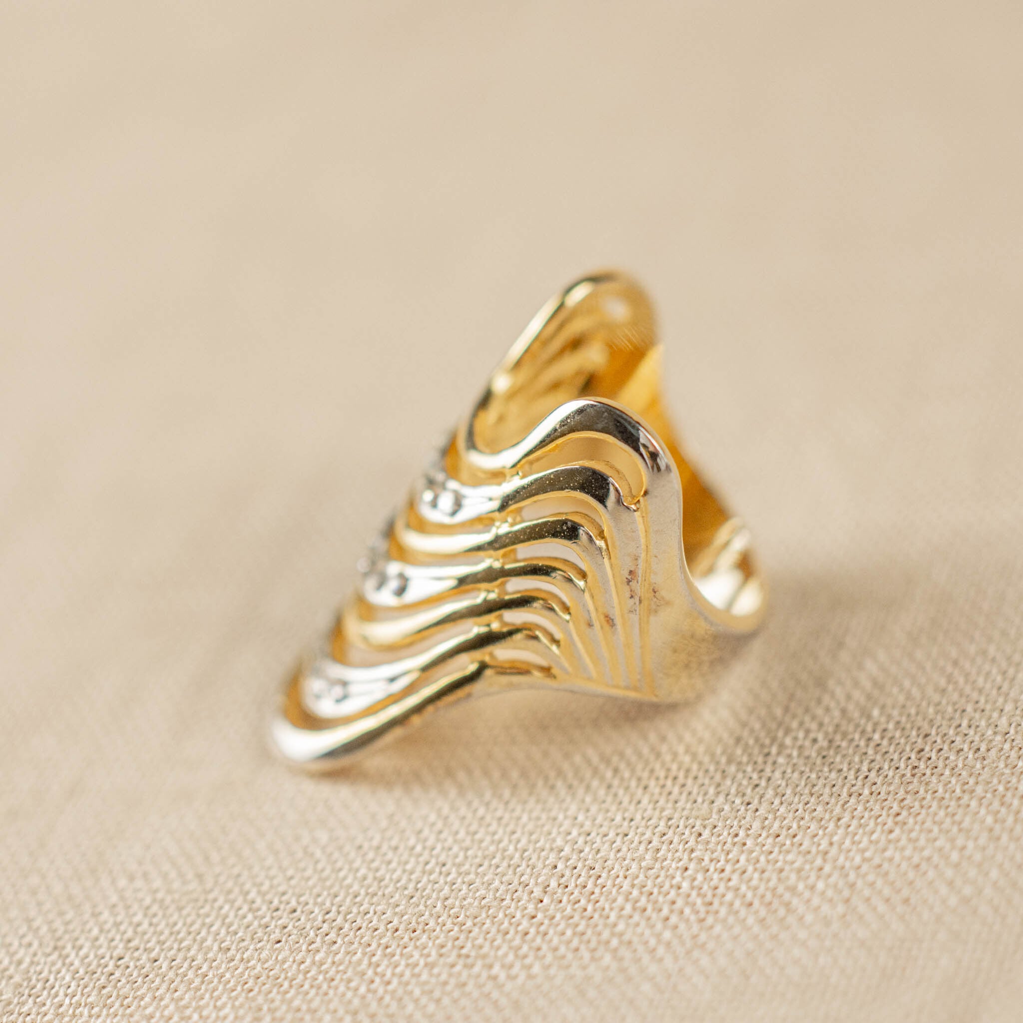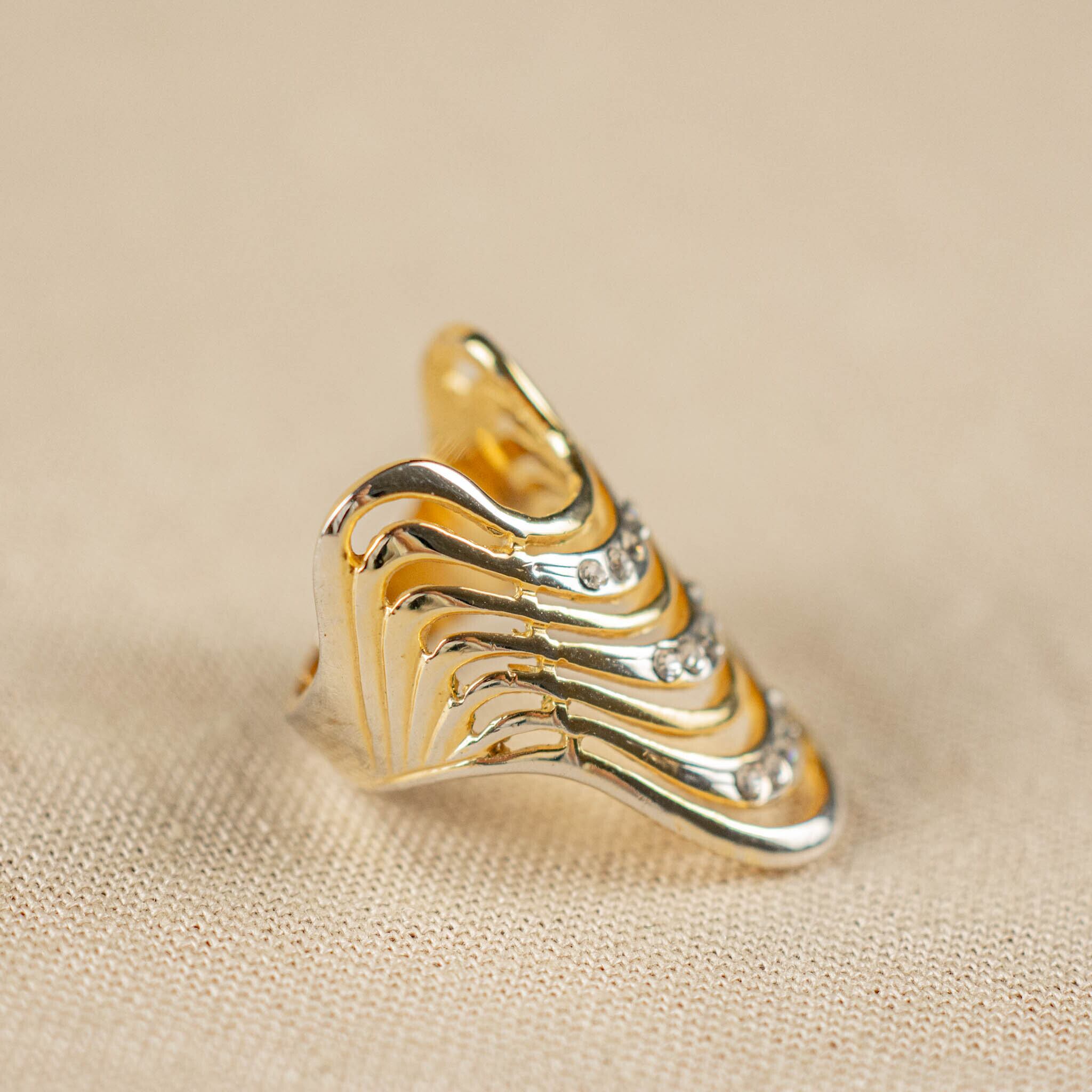 抽象的なラインが描く、モードなデザインが魅力的なヴィンテージリング。多少大ぶりでありながらも、控えめで洗練されたシルエットが、手もとにさりげないエレガンスを演出します。極小のラインストーンが光を受けて上品にきらめき、素材の持つ深みが存在感を放ちます。シンプルながらもどこかアーティスティックな雰囲気が漂い、カジュアルからエレガントなスタイルまで幅広く合わせやすいリングです。