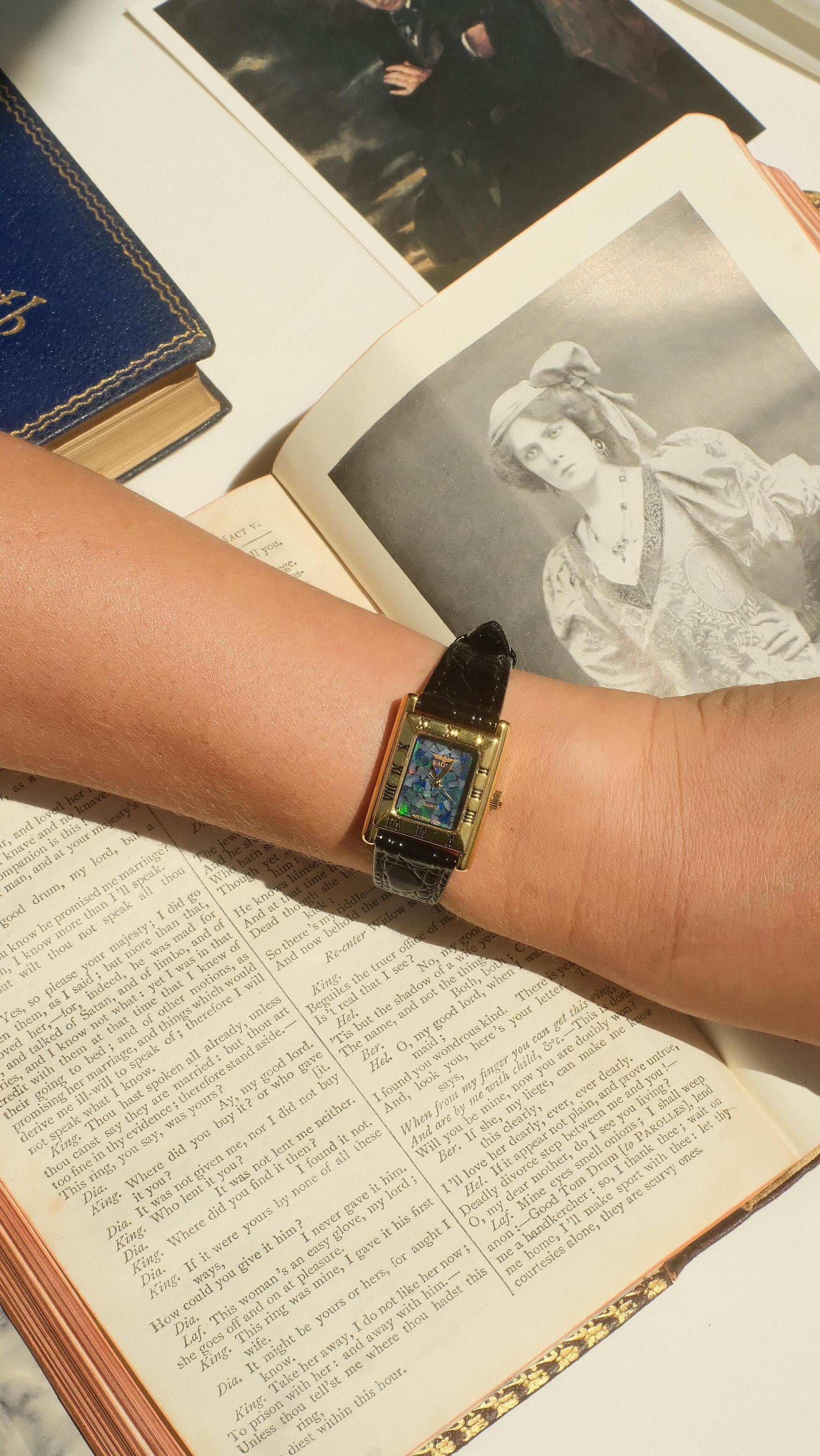 This vintage opal mosaic watch features a beautiful iridescent glow that changes with the angle of the light. The opal mosaic on the face resembles stars in the night sky, shimmering and changing as time ticks by.The vintage design and delicate details bring an air of sophistication to the wearer's hand, combining classic and contemporary beauty.