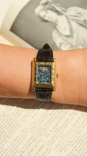 オパールモザイクフェイスが印象的なヴィンテージウォッチ。オパールのピースが作り出す美しいモザイクは、光の加減によって多彩な色合いを見せ、手もとに独特の輝きを与えます。ゴールドのフレームは、クラシックかつモードなデザインで、ヴィンテージ感あふれるエングレービングが施されたローマ数字が、エレガントで洗練された印象を引き立てます。