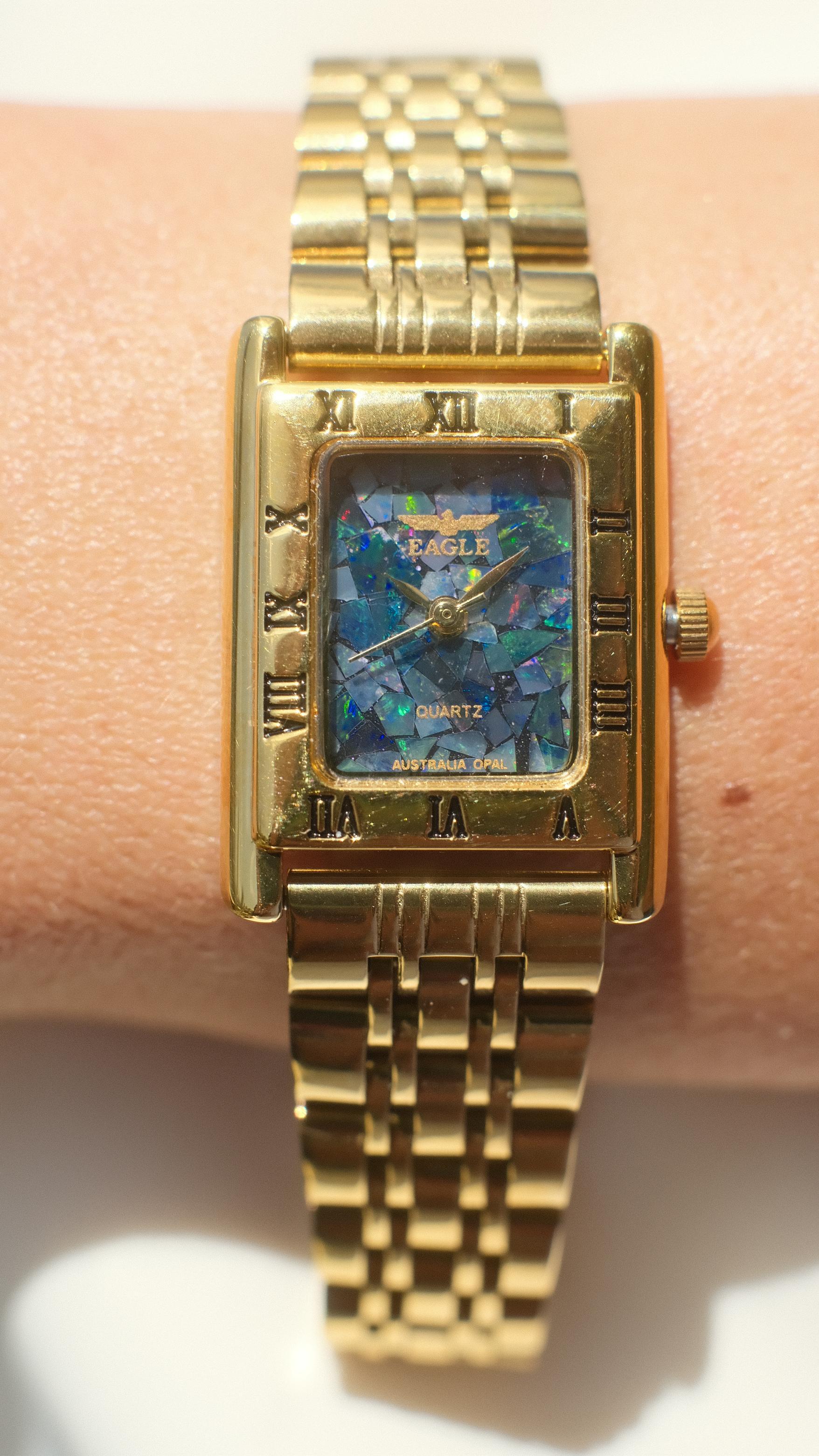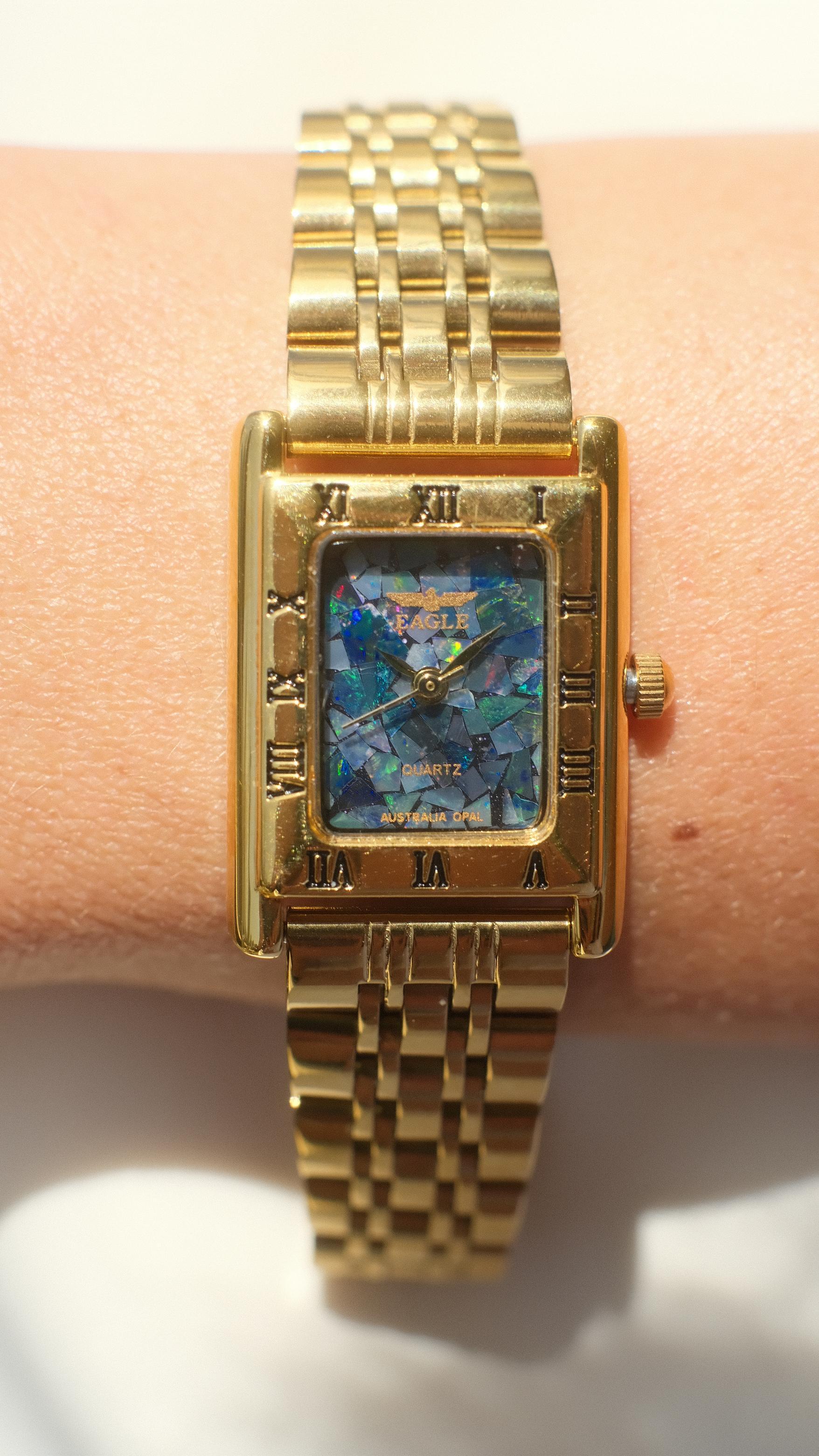 This vintage opal mosaic watch features a beautiful iridescent glow that changes with the angle of the light. The opal mosaic on the face resembles stars in the night sky, shimmering and changing as time ticks by.The vintage design and delicate details bring an air of sophistication to the wearer's hand, combining classic and contemporary beauty.