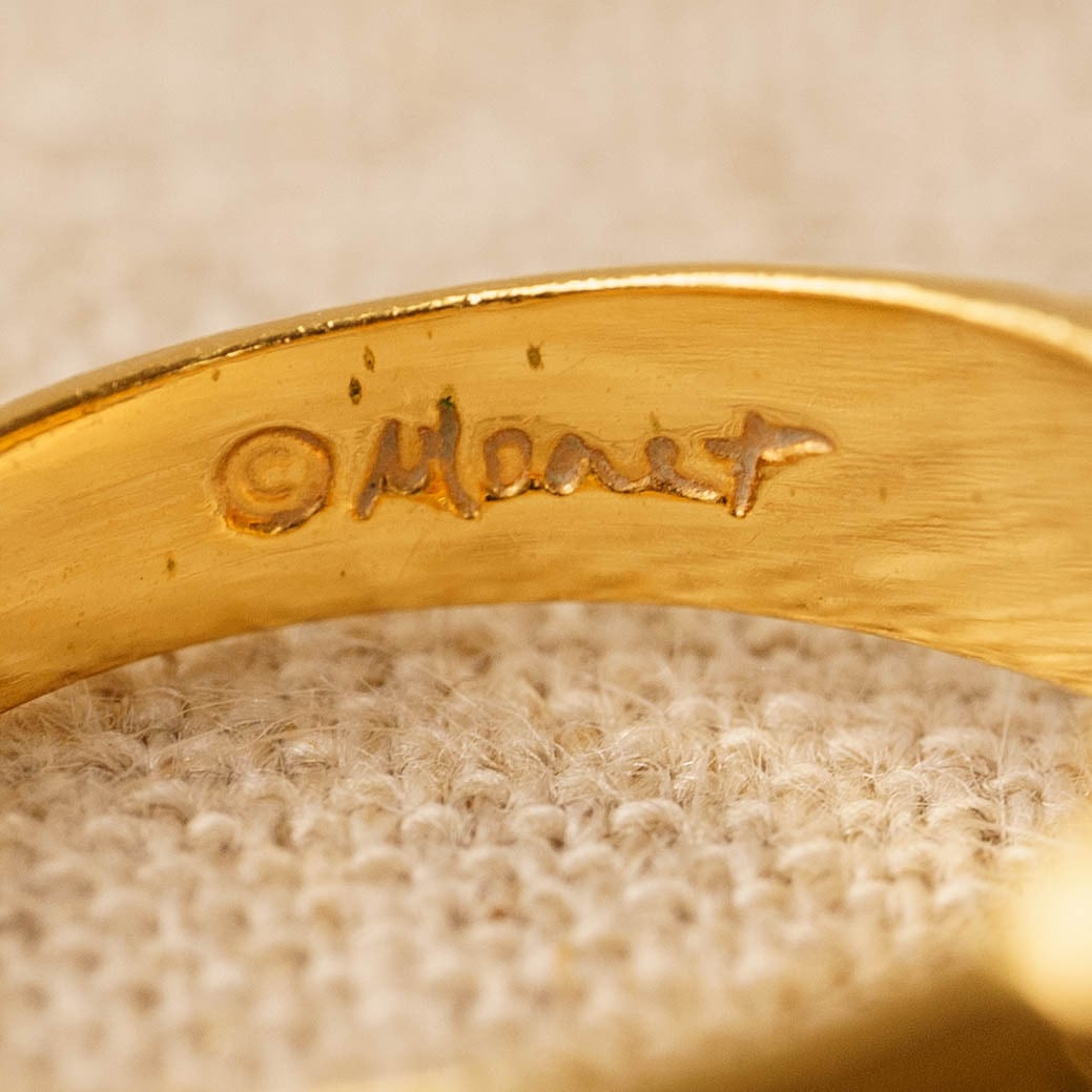 Monetのヴィンテージリング。クラシカルなフローラルデザインが美しい、Monetのリングです。センターには静ひつな輝きを放つホワイトパールがあしらわれ、その周りを取り巻くパヴェが繊細なきらめきを添えます。しっかりとしたシャンクが、はめたときの安定感に。ヴィンテージゴールドのあたたかみのある深みと相まって、上品で華やかな印象を醸し出します。