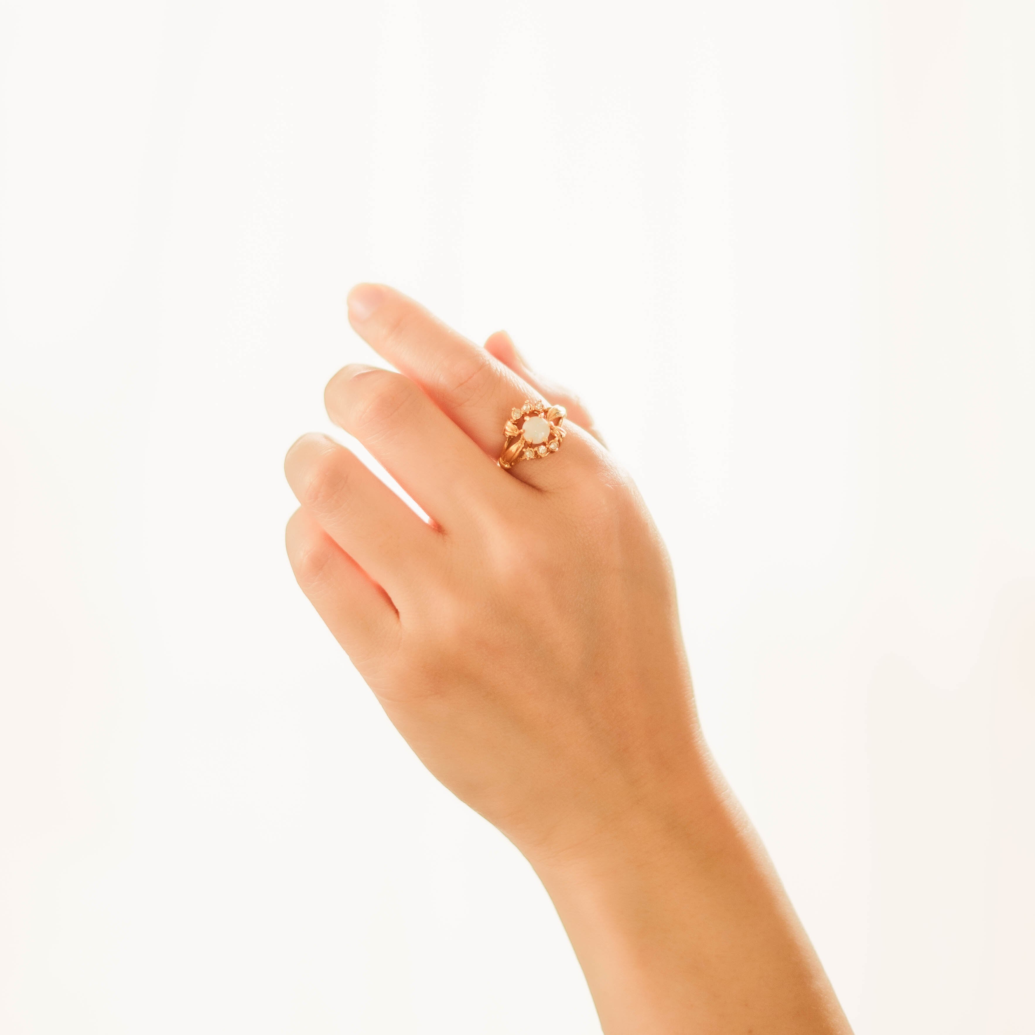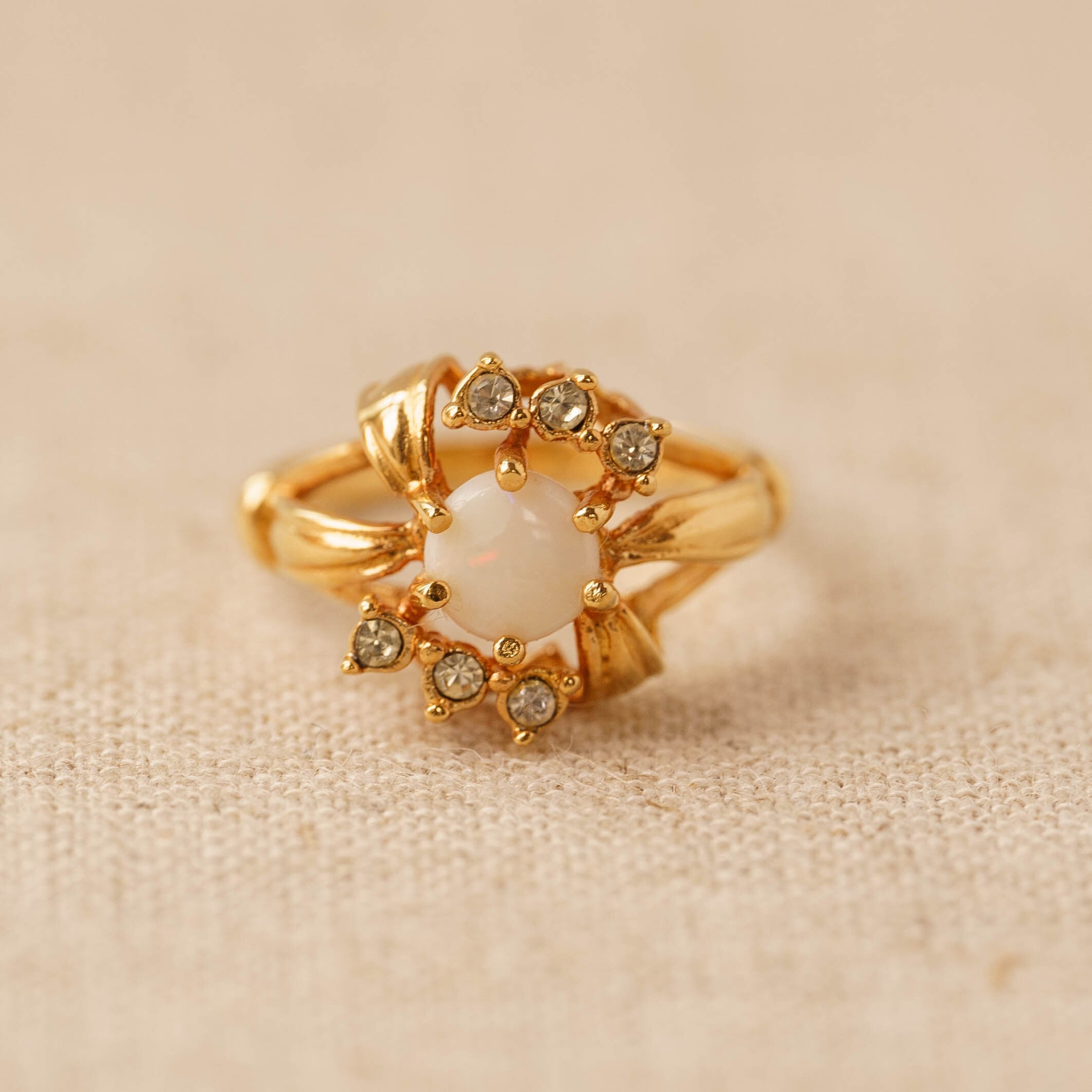オーストラリア産ホワイトオパールの上品な輝きが魅力のヴィンテージリング。抽象的かつクラシカルなシルエットに仕上げられたデザインは、エレガントさと洗練された雰囲気を併せ持ち、特別な存在感を放ちます。ホワイトオパールの柔らかな光沢が、極小のラインストーンのさりげないきらめきと調和し、華やかさをプラス。ヴィンテージゴールドの深みが、オパールの神秘的な美しさを引き立て、一つひとつのディテールに気品が宿ります。このリングは、オーストラリアの豊かな自然が育んだオパールと、クラシカルなデザインが見事に融合した逸品です。
