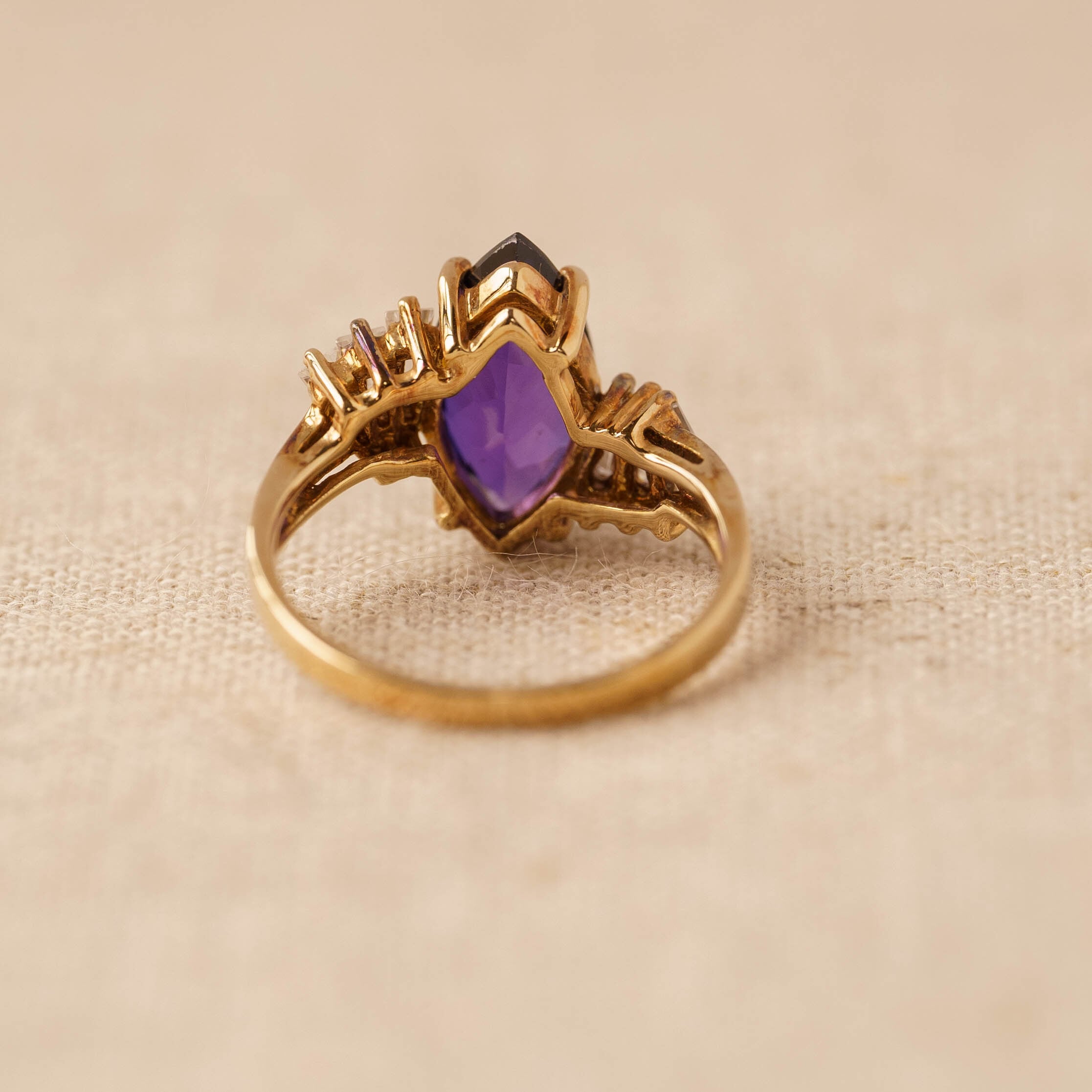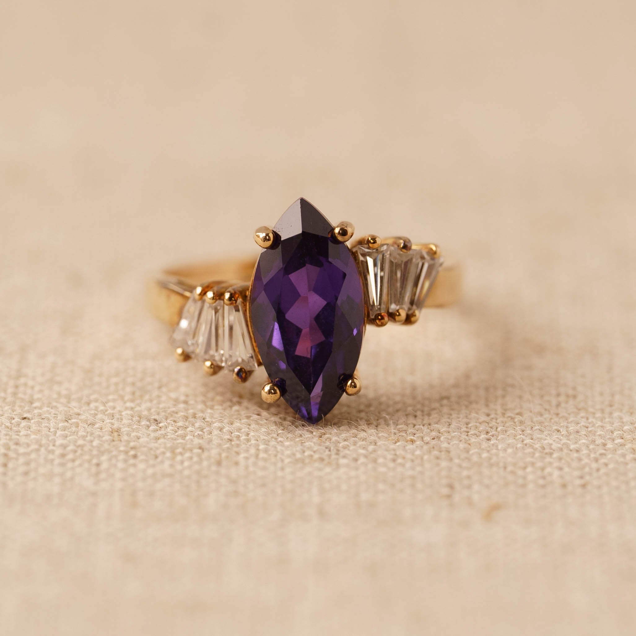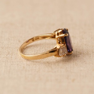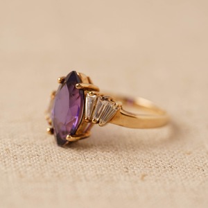 大きなヴァイオレットカラーのマーキスカットジルコニアがセンターを飾り、両サイドには扇状に配置された3石ずつのクリアカラーのバケットカットジルコニアが輝きを添えるヴィンテージリング。アンティークジュエリーを思わせるクラシカルなデザインは、抽象的でエレガントな雰囲気を放ち、手もとに特別な存在感をもたらします。ヴァイオレットストーンの深い色味と素材感が視線を集め、周囲にあしらわれた極小のラインストーンが繊細なきらめきをプラス。ヴィンテージゴールドの落ち着いたトーンが全体のデザインをまとめ、気品と温かみを感じさせる逸品です。