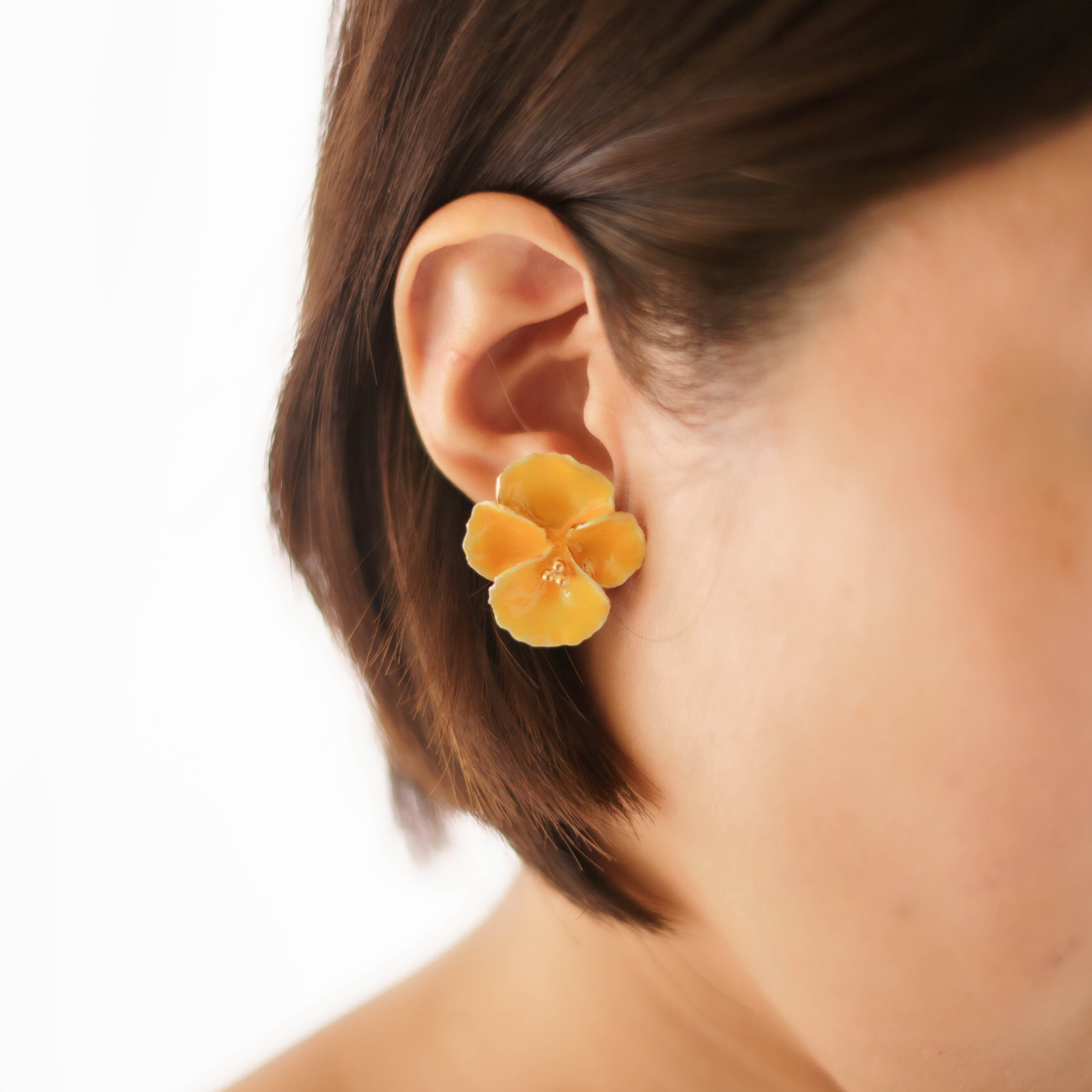やさしいイエローのエナメルが魅力的なフローラルモチーフのヴィンテージピアス。光沢のあるエナメルの素材感が、花びらの柔らかなラインを引き立て、耳もとに温かみのある輝きを与えます。淡いイエロートーンが、顔まわりを明るく彩り、ナチュラルでありながらも存在感のあるデザインが特徴です。