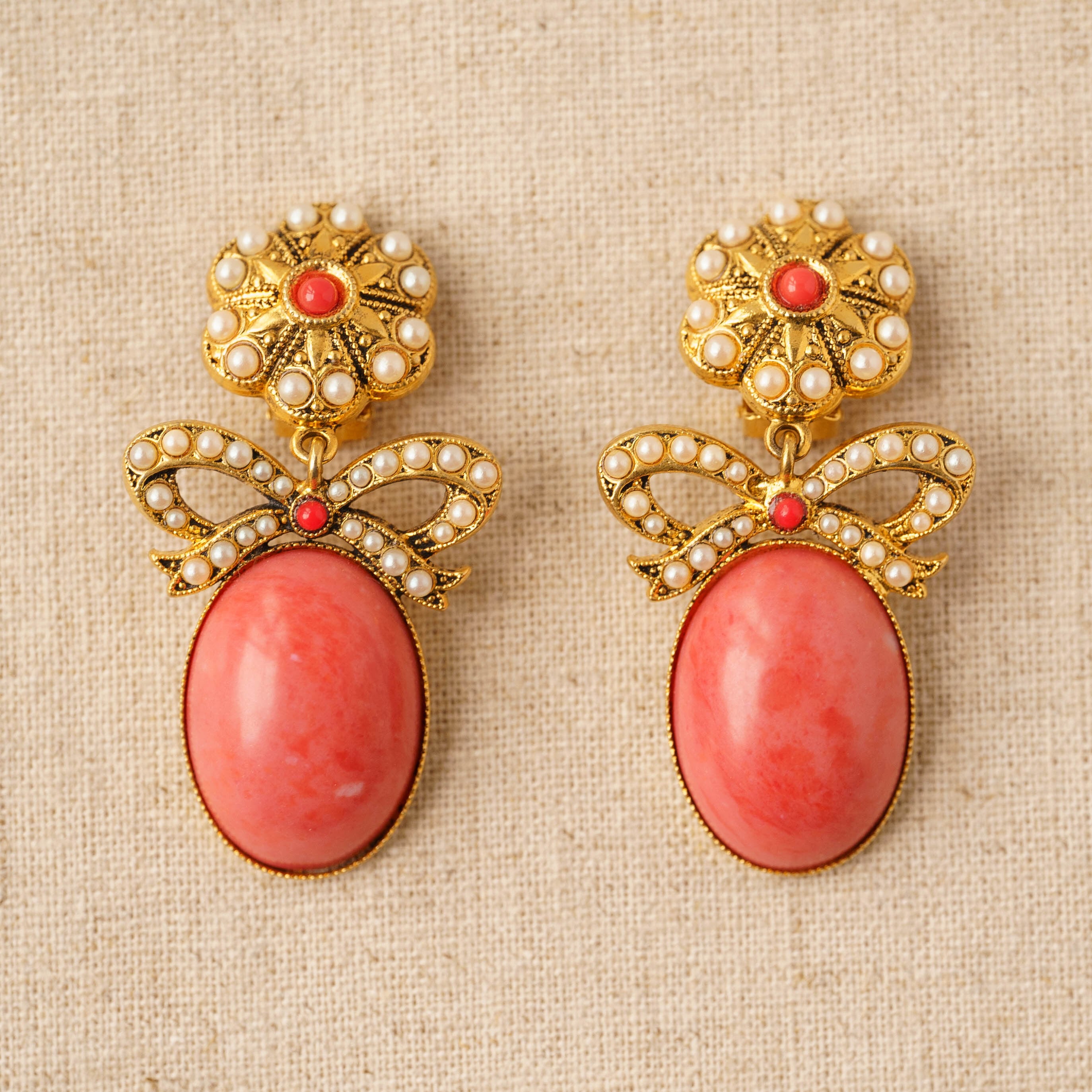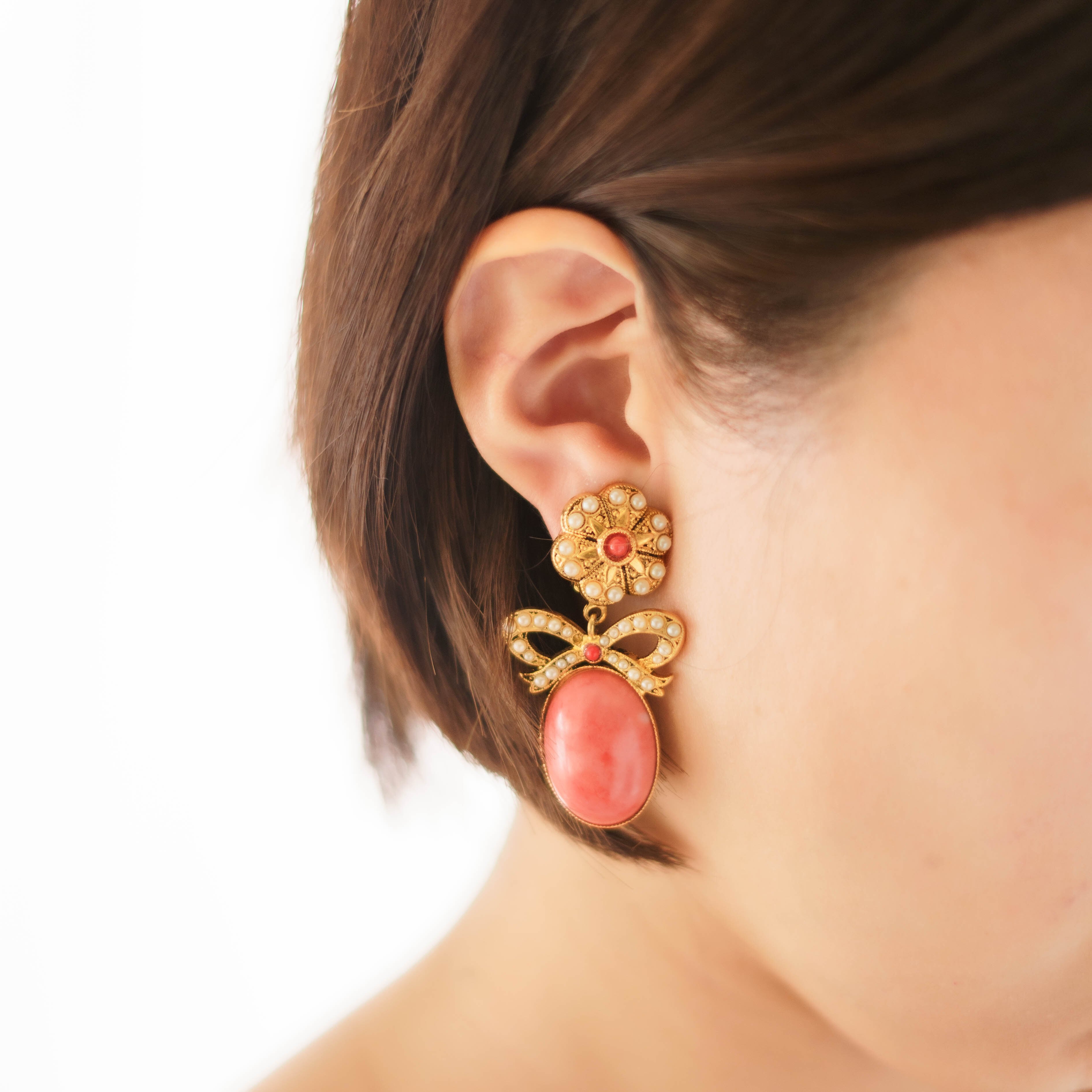 やさしいピンクトーンが魅力的なヴィンテージイヤリング。細かいパールディテールでかたどられたボウモチーフが、女性らしい優雅さを演出し、全体にエレガントな雰囲気を漂わせます。パールの繊細な輝きが、柔らかなピンクの石と絶妙に調和し、大ぶりながらも主張しすぎないデザインが特徴です。動くたびにさりげなく揺れる様子が、耳もとに軽やかな印象を与えます。