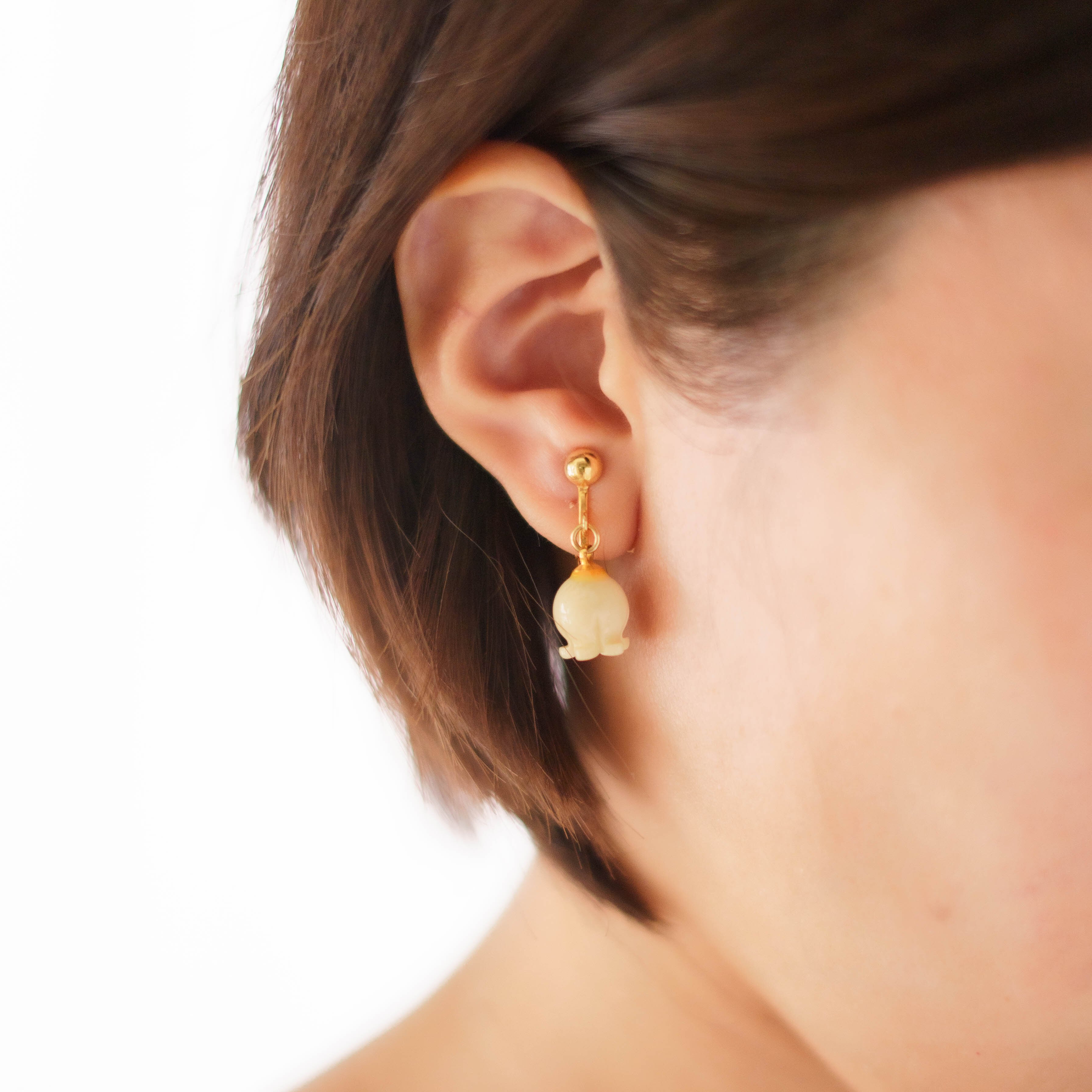 可憐なリリー・オブ・ザ・バリー(すずらん)モチーフが特徴的なヴィンテージピアス。すずらんを模した繊細なデザインが、耳もとに優しい印象を与えます。ゴールドのメタルフレームはヴィンテージ感あふれるあたたかみのあるトーンで、クリーム色のすずらんの花とのコントラストが美しく調和しています。小ぶりながらも存在感のあるデザインが、どんなスタイルにもエレガントさをプラス。
