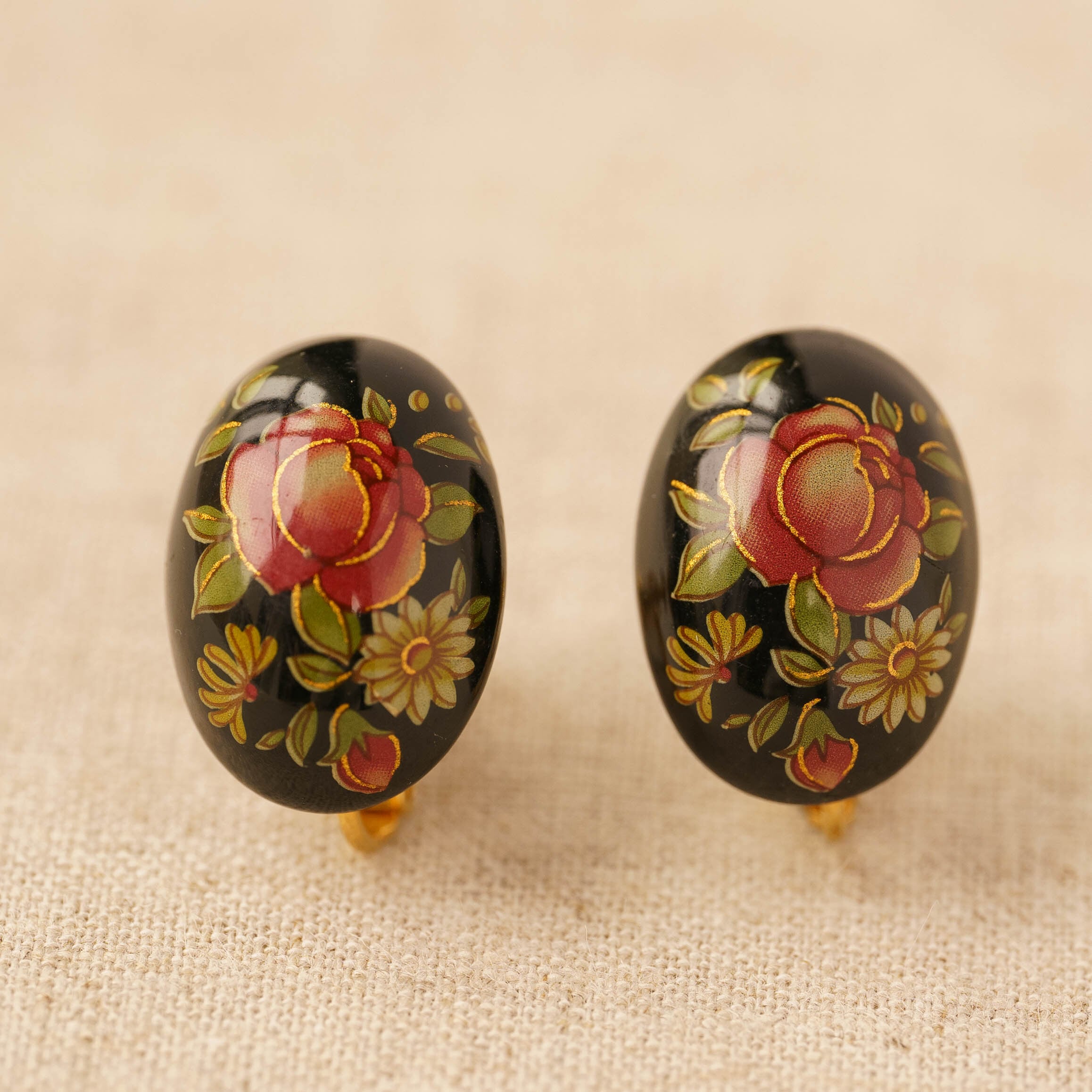 ハンドペイントで丁寧に描かれたフローラルモチーフが美しいヴィンテージピアス。セラミックの滑らかな素材感と、ブラックベースに鮮やかに浮かび上がる花々のデザインが、クラシカルな雰囲気を引き立てます。深みのある色味が秋冬のコーディネートにぴったりで、クラシカルでありながら華やかなアクセントを添えてくれます。
