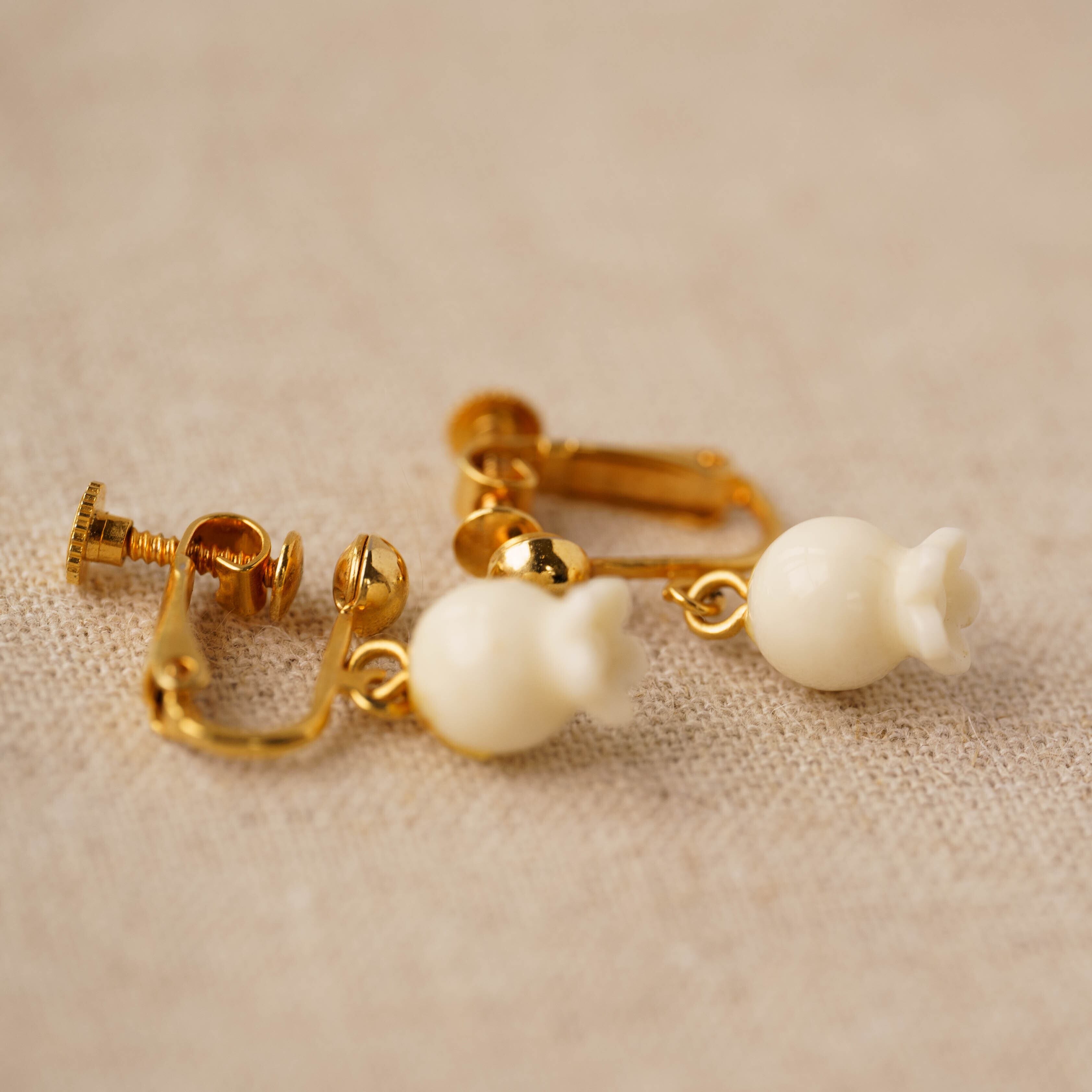 可憐なリリー・オブ・ザ・バリー(すずらん)モチーフが特徴的なヴィンテージピアス。すずらんを模した繊細なデザインが、耳もとに優しい印象を与えます。ゴールドのメタルフレームはヴィンテージ感あふれるあたたかみのあるトーンで、クリーム色のすずらんの花とのコントラストが美しく調和しています。小ぶりながらも存在感のあるデザインが、どんなスタイルにもエレガントさをプラス。