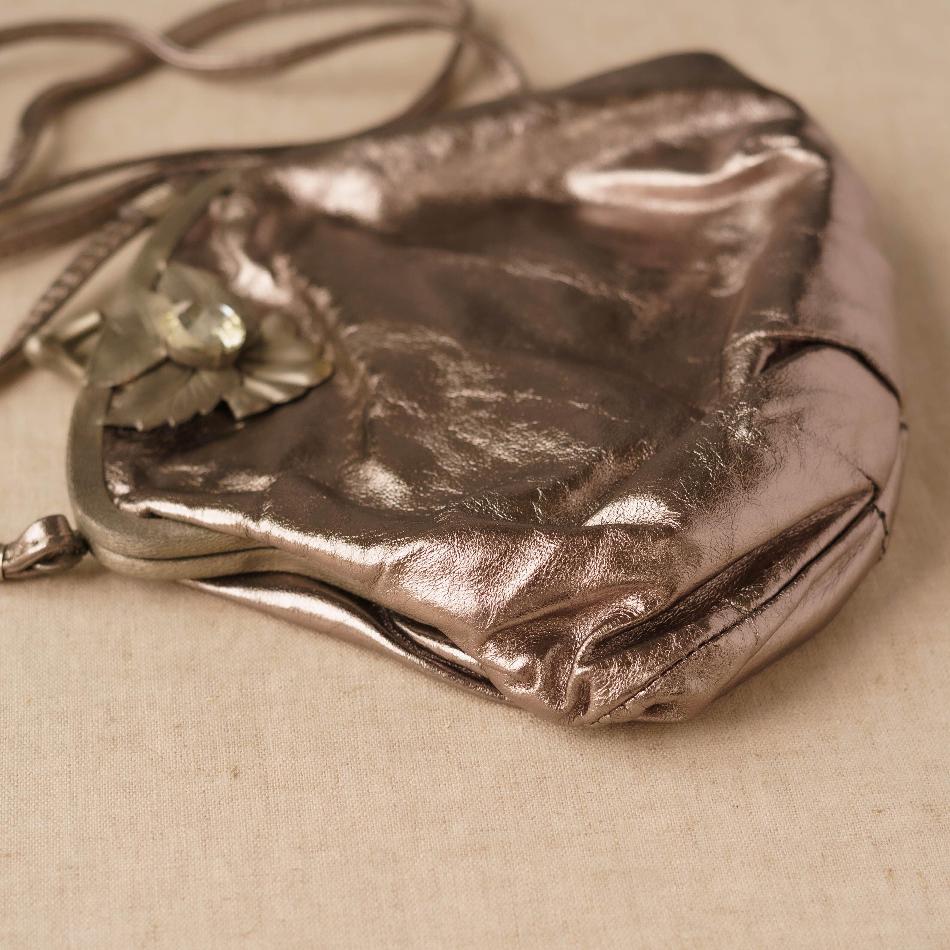 Crafted from premium leather, this vintage shoulder bag exudes a timeless charm paired with impeccable craftsmanship. The clasp features an elegant floral motif that enhances its vintage aesthetic, showcasing the fine handiwork and unmatched quality characteristic of German artisanship. The metallic finish on the leather brings a dynamic texture that shifts beautifully with the light, adding a touch of sophistication to any outfit. Perfect for complementing simple, everyday looks or elevating evening attire, this piece seamlessly blends versatility and style.
