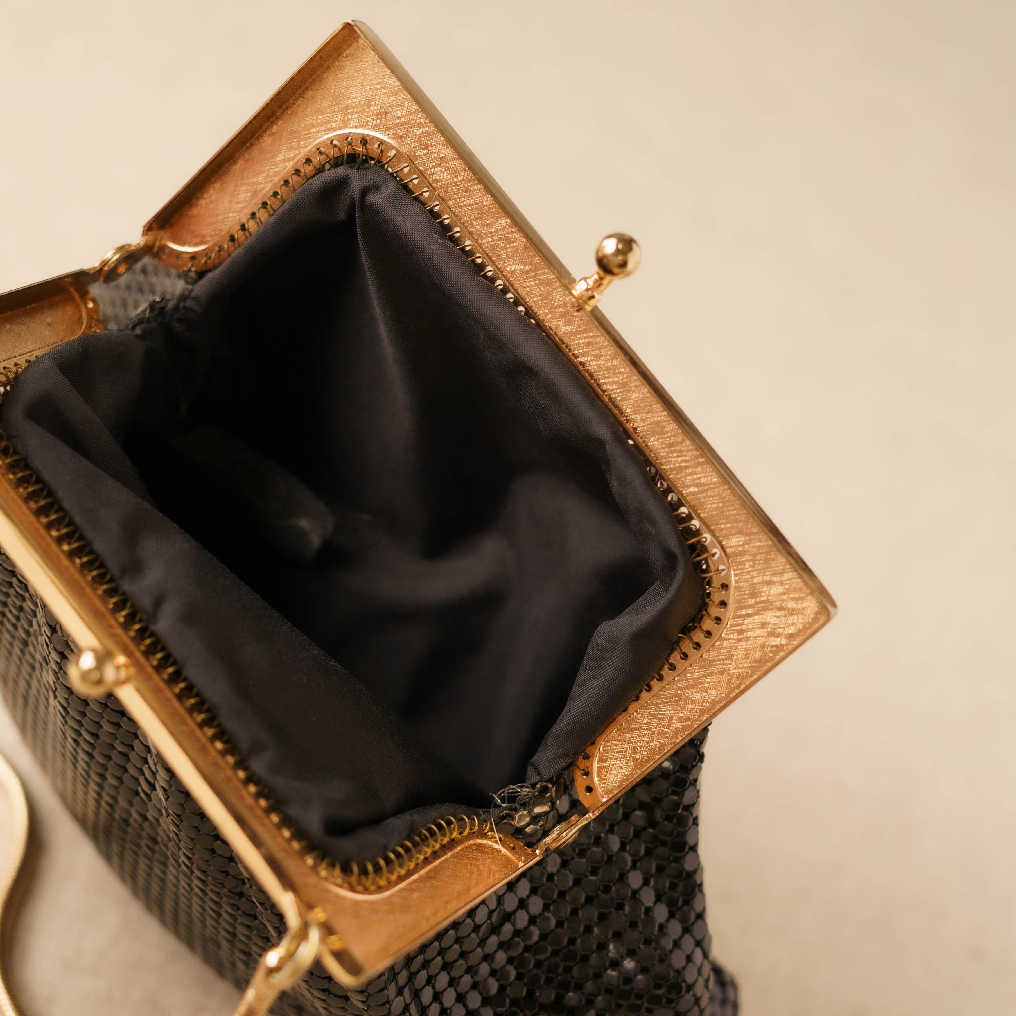 A vintage bag showcasing the superior craftsmanship characteristic of Glomesh, featuring premium metal mesh construction. The gold metal clasp, adorned with intricate classical detailing, exudes sophistication and elegance. The black metal mesh provides a chic, modern flair, making this piece a striking accent for any outfit. Impeccable handwork highlights the attention to detail, making it perfect for both dressed-up party looks and casual chic ensembles with denim jackets. This timeless design seamlessly complements various occasions, from special events to adding a touch of elegance to everyday wear.