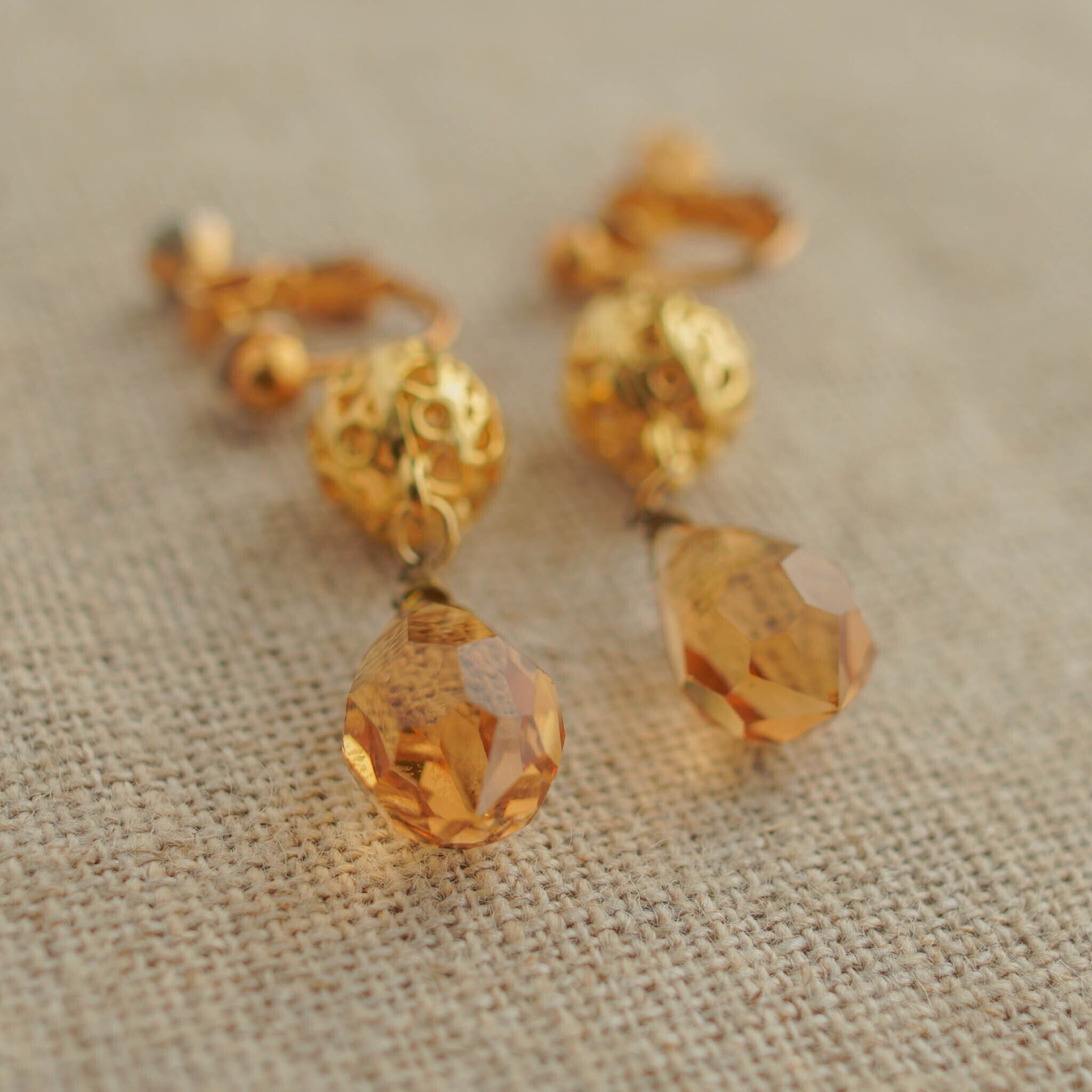 深みのあるゴールドのレースワークがヴィンテージらしいエレガンスを引き立てるヴィンテージイヤリング。丁寧にカットされたカラーガラスが、光を受けて優美にきらめき、耳もとで静かに揺れ動く様は、上品さと華やかさをそっと添えます。これからの年末パーティーシーンにはもちろん、秋冬のコーディネートに洗練されたアクセントとして活躍。一年を通してどんなスタイルにも溶け込み、ワードローブに大人の余裕と輝きをプラスするヴィンテージアイテムです。
