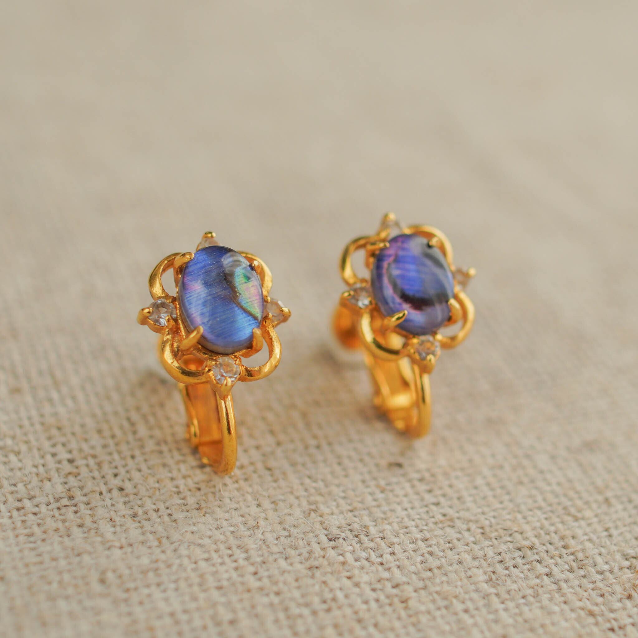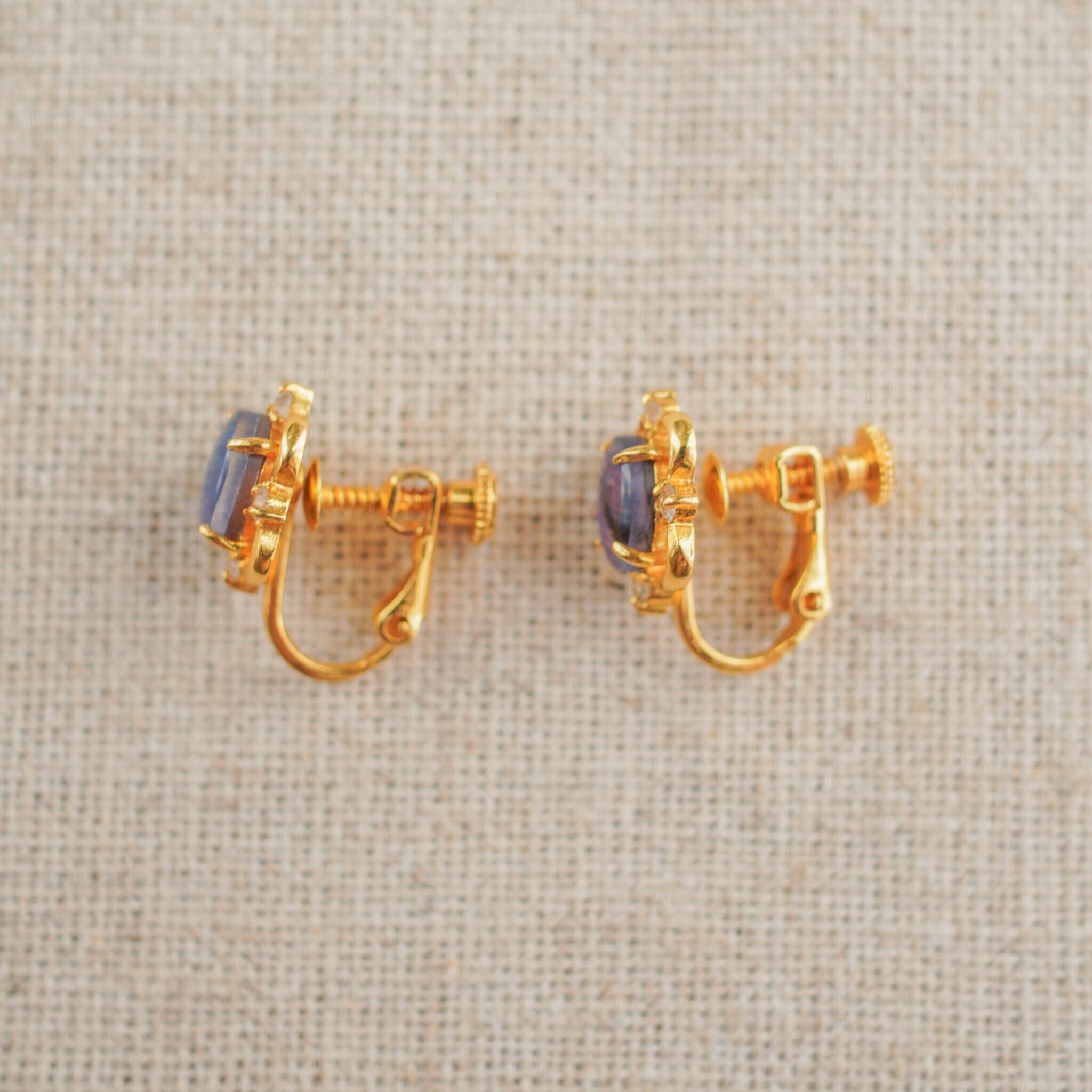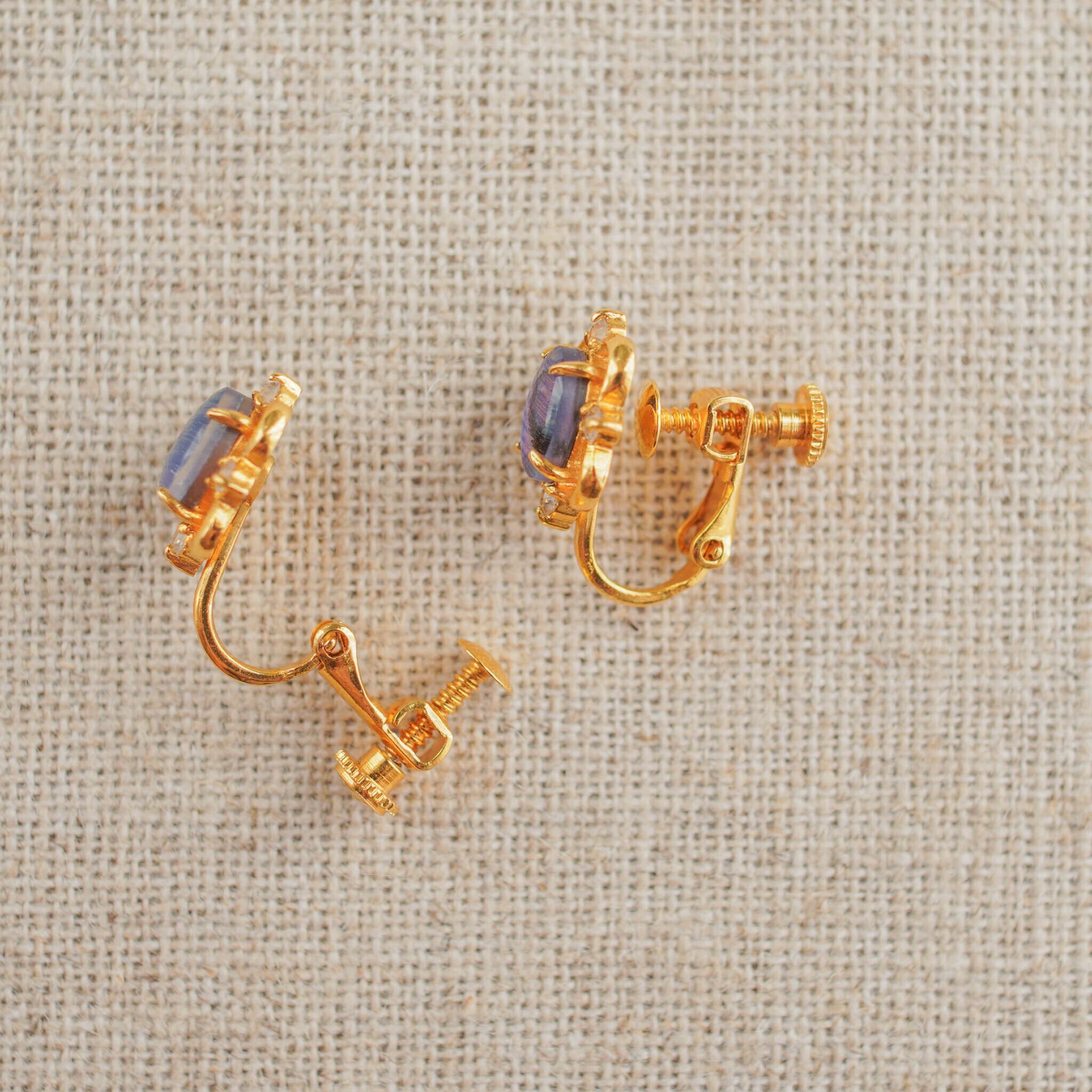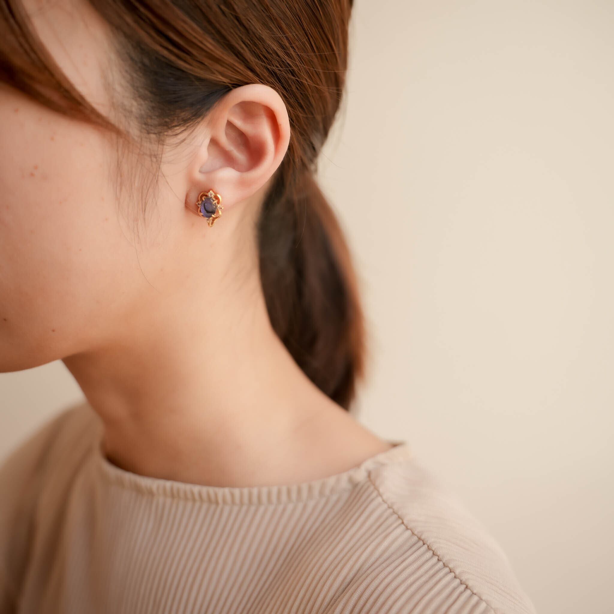オーロラ加工が施されたカラーガラスが、まるで夢のようにやさしく輝くヴィンテージイヤリング。極小のラインストーンディテールが、光の角度でさりげなく煌めきを添え、深みのあるゴールドがクラシックな美しさを引き立てています。洗練されたシルエットが、耳もとで静かに揺れ動き、上品さと優雅さをそっと演出します。秋冬のコーデに華やかさを加えるアイテムとしてはもちろん、オールシーズンでどんなスタイルにも溶け込み、ワードローブに控えめなエレガンスと輝きを添える一品です。