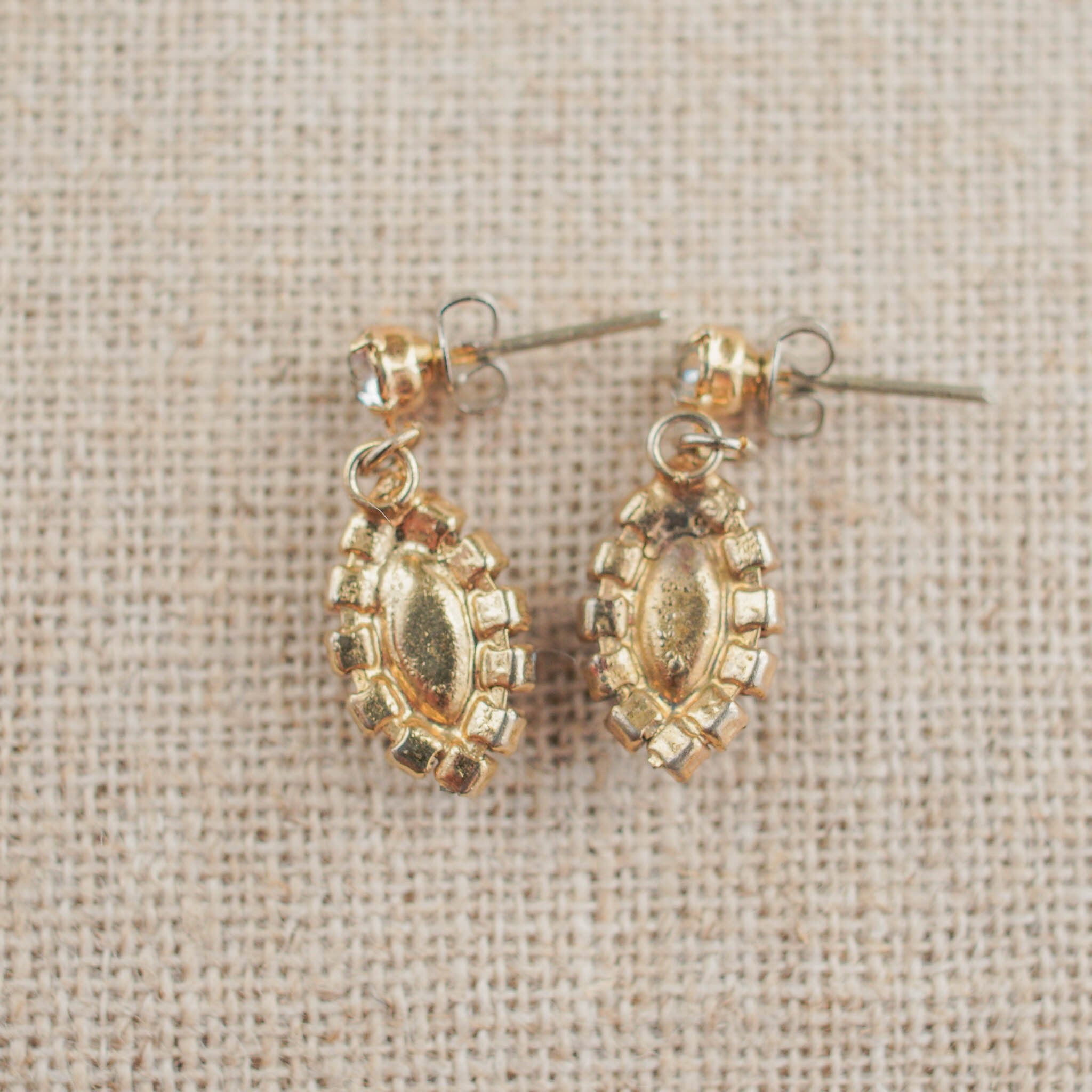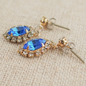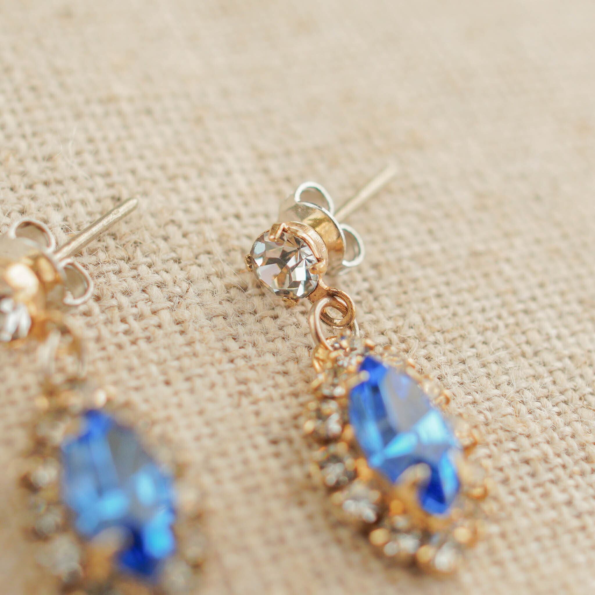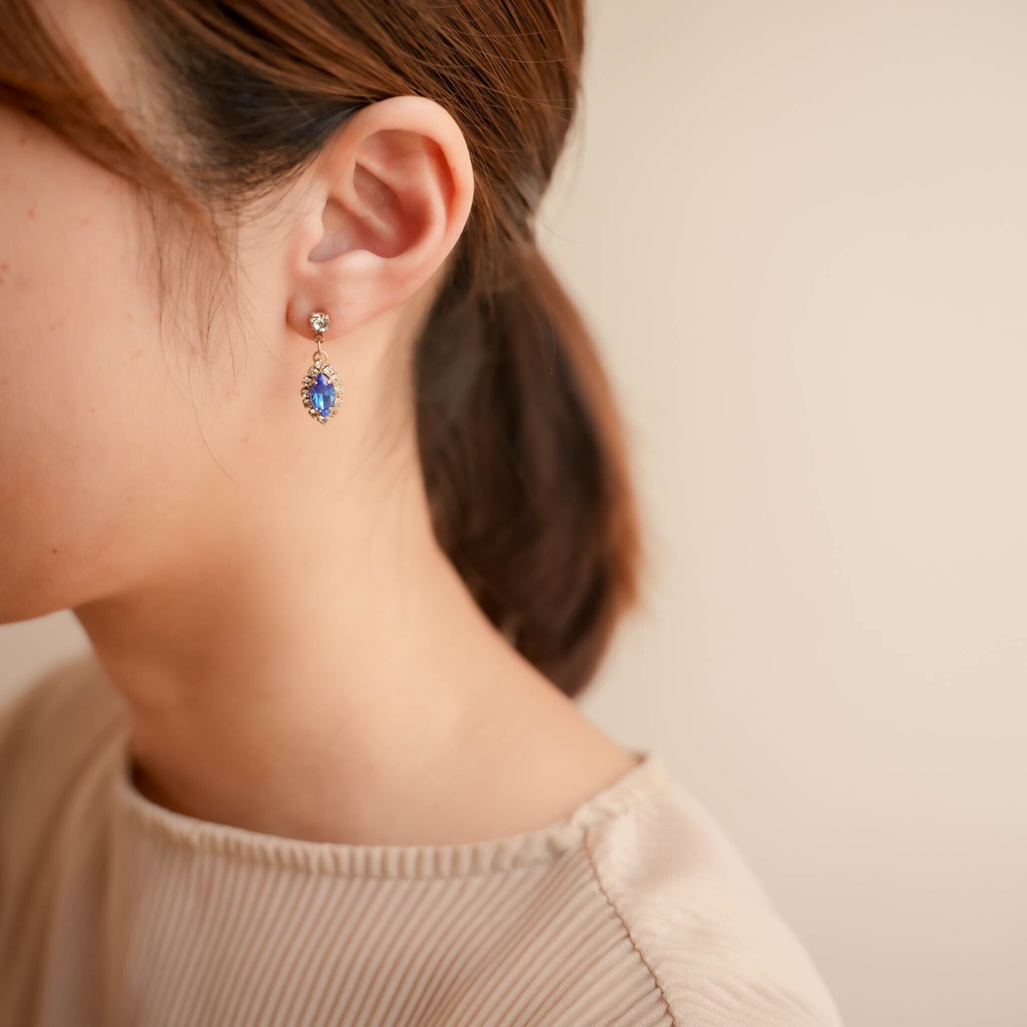 ブルーのカラーガラスが放つやさしい輝きが目を引くヴィンテージピアス。繊細にあしらわれたラインストーンのパヴェが光を受けて優雅にきらめき、ヴィンテージならではのクラシカルなデザインが魅力的です。洗練されたシルエットが耳もとで軽やかに揺れ動き、上品さと華やかさをそっと添えます。秋冬のシックな装いにはもちろん、通年通してさまざまなスタイルにマッチし、ワードローブに落ち着きのある輝きを添えるアイテムです。