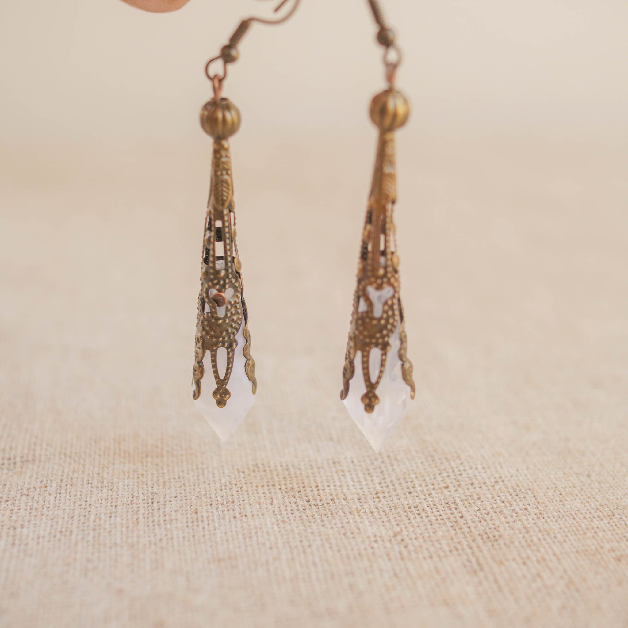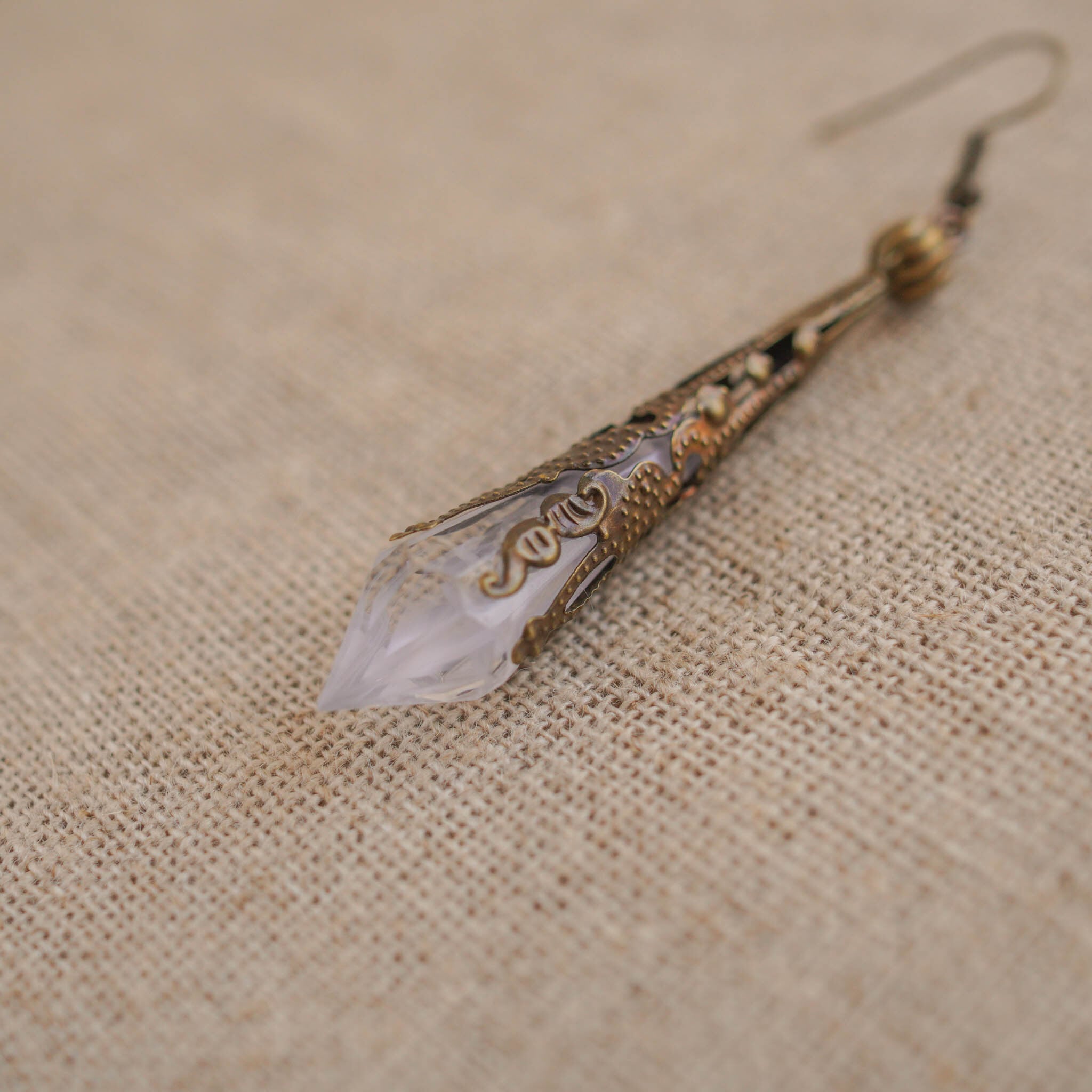 丁寧につくられたメタルのレースワークが繊細な美しさを添えるヴィンテージピアス。多面的にカットされたカラーガラスは、光を受けてその表情を変えながら優美にきらめき、耳もとで揺れ動く様子が魅力的です。クラシカルなシルエットにエッジの効いたデザインが絶妙なバランスで調和し、モードで華やかな印象を与えます。年末のパーティーシーズンにぴったりの存在感を放ち、秋冬のコーディネートを格上げするアイテムとしても活躍。一年を通じて様々なスタイルに溶け込み、コーディネートを一段と洗練されたものにしてくれるバーサタイルなピアスです。