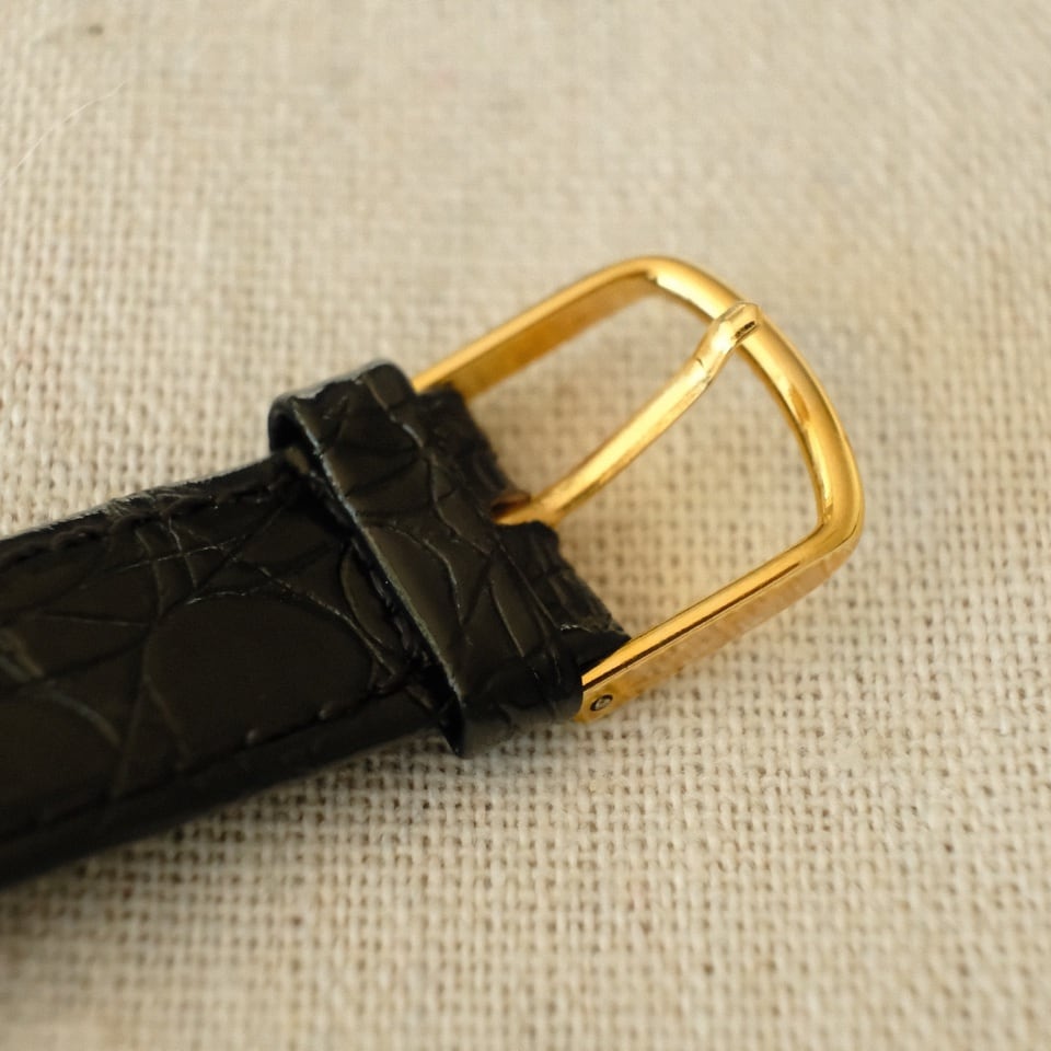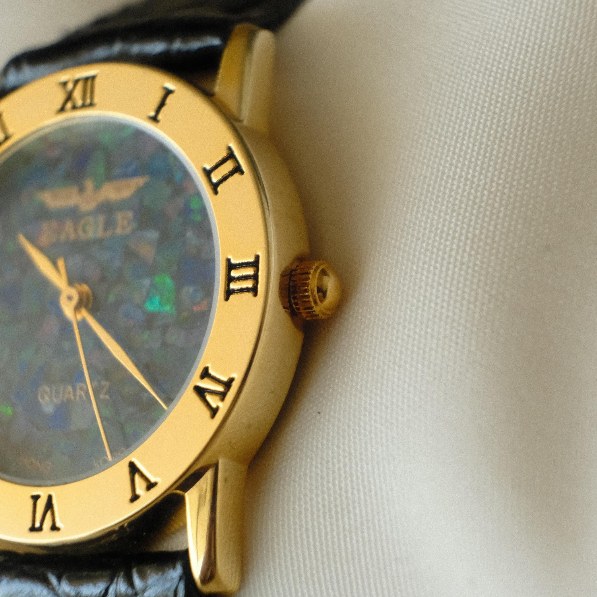 オパールモザイクフェイスが印象的なヴィンテージウォッチ。オパールのピースが作り出す美しいモザイクは、光の加減によって多彩な色合いを見せ、手もとに独特の輝きを与えます。ゴールドのフレームは、クラシックかつモードなデザインで、ヴィンテージ感あふれるエングレービングが施されたローマ数字が、エレガントで洗練された印象を引き立てます。