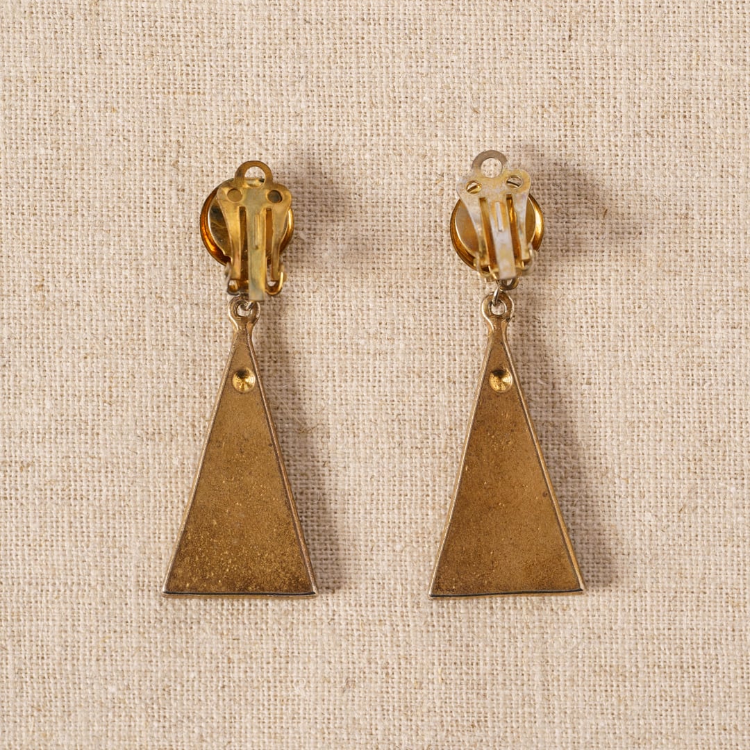 フランスならではのモードかつエレガントなデザインが魅力のヴィンテージイヤリング。トライアングルの幾何学的なフォルムに、オーロラトーンが美しいシェルモザイクを組み合わせた、洗練されたデザインが特徴です。光を受ける角度によって虹色のトーンが変化し、耳もとにさりげない華やかさと奥行きを与えます。