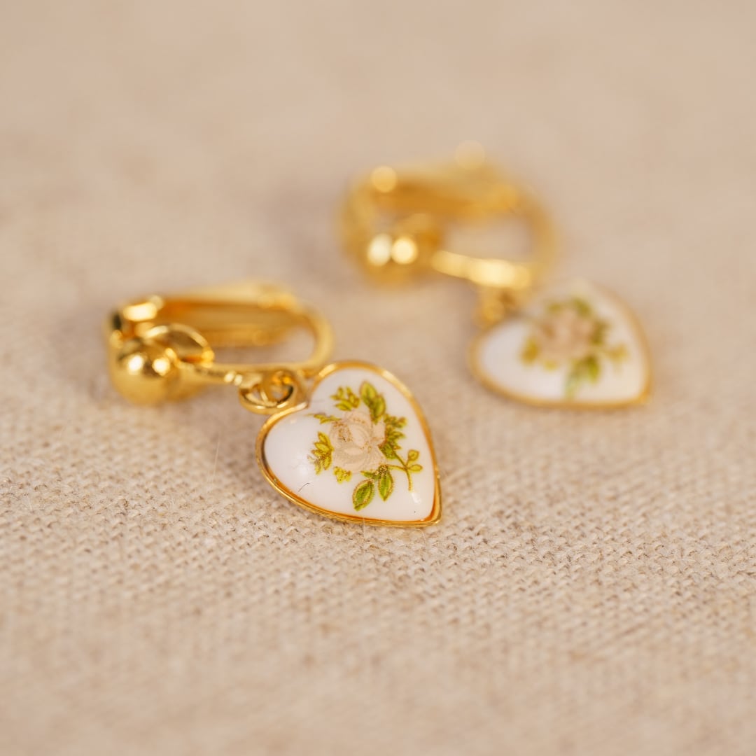 These vintage earrings feature heart-shaped ceramic charms, delicately hand-painted with a botanical design and encased in an elegant gold frame. The design reflects the timeless charm of British culture, celebrating a deep love for nature. With their gentle sway, these earrings add a graceful touch of movement to your look. Though petite, they boast just the right amount of presence, making them an elegant choice for any occasion. Perfectly versatile, they complement both casual and feminine outfits effortlessly.