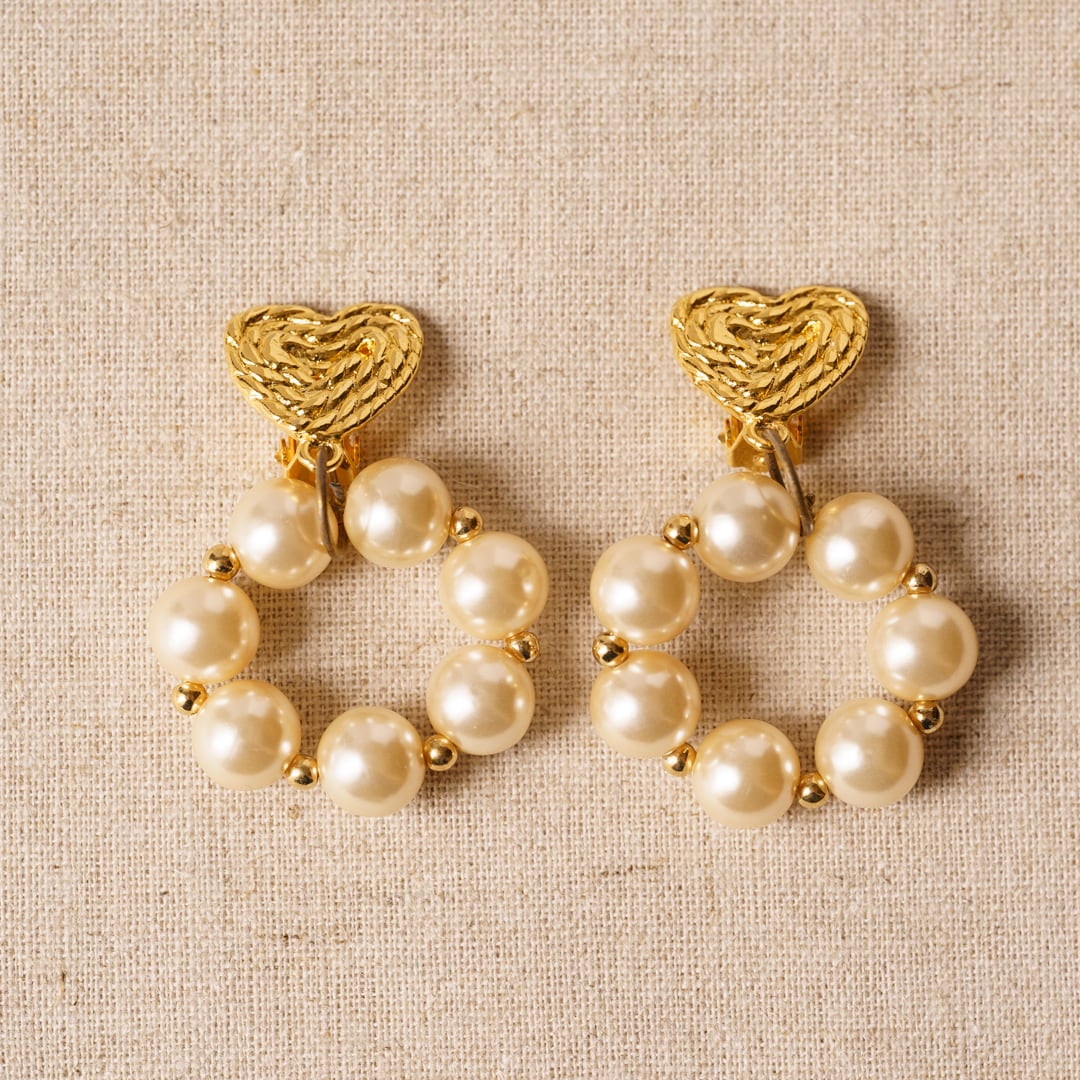 These vintage earrings beautifully combine French elegance with modern sophistication. The delicate gold heart motif adds a touch of sweetness, while the white-toned pearls exude a quiet radiance. Their graceful movement brings an air of elegance to every look, making them a striking yet understated accessory. This design perfectly balances urban sophistication with playful details.