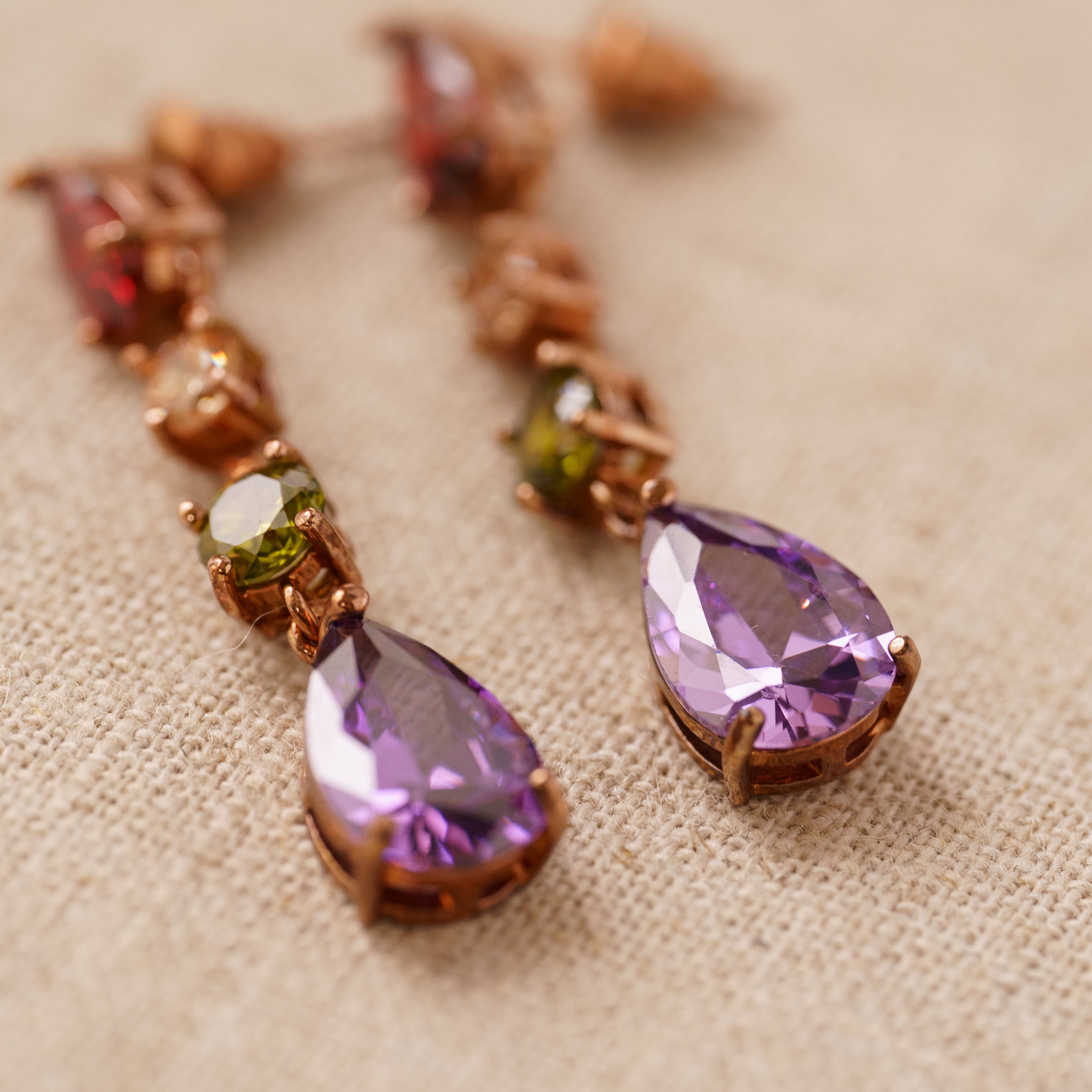 These vintage earrings, featuring a stunning arrangement of multicolored stones, are perfect for the holiday season. Crafted in rose gold, they exude a vintage-inspired weightiness and luxurious elegance. The vibrant sparkle of the colorful glass stones adds a sophisticated touch of brilliance to your face.