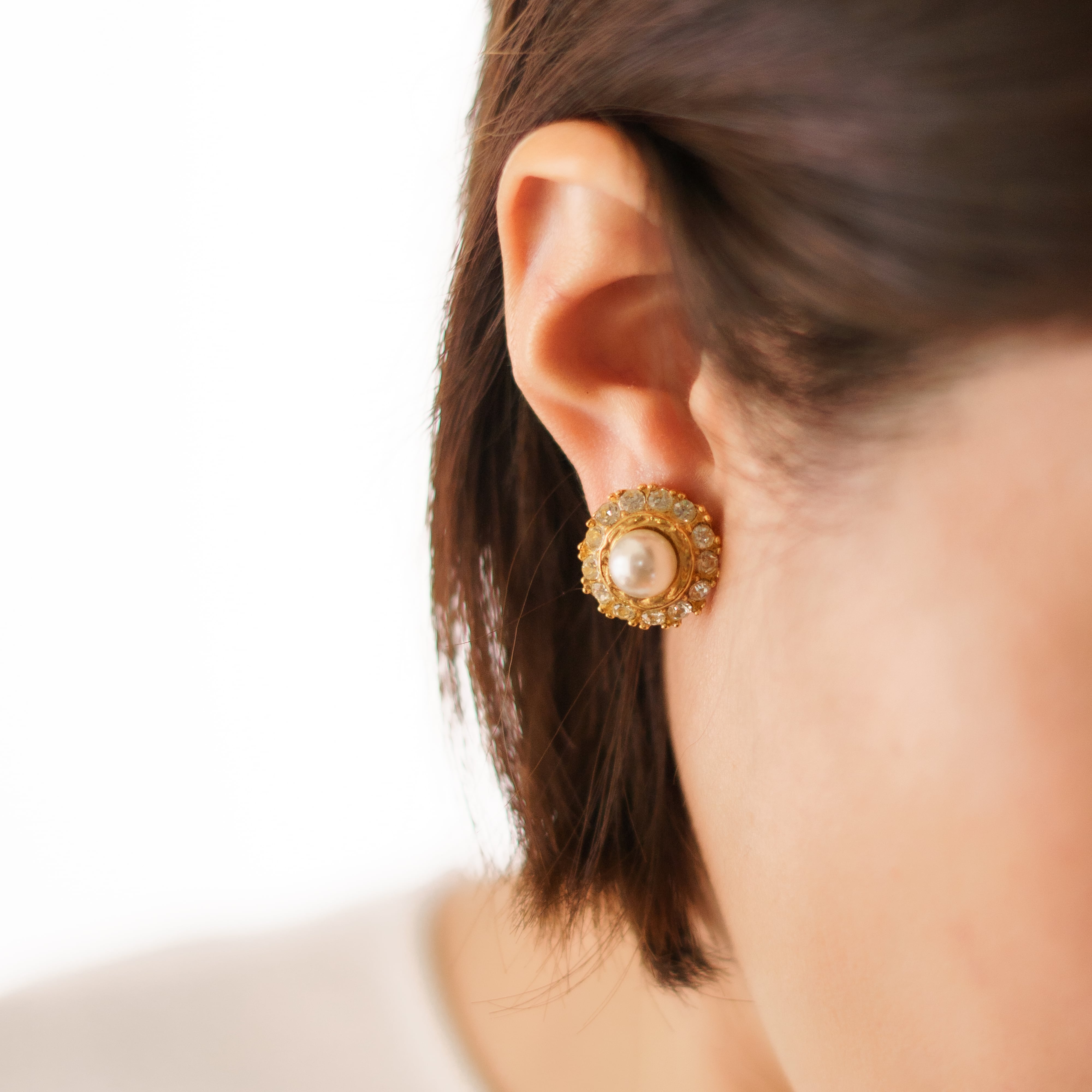 A timeless vintage design featuring a serene white pearl at the center, surrounded by sparkling rhinestones and pavé detailing. These earrings add a subtle touch of elegance and brilliance to your look, while the richness of vintage gold enhances their luxurious appeal. Perfectly sized, they blend seamlessly into a variety of outfits, making them versatile for both everyday wear and special occasions.