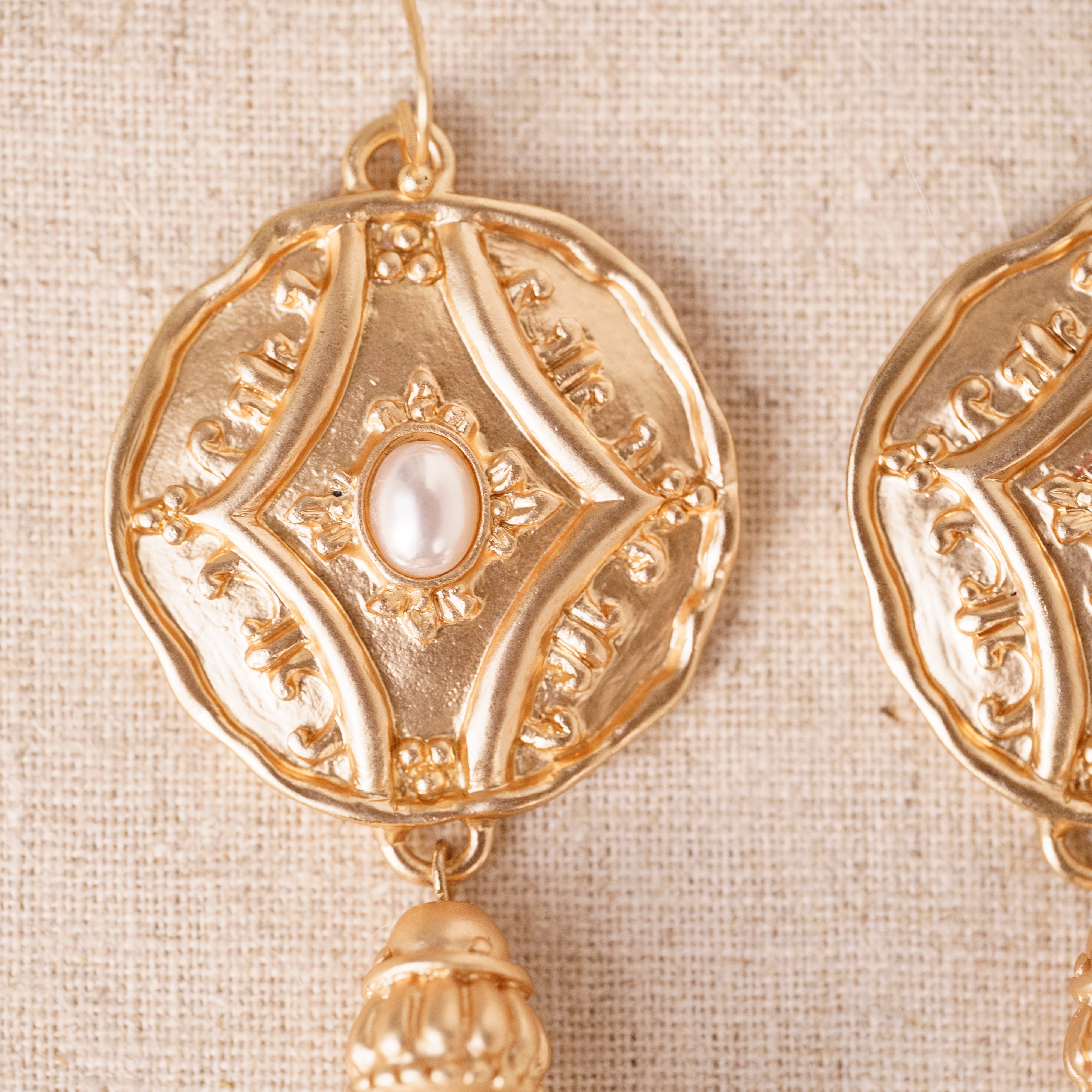 These vintage earrings exude a French-inspired bohemian charm. Featuring intricately crafted matte vintage gold with a timeless weight and a central costume pearl in a serene white tone, they effortlessly brighten the face. The elegant yet bold design captures refined movement as the earrings sway, adding a touch of sophistication to every gesture.